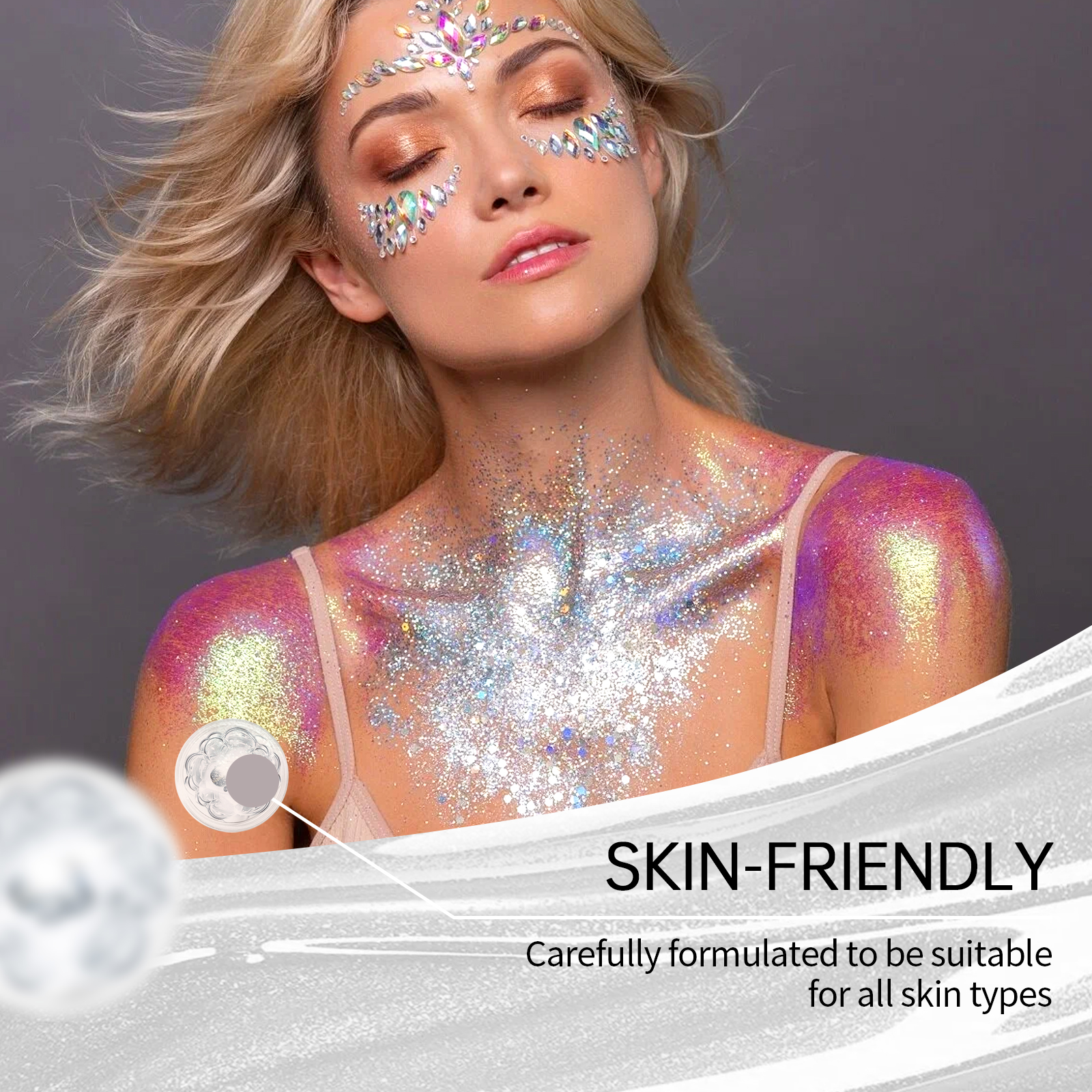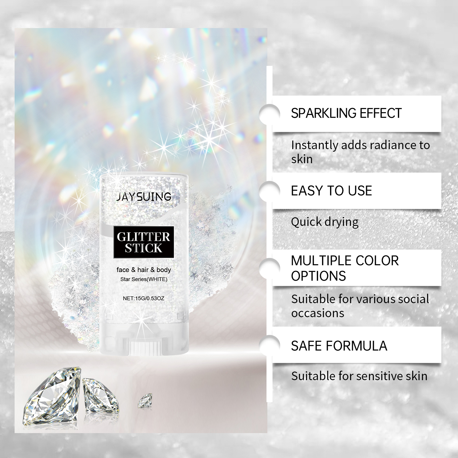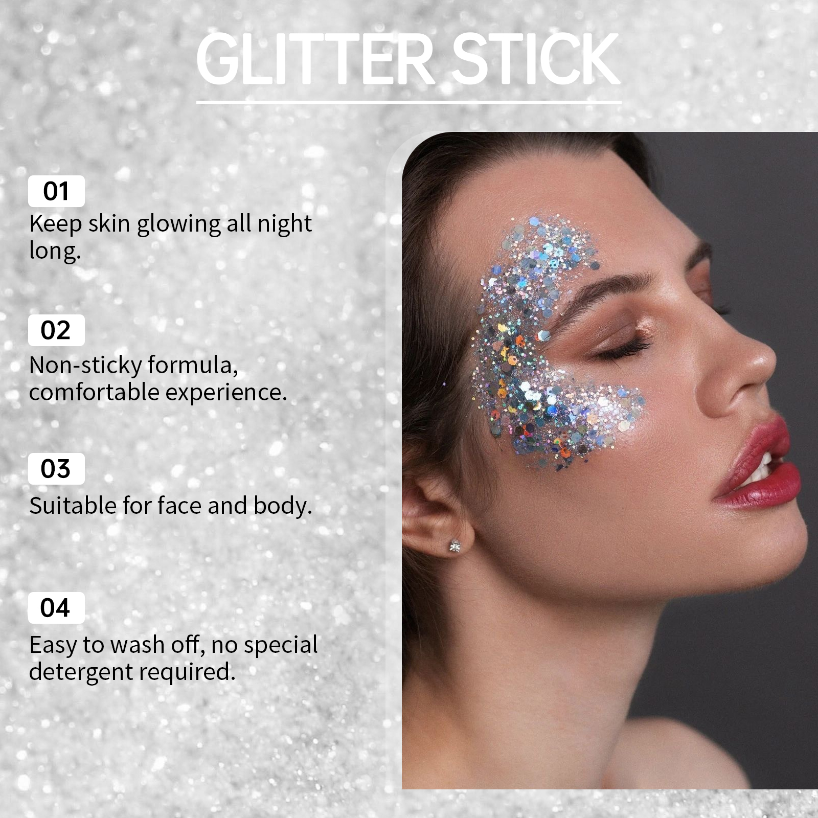 我们的亮片闪光棒(炫白),由甘油、卡波姆、云母精心调配而成。专为增加皮肤光泽,让亮片长时间保持闪亮和迷人设计。使用方法极为便捷:1.打开盖子,旋转顶部旋钮,拧开膏体;2.将亮片棒直接均匀涂抹在身体、头发、脸部,包括眼周皮肤等你想要装饰的部位。并且加入闪亮的云母,瞬间提升你的个人魅力;适合各种社交场合,适合敏感肌肤。