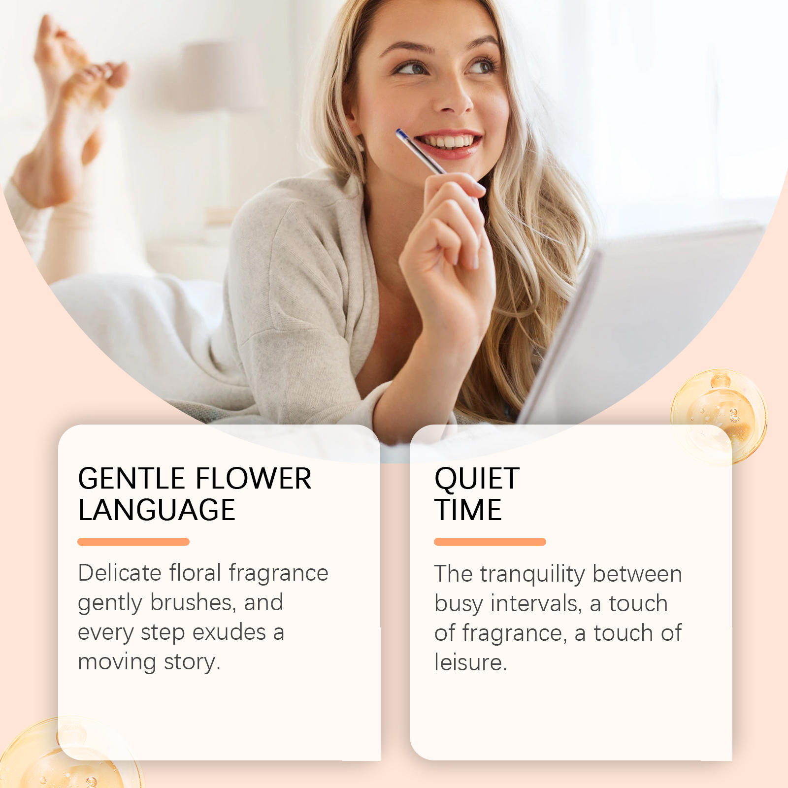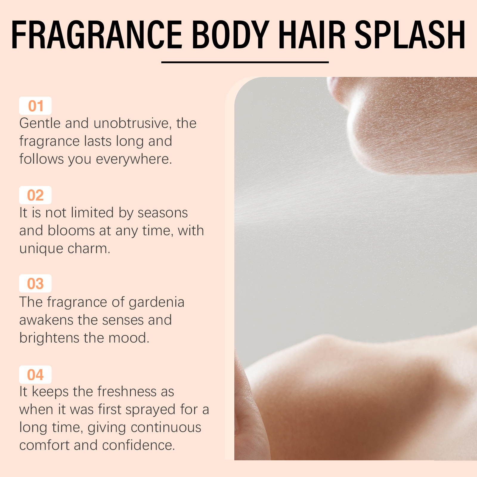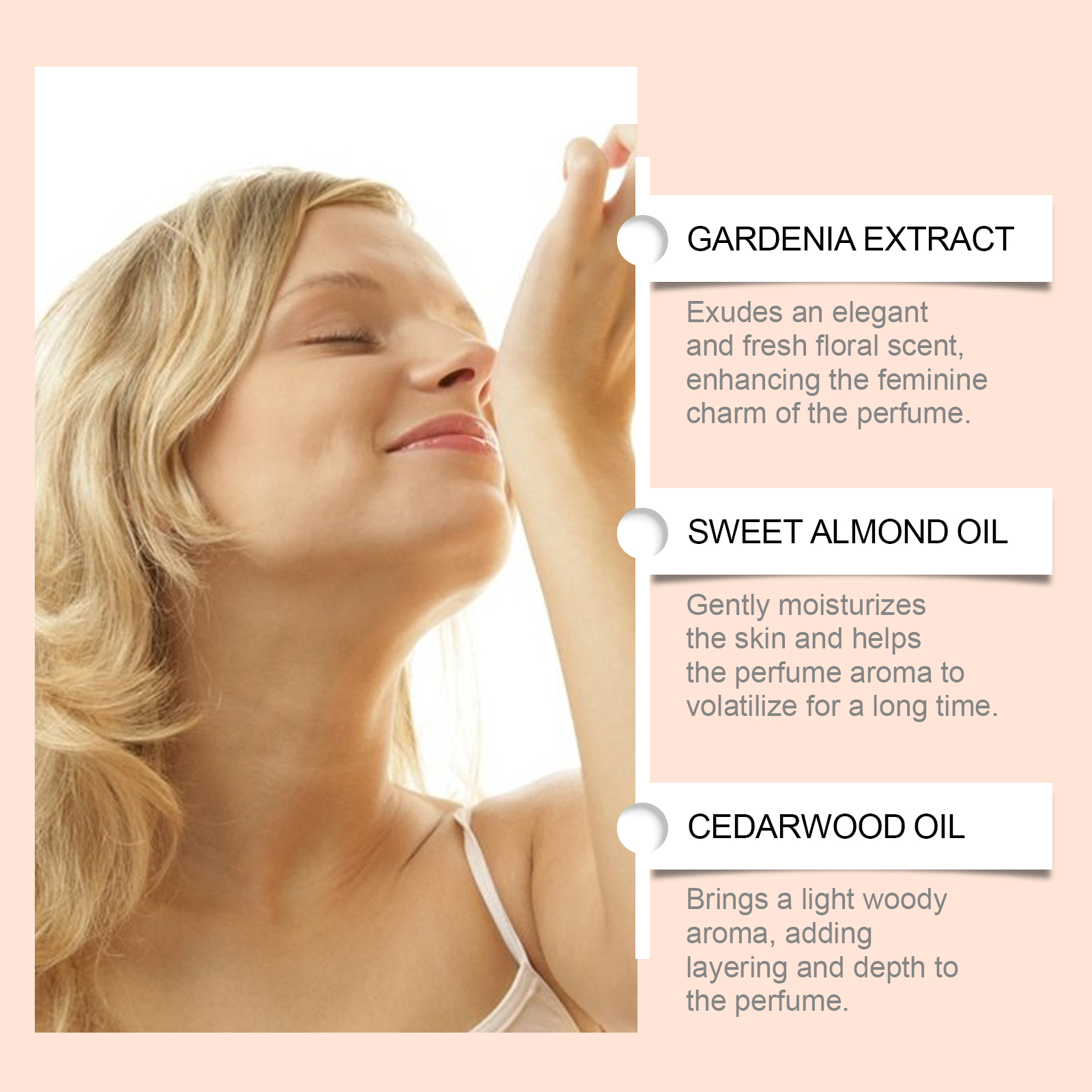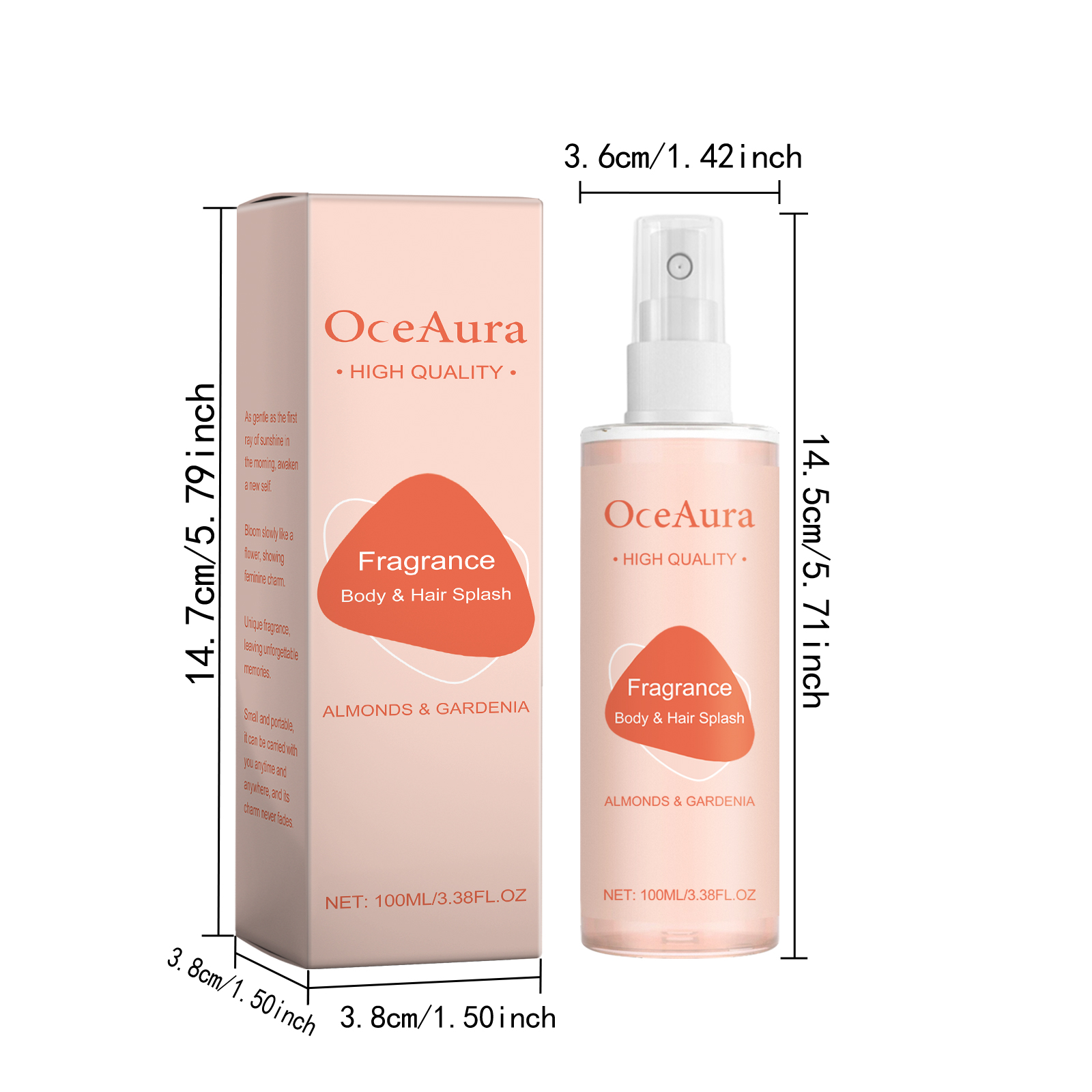 我们的女性香水喷雾,由栀子花提取物、甜杏仁油、雪松木油精心调配而成。专为散发出优雅清新的花香设计。使用方法极为便捷:1.打开瓶盖;2.按下喷嘴,将香水喷在脖子、手腕或身体的其他部位。精致的花香拂过,每一步都散发着动人的故事。忙碌间隔间的宁静,一抹清香,一抹闲适。