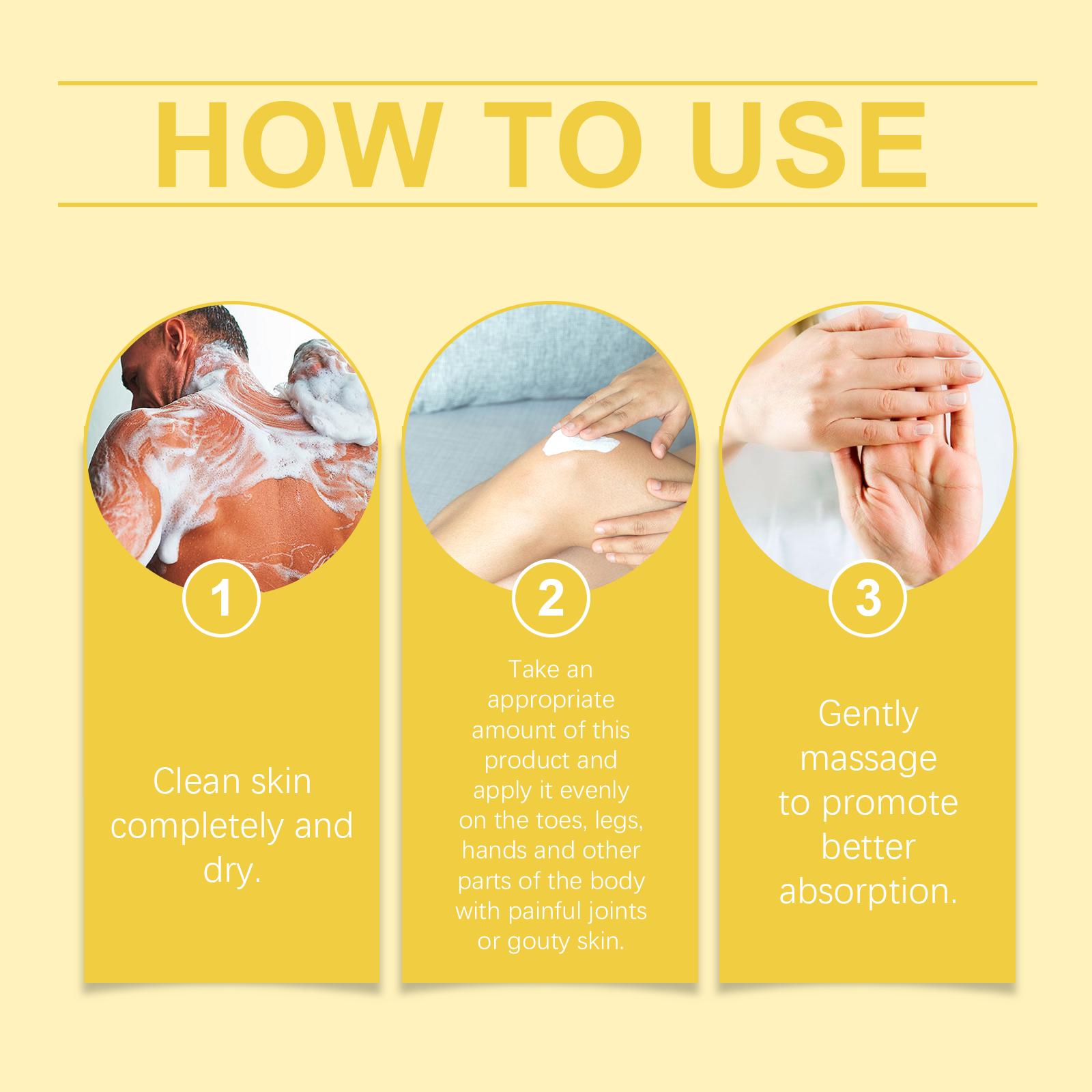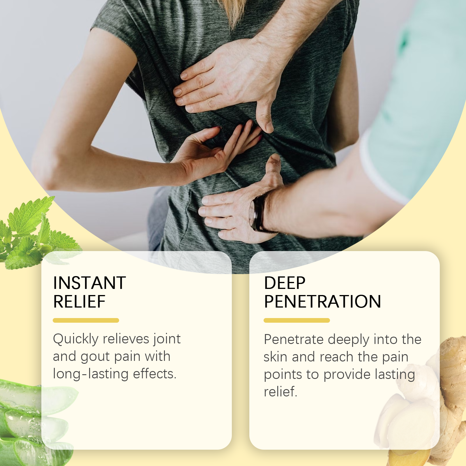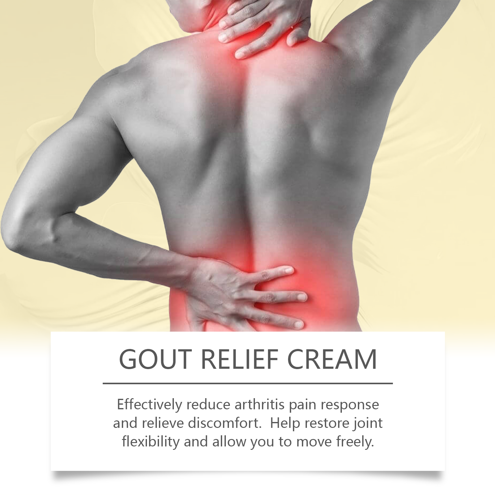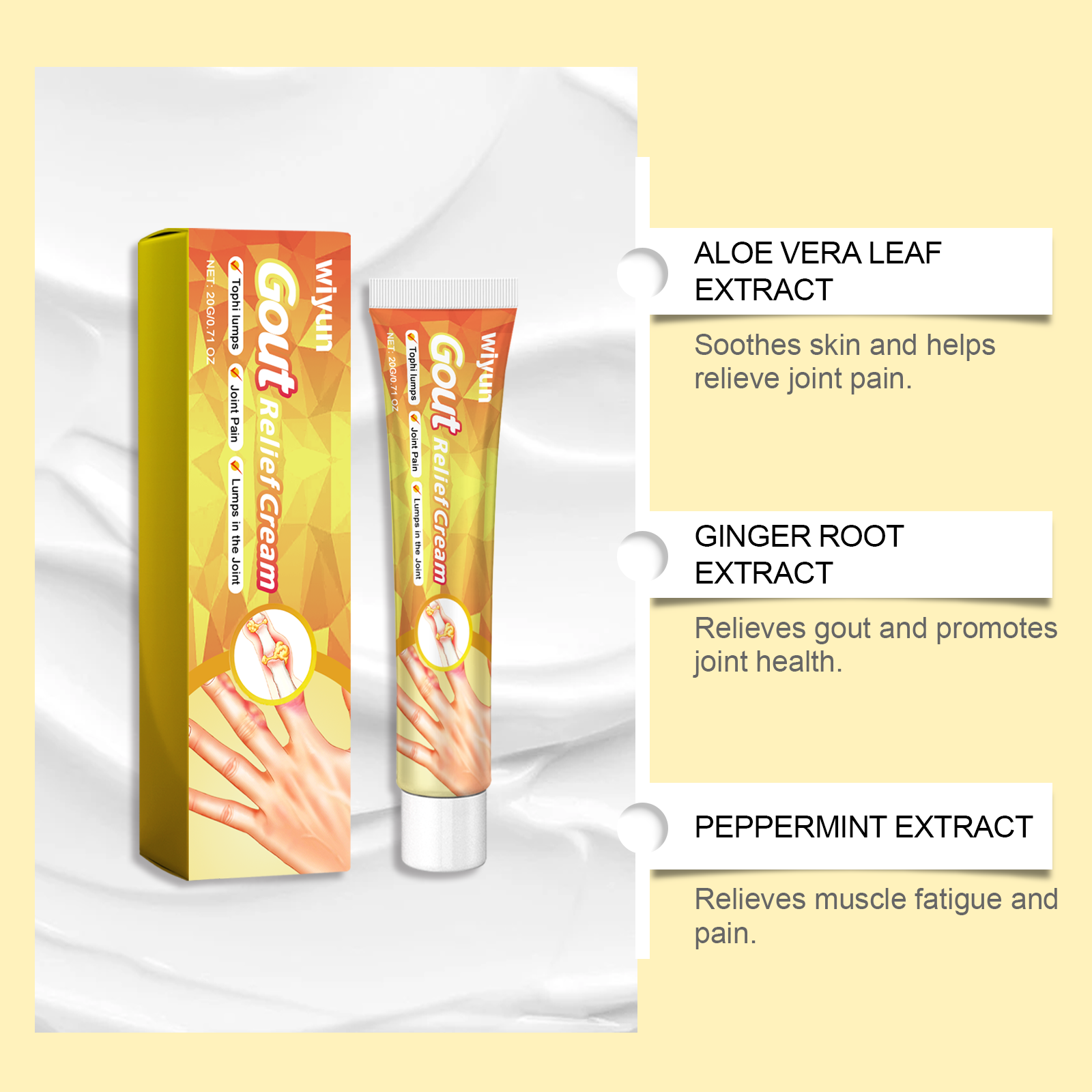 我们的关节舒适护理膏,由芦荟叶提取物、生姜根提取物、薄荷提取物精心调配而成。专为快速缓解关节和痛风疼痛设计。使用方法极为便捷:1.彻底清洁皮肤并擦干。2.取适量本品均匀涂抹于脚趾、腿部及其他关节疼痛或皮肤痛风的部位。3.轻轻按摩,以促进更好的吸收。并且可以帮助恢复关节灵活性,让你自由活动。