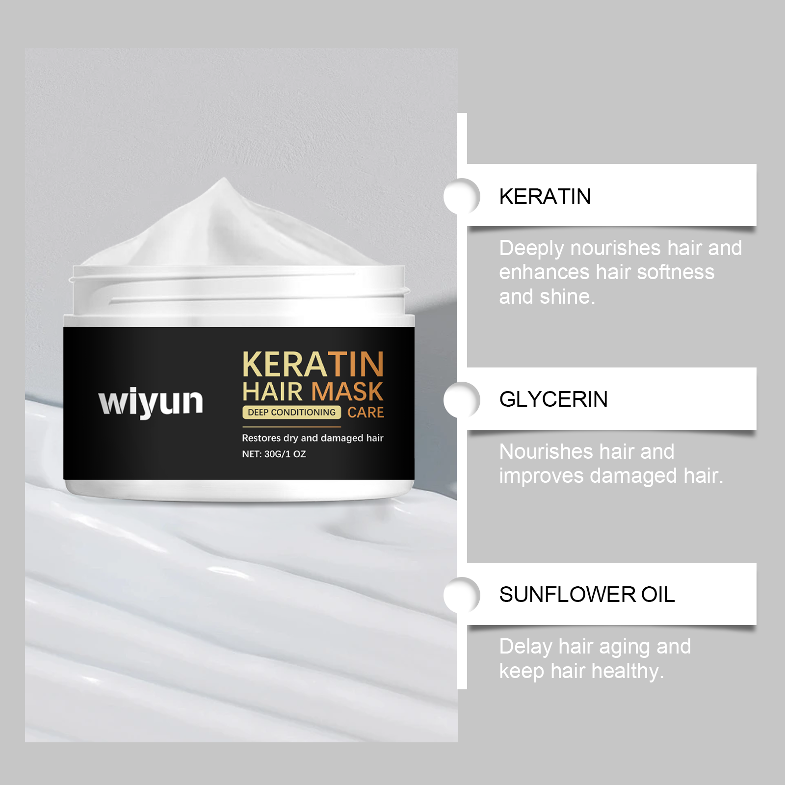 我们的滋润护发膜含有薄荷叶提取物、角蛋白。它可以提供头发所需的核心营养素,显著增强头发韧性,减少头发断裂和断端。它的使用方法很简单:湿发后,取适量本品均匀涂抹于头发上,让它静置8-10分钟,然后轻轻按摩头发,使其充分吸收,用温水冲洗干净。并且可以深层滋养和修复受损的头发。