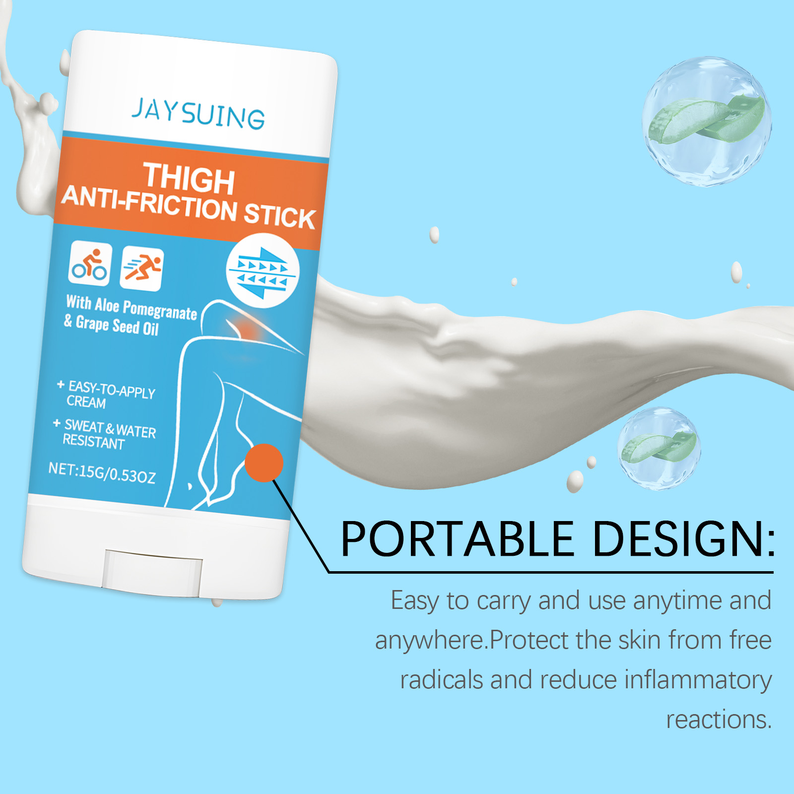 我们的皮肤防摩擦膏霜棒,由芦荟提取物、石榴提取物、葡萄籽油精心调配而成。专为有效减少摩擦,保护皮肤免受摩擦损伤设计。使用方法极为便捷:1.清洁皮肤并保持干燥。2.打开防摩擦膏霜,将其直接涂抹在皮肤经常相互摩擦的部位,比如大腿根部、脚跟、膝盖或腋窝。并且精选天然成分,温和无刺激。在皮肤表面形成保护膜,有效抵抗汗水和水分的侵蚀。