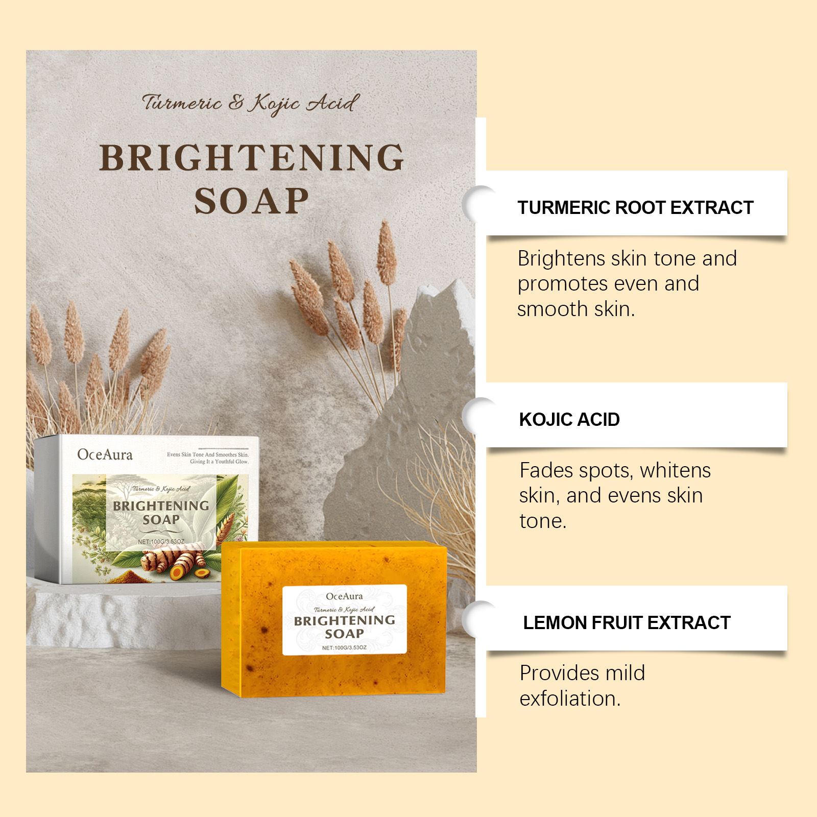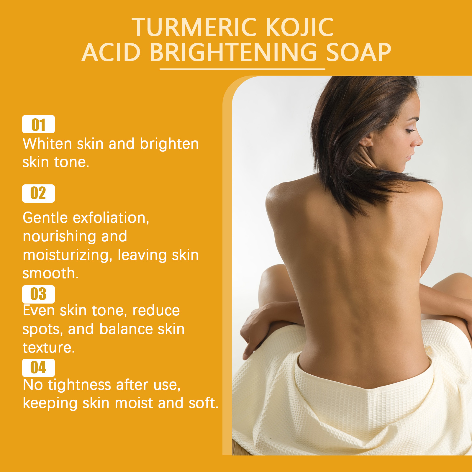 我们的沐浴皂含有曲酸、柠檬果提取物。它可以有效减少色斑和暗沉改善不均匀的肤色,令肌肤更加均匀。它的使用方法很简单:将此产品揉搓至湿润的手掌上,直至形成丰富的泡沫,将泡沫涂抹在身体皮肤上,轻轻按摩,帮助清洁皮肤,最后,用清水洗干净。并且可以去除陈日死皮细胞,促进新生肌肤,无紧绷感。