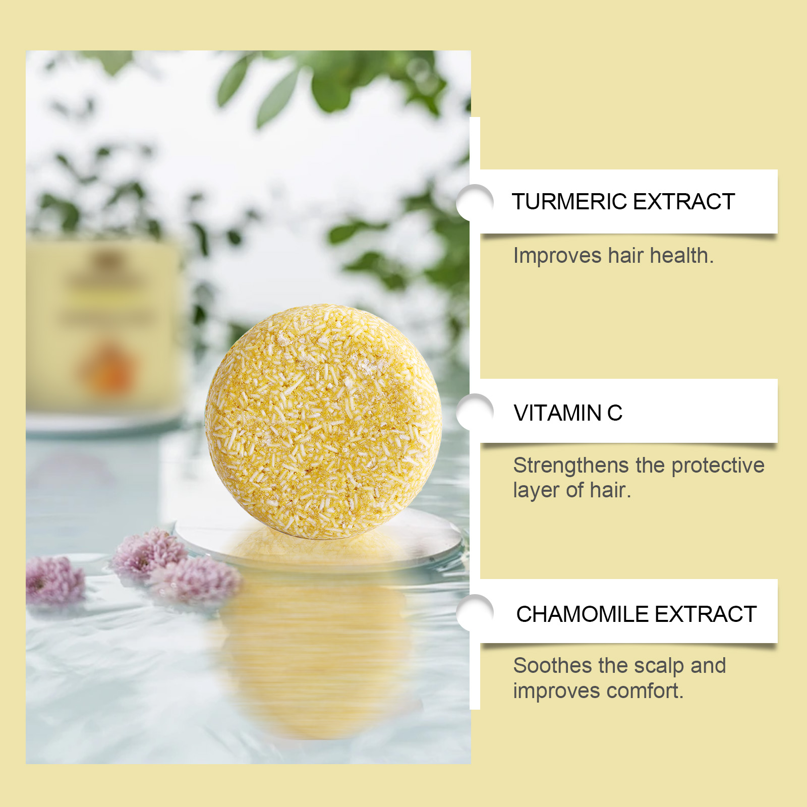 我们的生姜洗发皂含有姜黄根提取物、抗坏血酸(维生素C)、母菊花提取物。它可以使头发有光泽,为头发提供必需的营养。彻底清洁头皮油。它的使用方法很简单:1. 滋润头发;2. 将本品放在手掌上,轻轻揉搓成泡沫;3. 将泡沫涂抹在头皮和头发上,然后清洁头发;4. 用清水冲洗泡沫。改善头发健康。加强头发的保护层。舒缓头皮,提高舒适度。