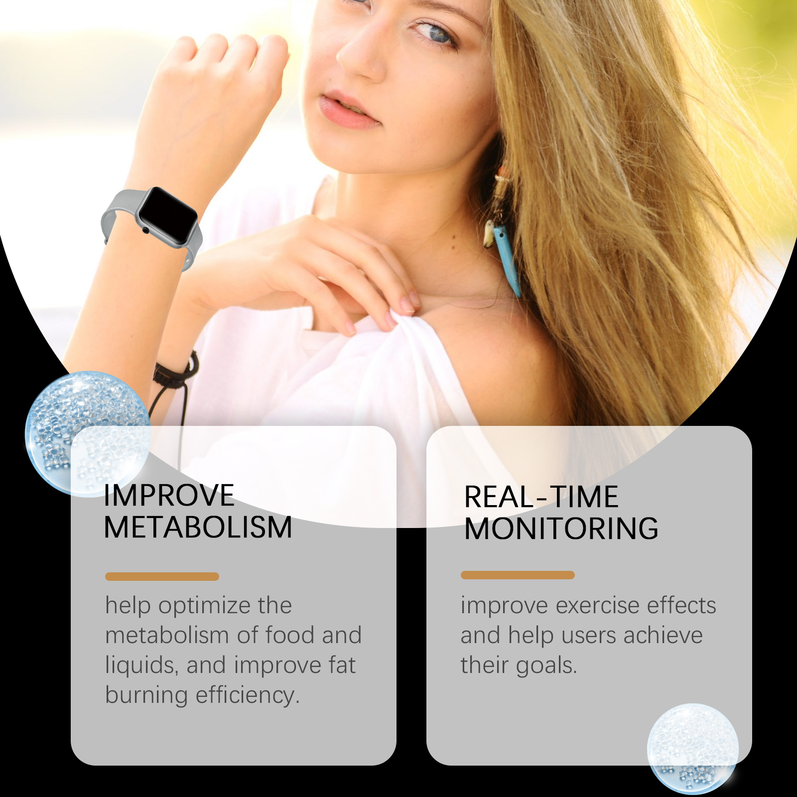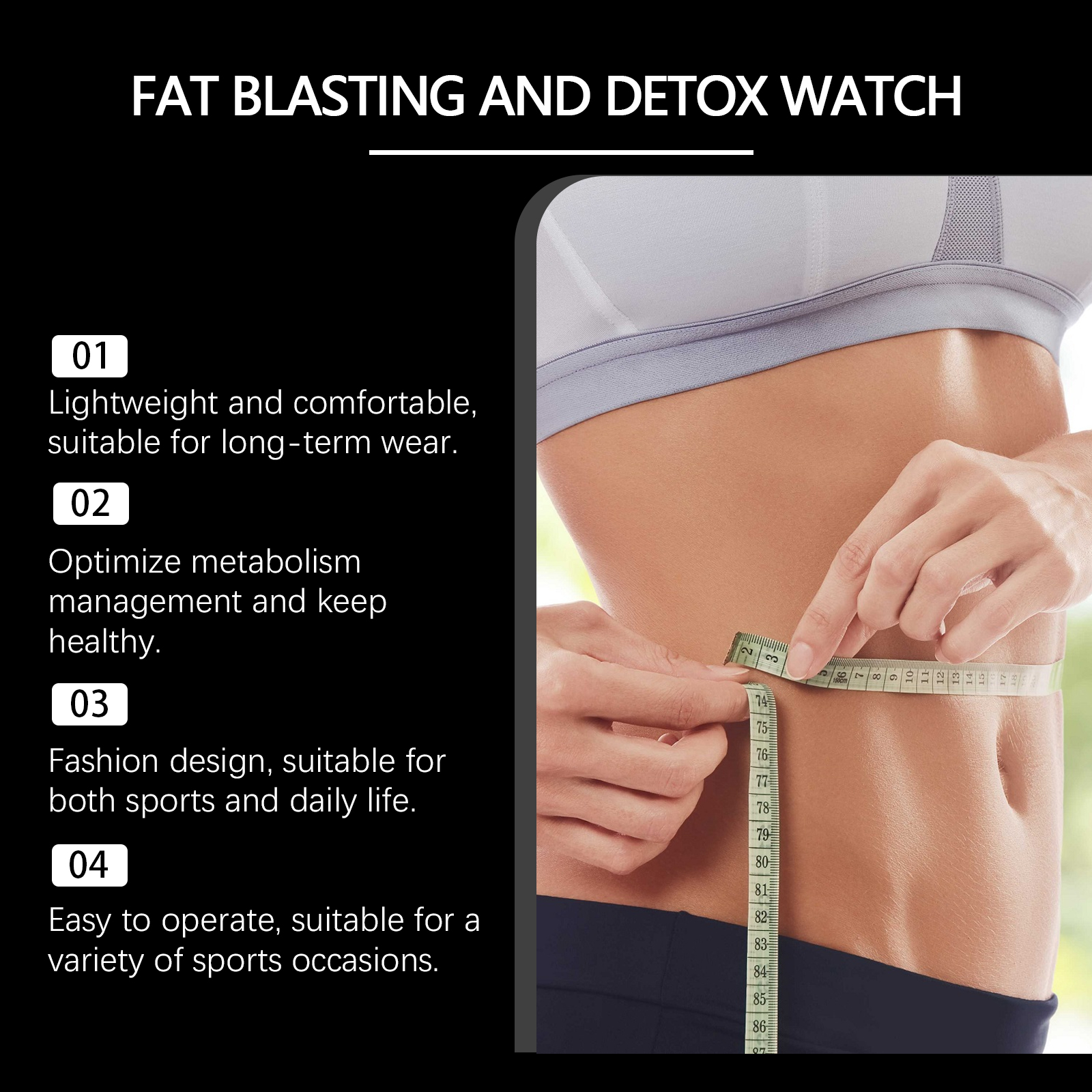 我们的运动手表含有软胶,塑料。它可以帮助优化食物和液体的新陈代谢,提高脂肪燃烧效率。提高运动效果,帮助使用者达到目标。它的使用方法很简单:只需将本产品直接戴在手腕上即可。有助于促进新陈代谢,防止糖的过度吸收,提高运动效果,达到目标。