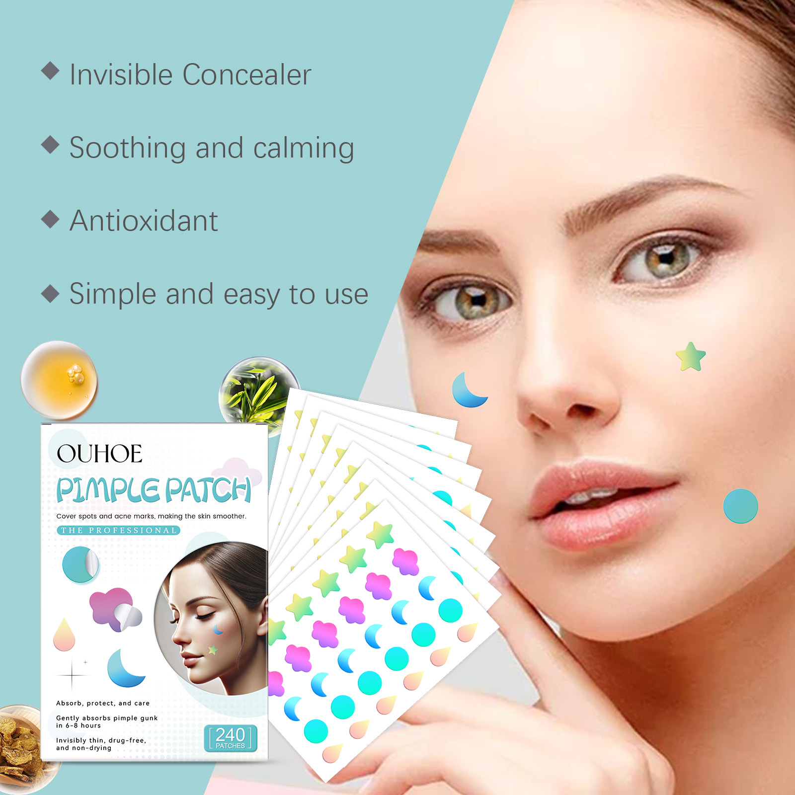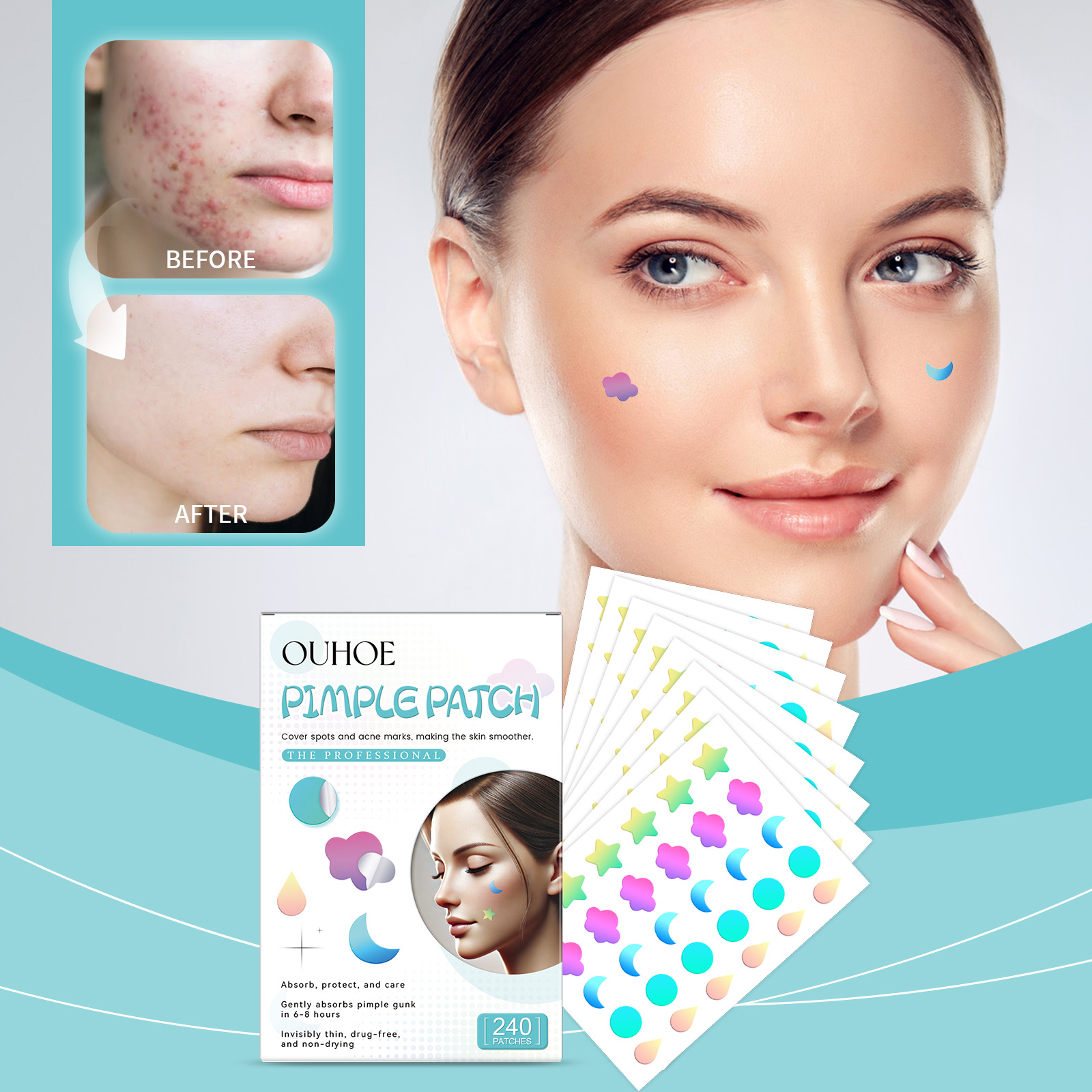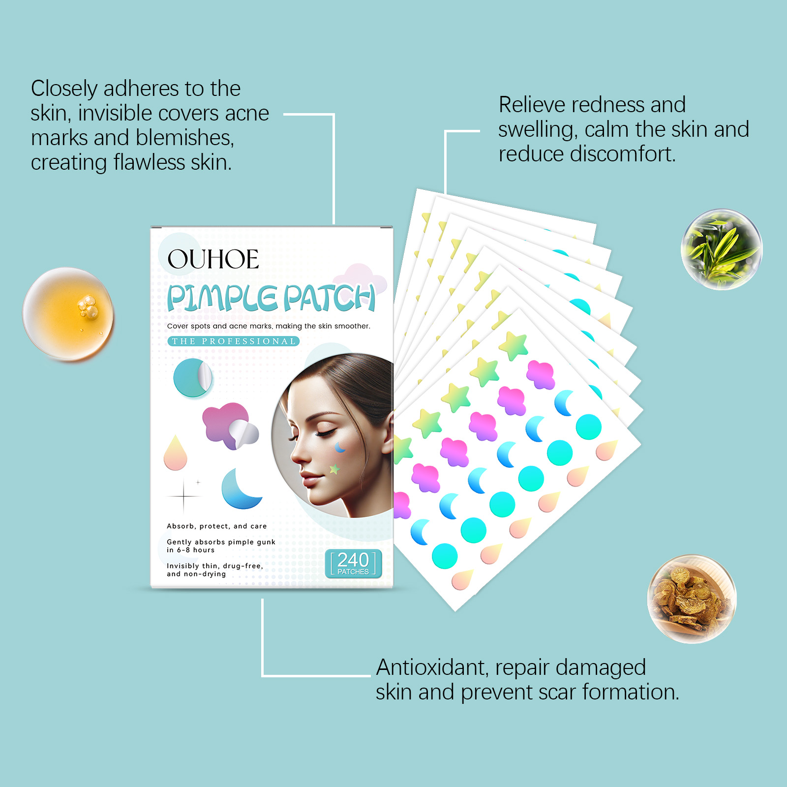 我们的多色瑕疵痘痘贴含有甘油、羟乙基纤维素。它可以紧贴肌肤,形成保护层,舒缓肌肤,持续发挥功效,保持肌肤舒适。它的使用方法很简单:清洁和干燥痤疮区域的皮肤,拿一块贴片贴在痘痘上,等待6-8小时后才能揭开。并且可以贴合肌肤,直接作用于粉刺,加速粉刺的成熟和消退,减少疤痕的形成。