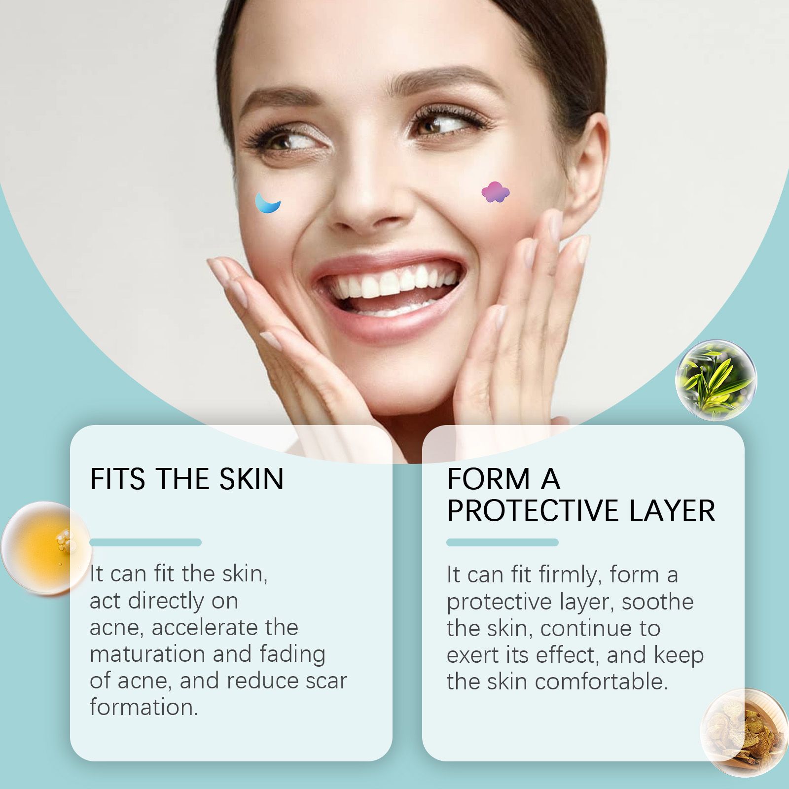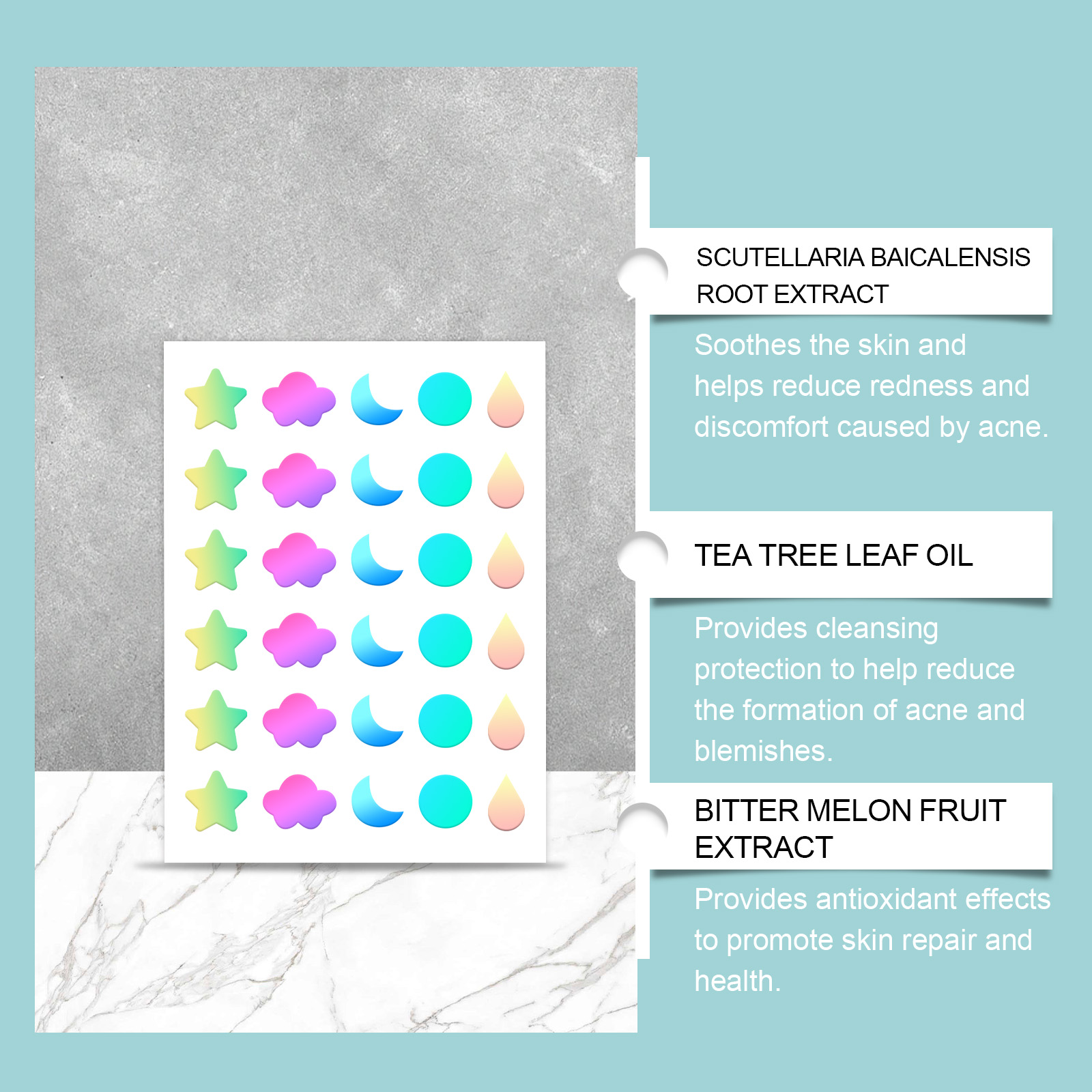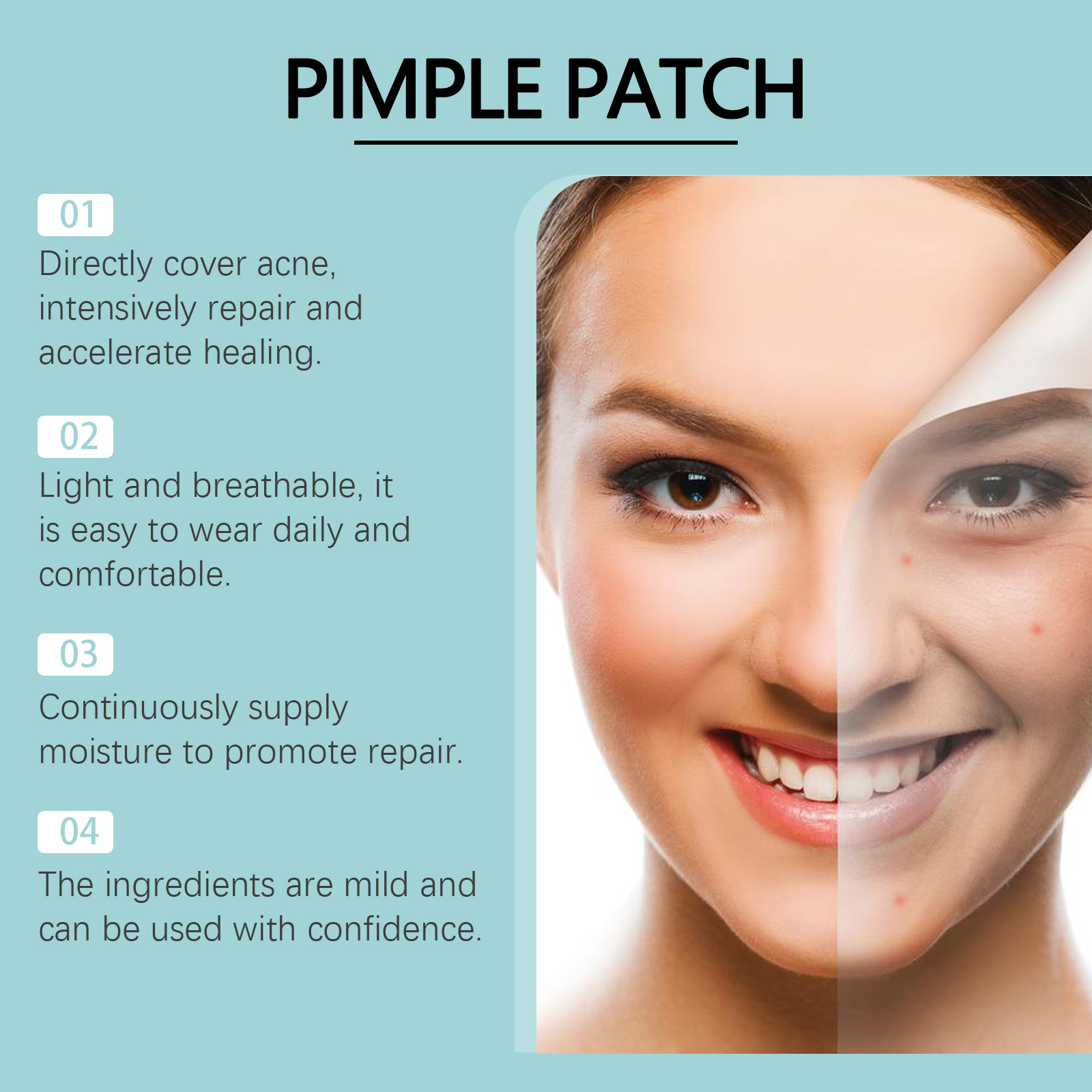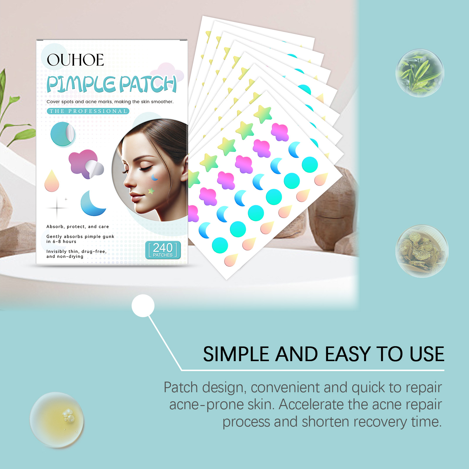 我们的多色瑕疵痘痘贴含有甘油、羟乙基纤维素。它可以紧贴肌肤,形成保护层,舒缓肌肤,持续发挥功效,保持肌肤舒适。它的使用方法很简单:清洁和干燥痤疮区域的皮肤,拿一块贴片贴在痘痘上,等待6-8小时后才能揭开。并且可以贴合肌肤,直接作用于粉刺,加速粉刺的成熟和消退,减少疤痕的形成。