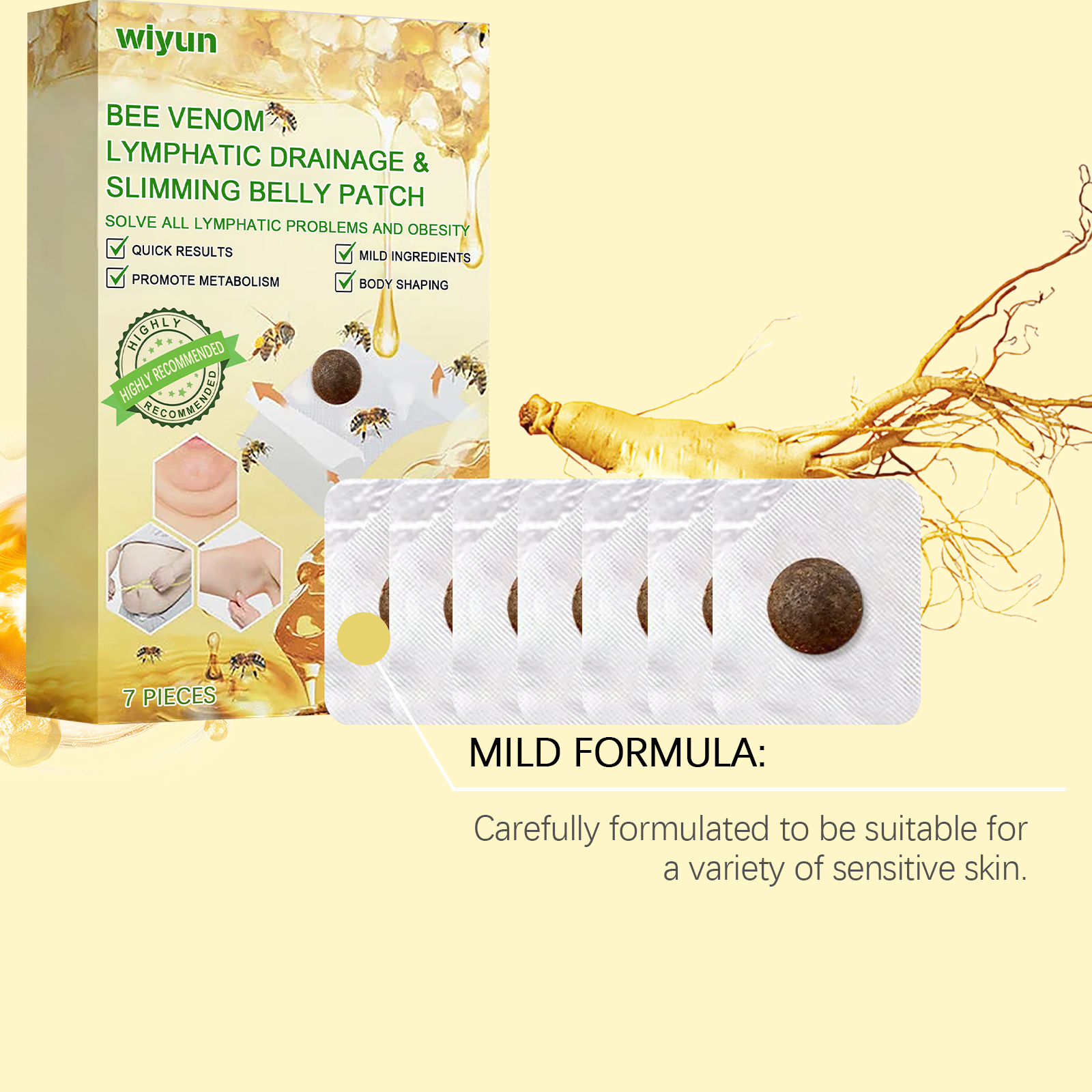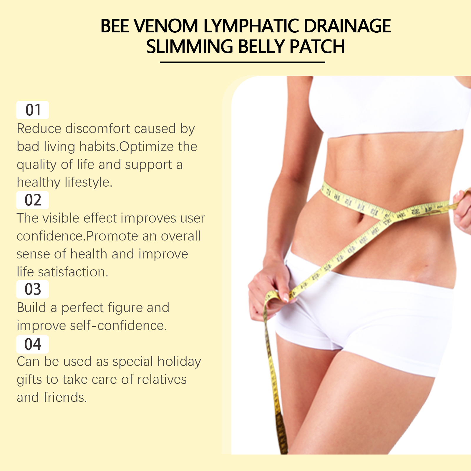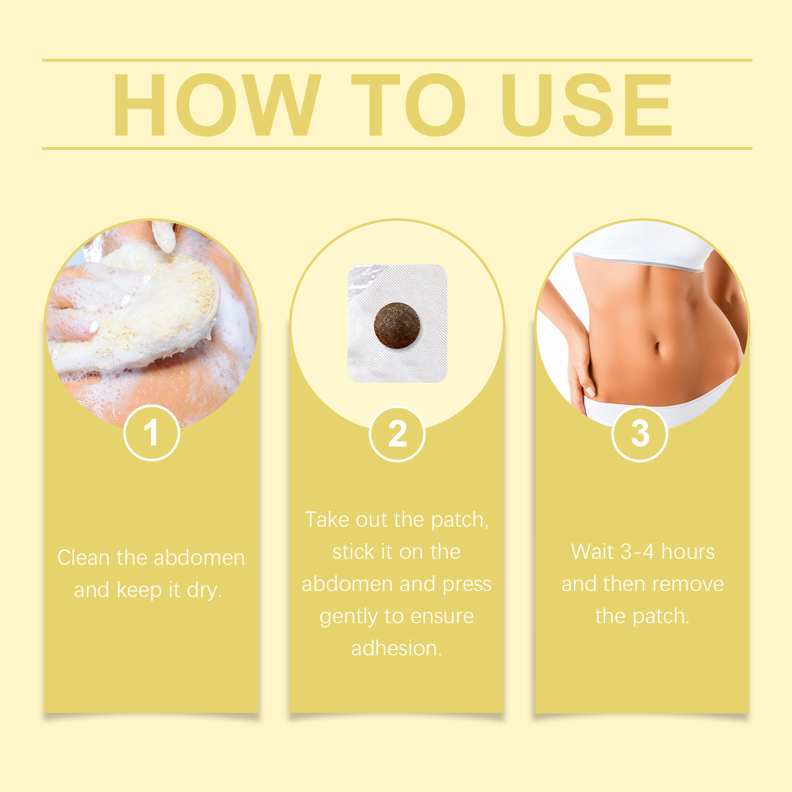我们的身体护理贴片含有人参提取物、鹿茸提取物。它可以有效加速身体新陈代谢。它的使用方法很简单:清洗腹部,保持腹部干燥,取出贴片,贴在腹部,轻轻按压,确保粘连,等待3-4小时,然后去除贴片。并且可以持续释放技术确保了持久的效果。