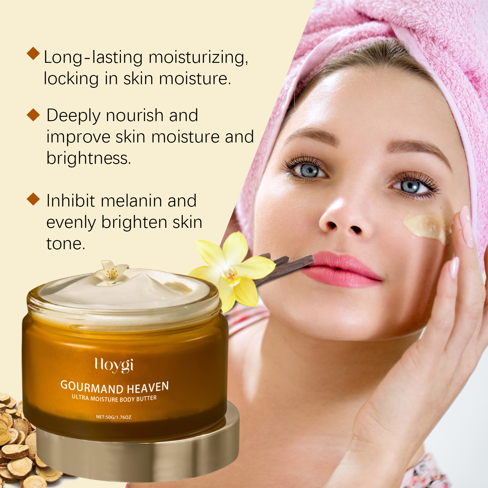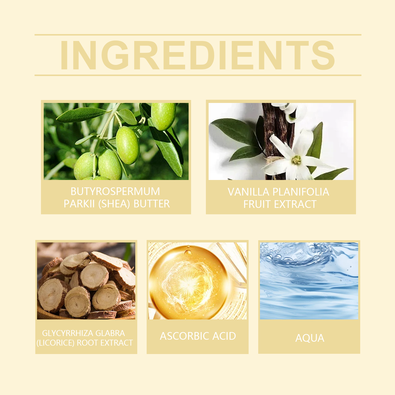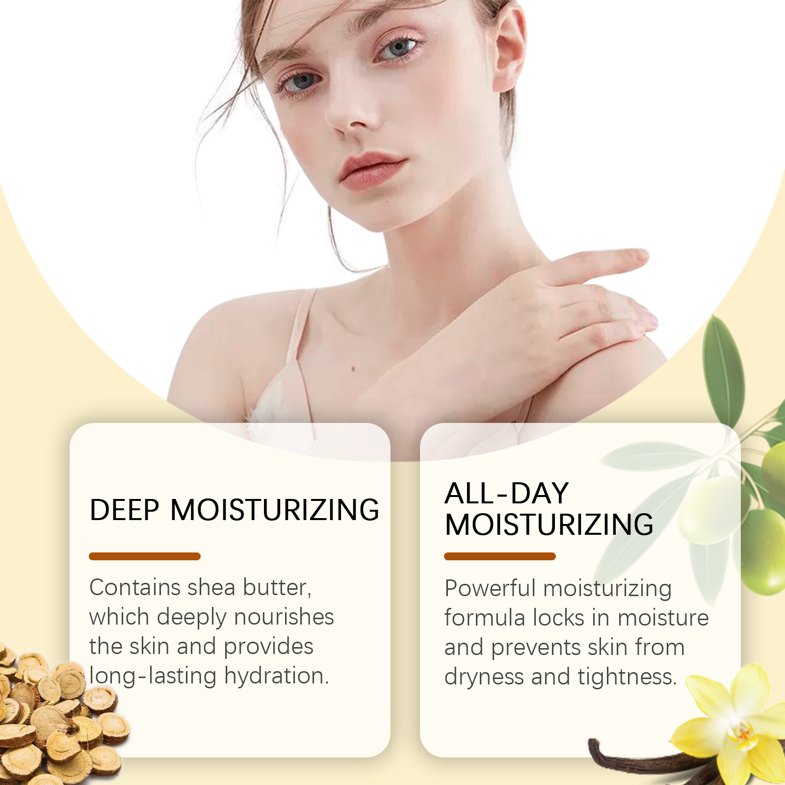 我们的香草身体润肤霜含有香草提取物、甘草根提取物、乳木果油。它可以深层滋养肌肤,持久补水。强大的保湿配方锁住水分,防止皮肤干燥和紧绷。它的使用方法很简单:1.彻底清洁和干燥皮肤;2.取适量本品均匀涂抹于手部、腿部等身体皮肤;3.轻轻按摩以促进完全吸收。滋养配方,温和无刺激,适合所有肤质,敏感肌肤也能放心使用。