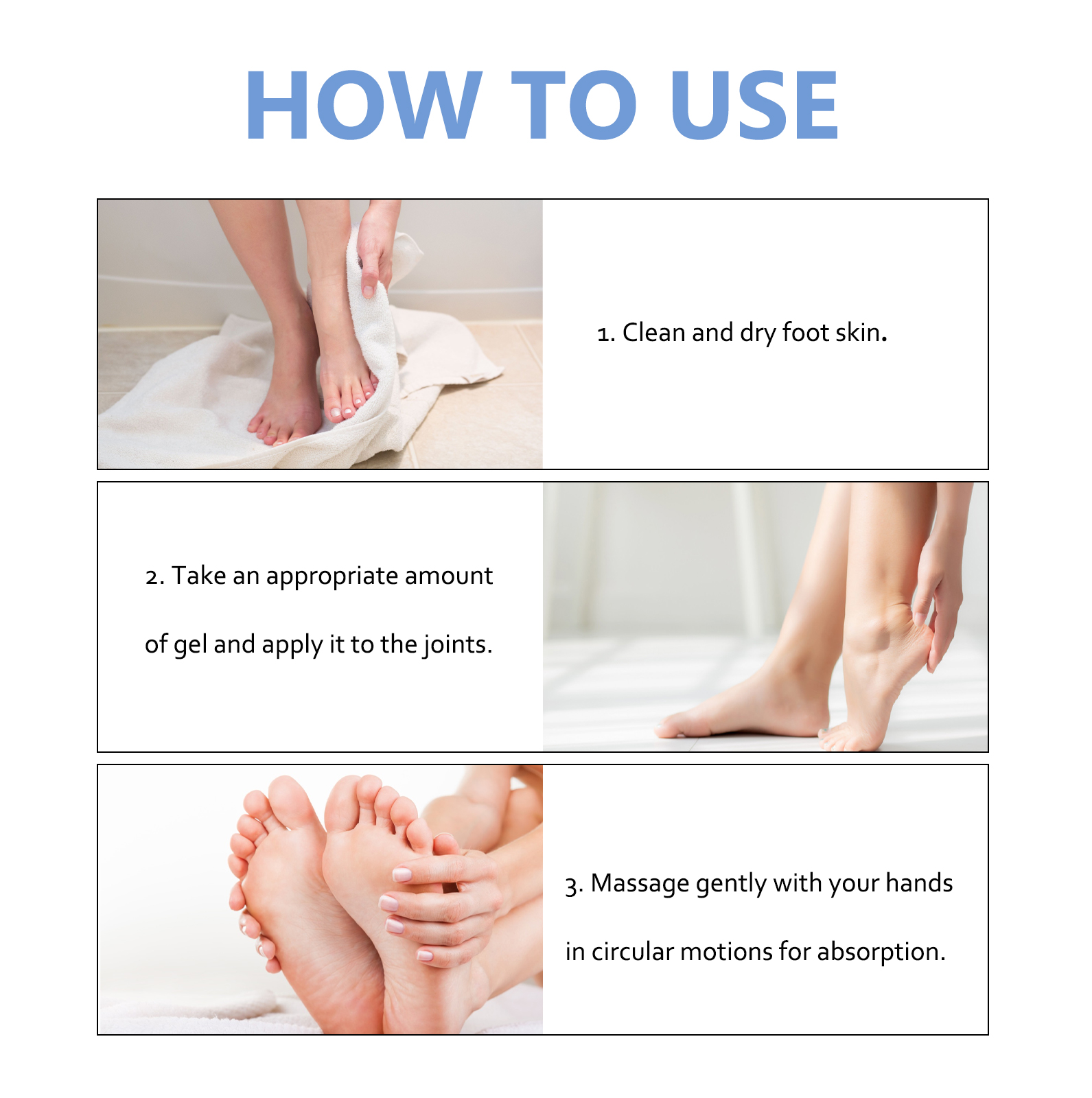 我们的艾草关节护理凝胶含有艾草提取物、生姜提取物、甘草提取物。它可以迅速深入皮肤表面,直接到达关节,迅速缓解,恢复关节的柔韧性。它的使用方法很简单:1.清洁和干燥足部皮肤。2.取适量凝胶,涂于关节处。3.用手轻轻作圆形按摩,以吸收。并且采用科学的配方,溶解尿酸结晶,促进关节健康。