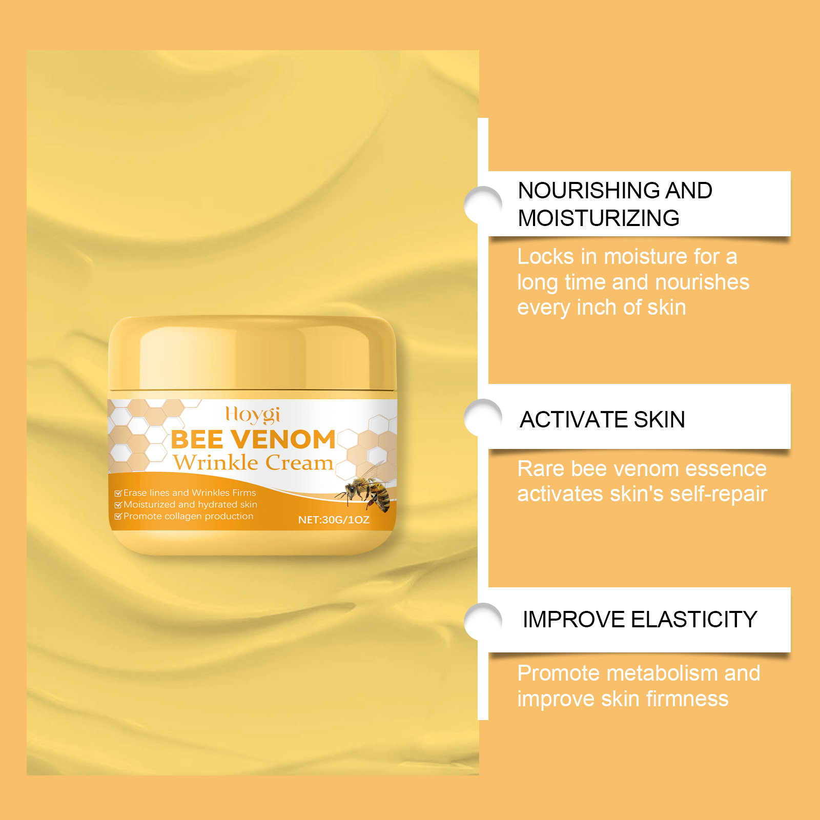 我们的蜂毒抗皱保湿霜含有三乙醇胺、蜂毒、咖啡提取物。它可以重塑面部线条,让肌肤更有弹性。它的使用方法很简单:清洁干燥的面部肌肤,取适量本品均匀涂抹于面部,轻轻按摩至吸收。并且可以滋润面部,滋养皮肤。