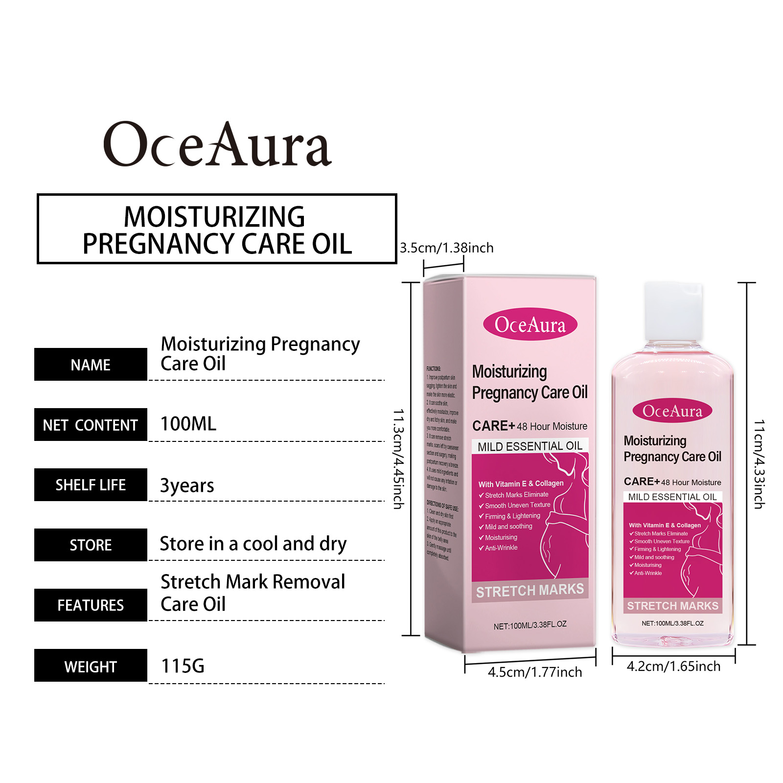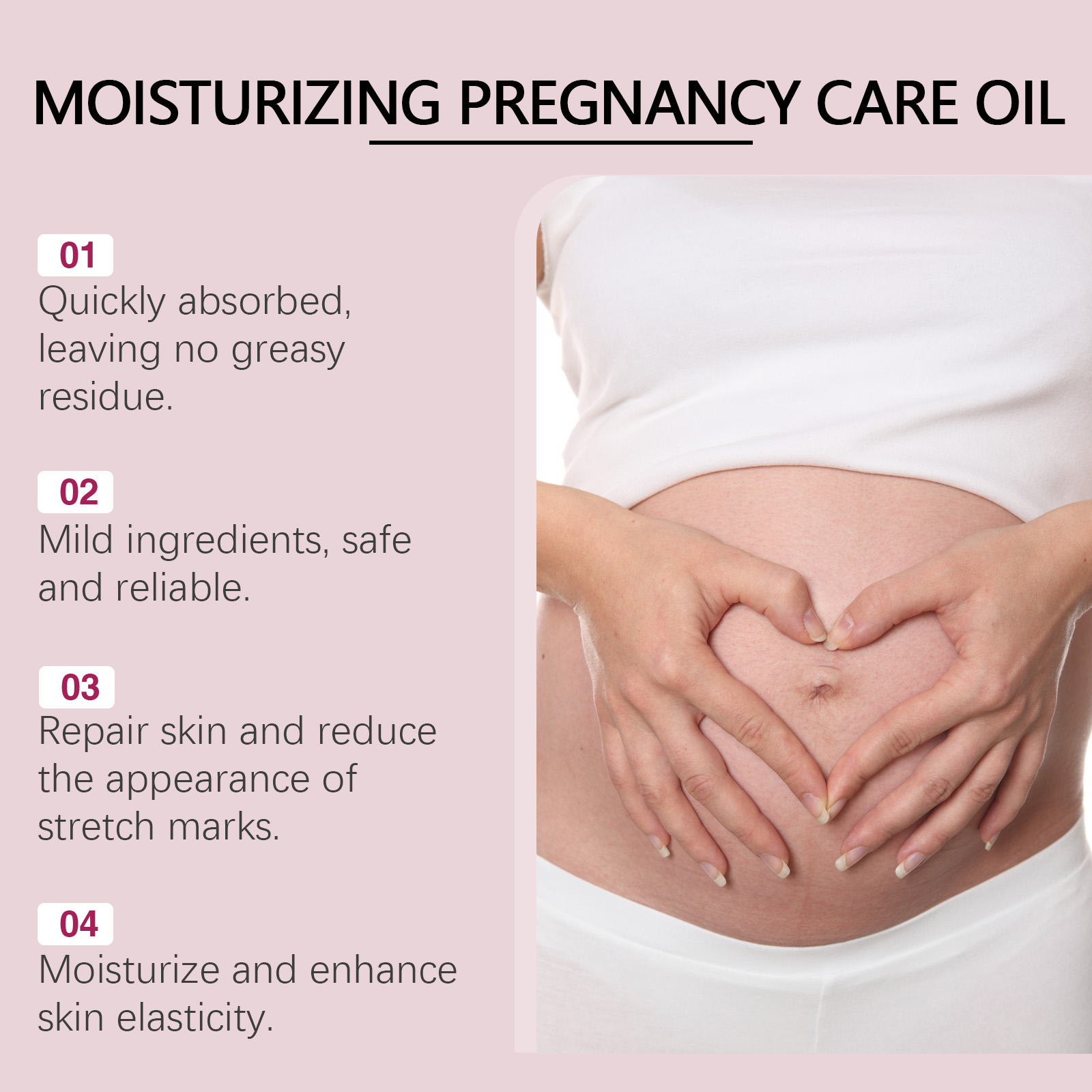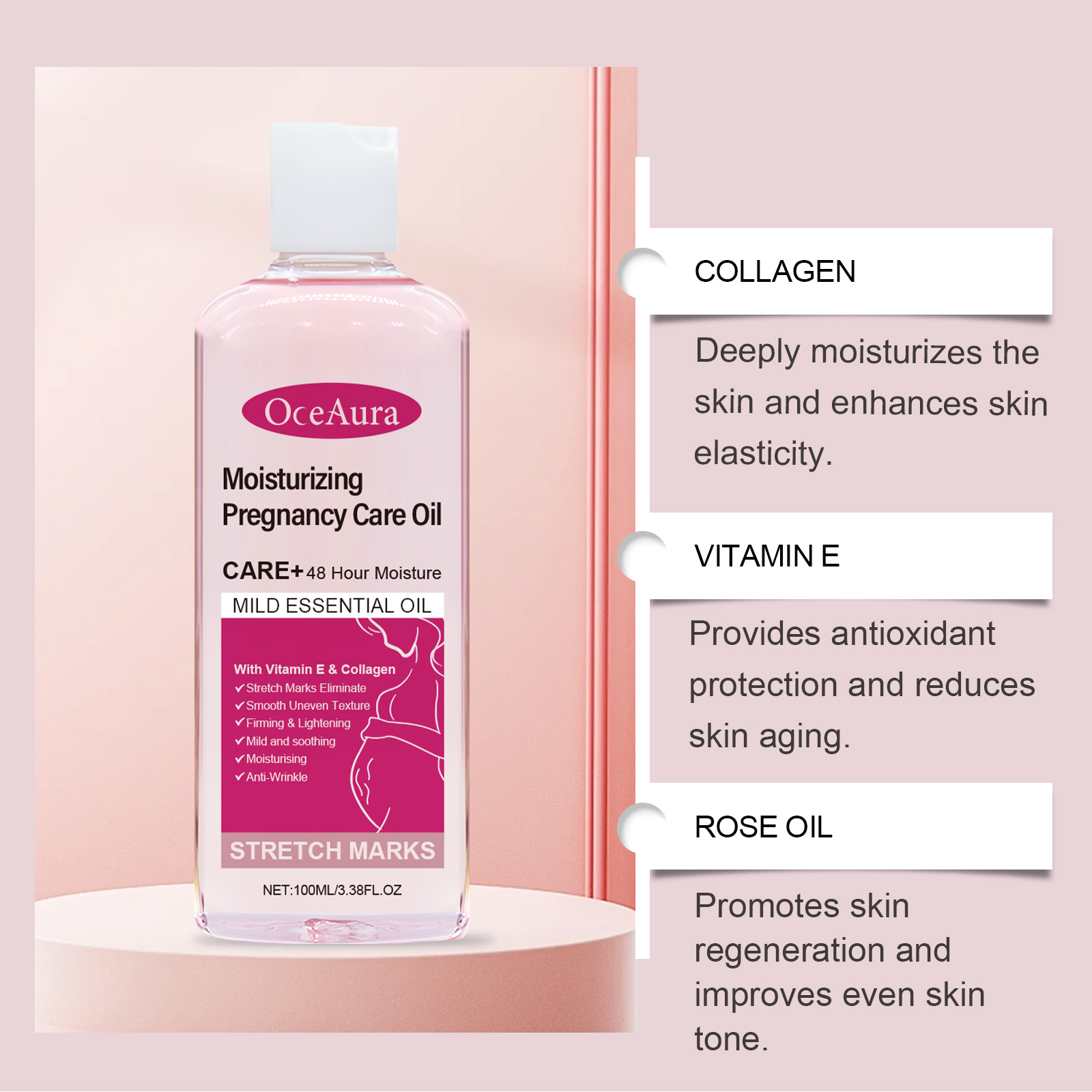 我们的妊娠纹护理油含有胶原蛋白、摩洛哥坚果油。它可以明显减少妊娠纹和疤痕,使用后有明显改善。它的使用方法很简单:先清洁干燥肌肤,取适量本品涂于腹部肌肤,轻轻按摩至完全吸收。并且可以吸收快,不留油腻残渣。