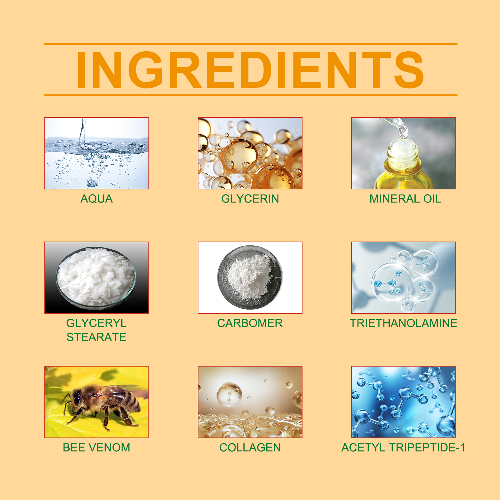 我们的蜂毒身体紧致霜含有蜂毒、胶原、乙酰基三肽-1。它可以显著改善皱纹和细纹。提供深层持久的保湿效果。它的使用方法很简单:1.彻底清洁和干燥皮肤。2.取适量本品均匀涂抹于颈部、手臂、胸部、腹部,大腿和臀部的皮肤上。3.轻轻按摩,促进更好的吸收。增强肌肤弹性,焕发青春活力。使用温和成分,安全无刺激性。经常使用可减少皱纹和细纹的出现。