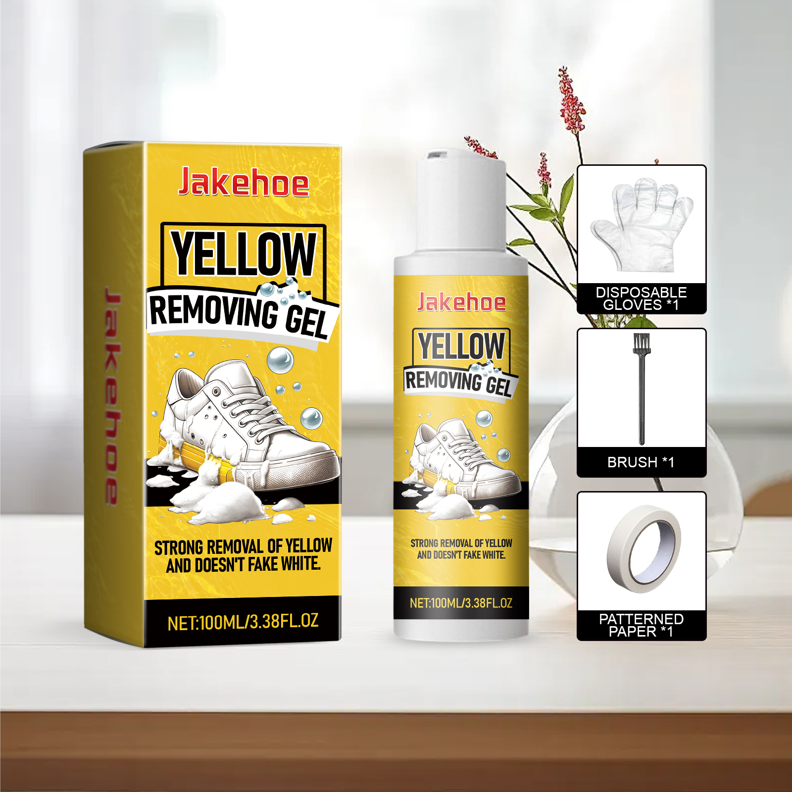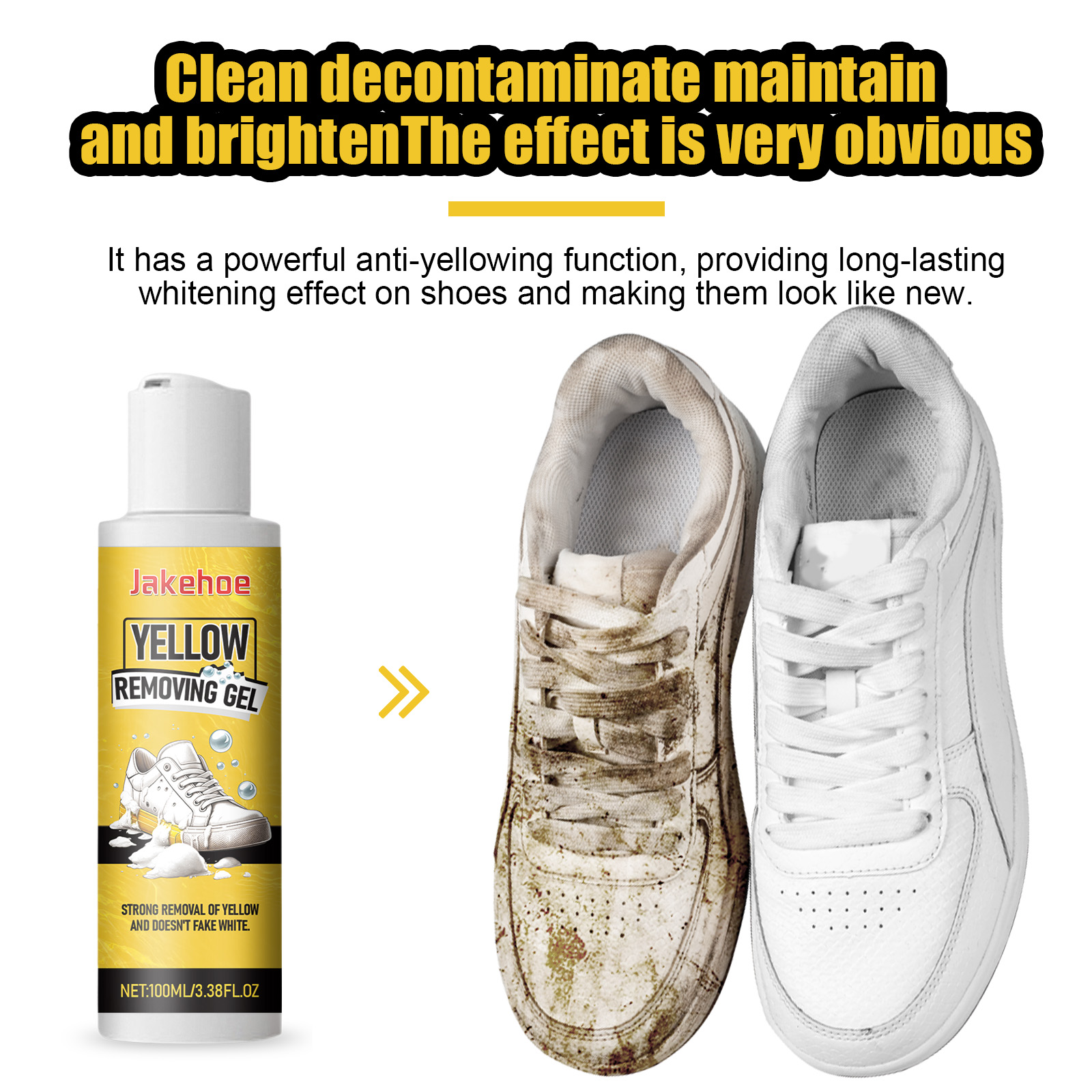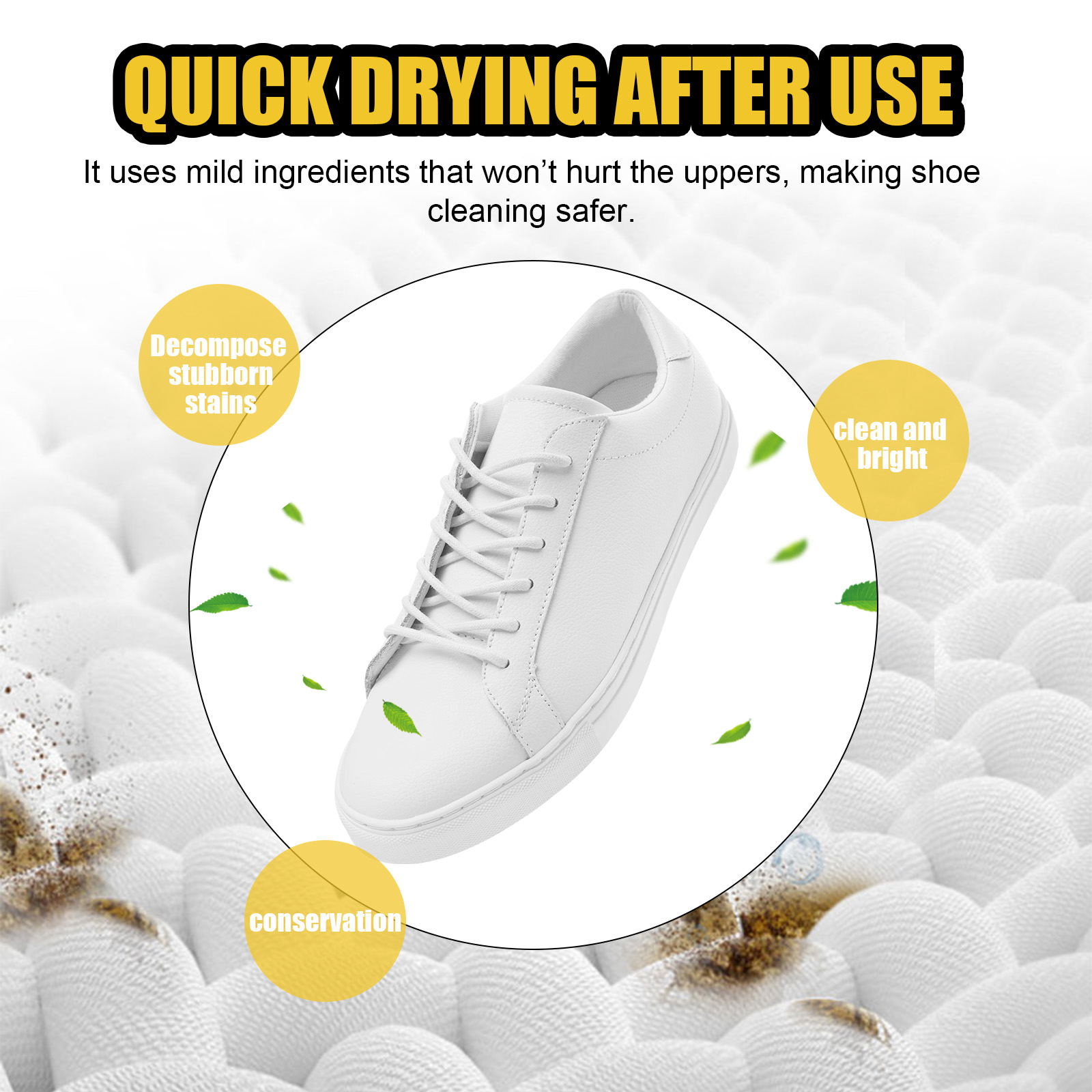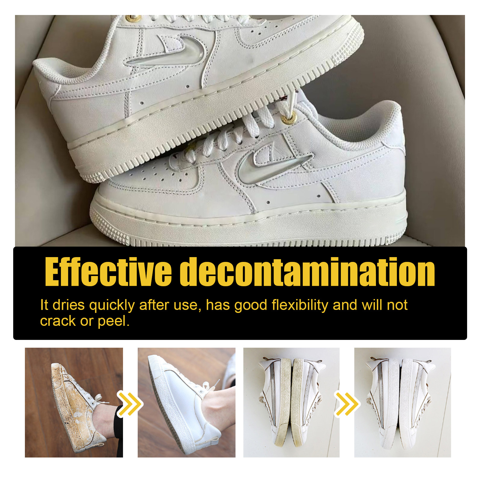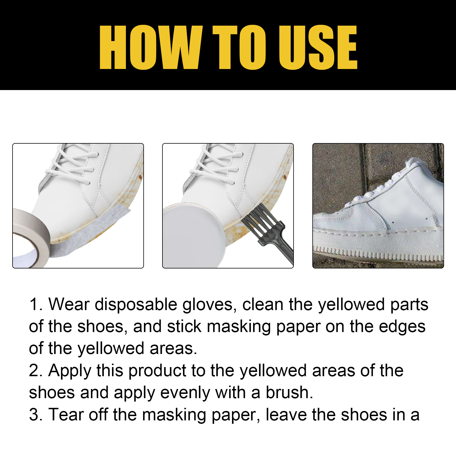 我们的小白鞋清洁啫喱含有次氯酸钠、卡波姆。它可以具有强大的抗黄变功能,为鞋子提供持久的美白效果,使鞋子焕然一新。它的使用方法很简单:1.戴上一次性手套,清洁鞋子发黄的部分,并在发黄区域的边缘贴上遮光纸。2. 将本品涂抹在鞋子发黄的部位,用刷子均匀涂抹。3. 撕掉遮盖纸,将鞋放在通风处放置6-8小时,最后用清水擦拭干净。使用后干燥快,柔韧性好,不开裂、不剥落。它使用温和的成分,不会伤害鞋面,使鞋子清洁更安全。