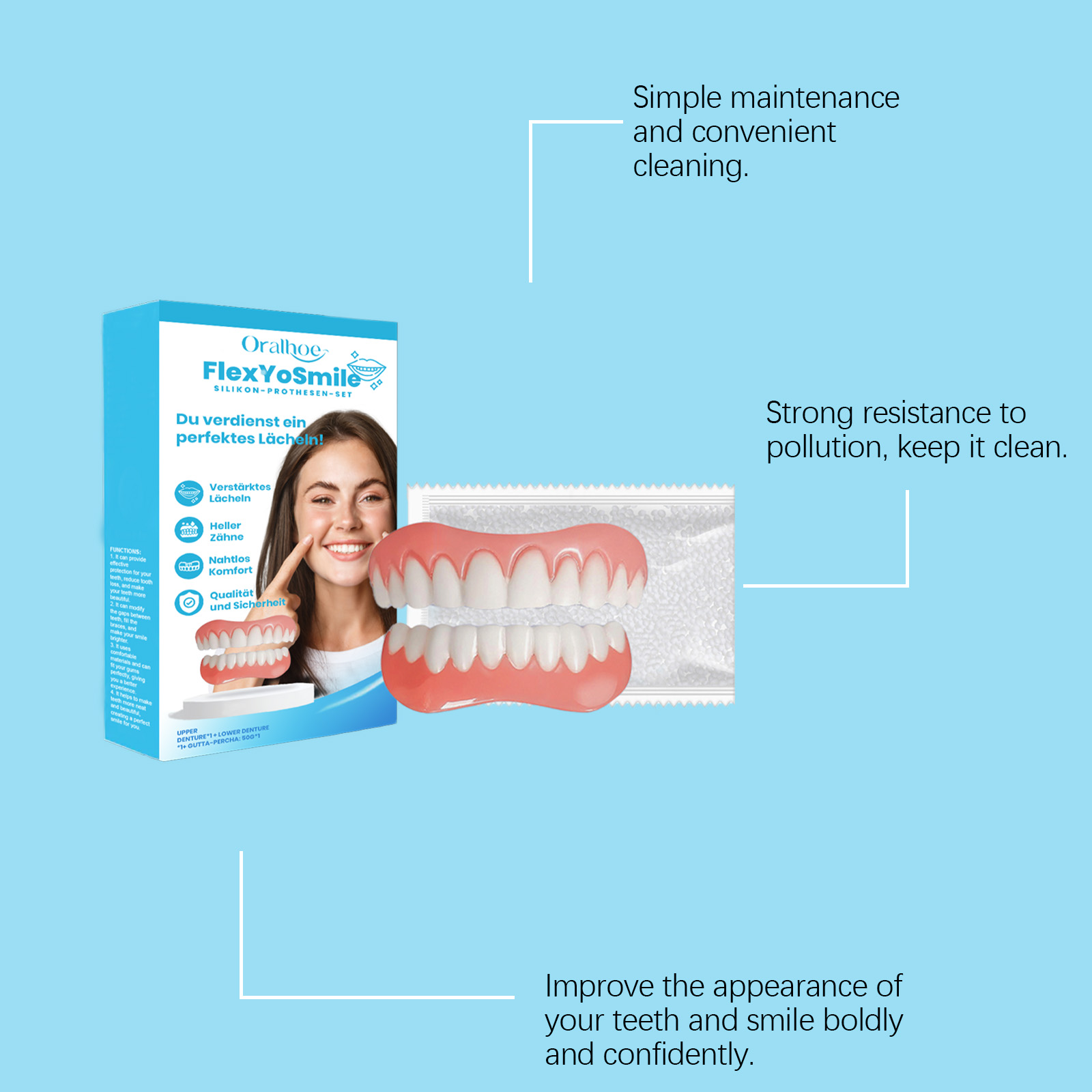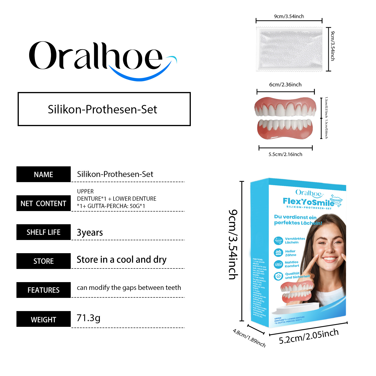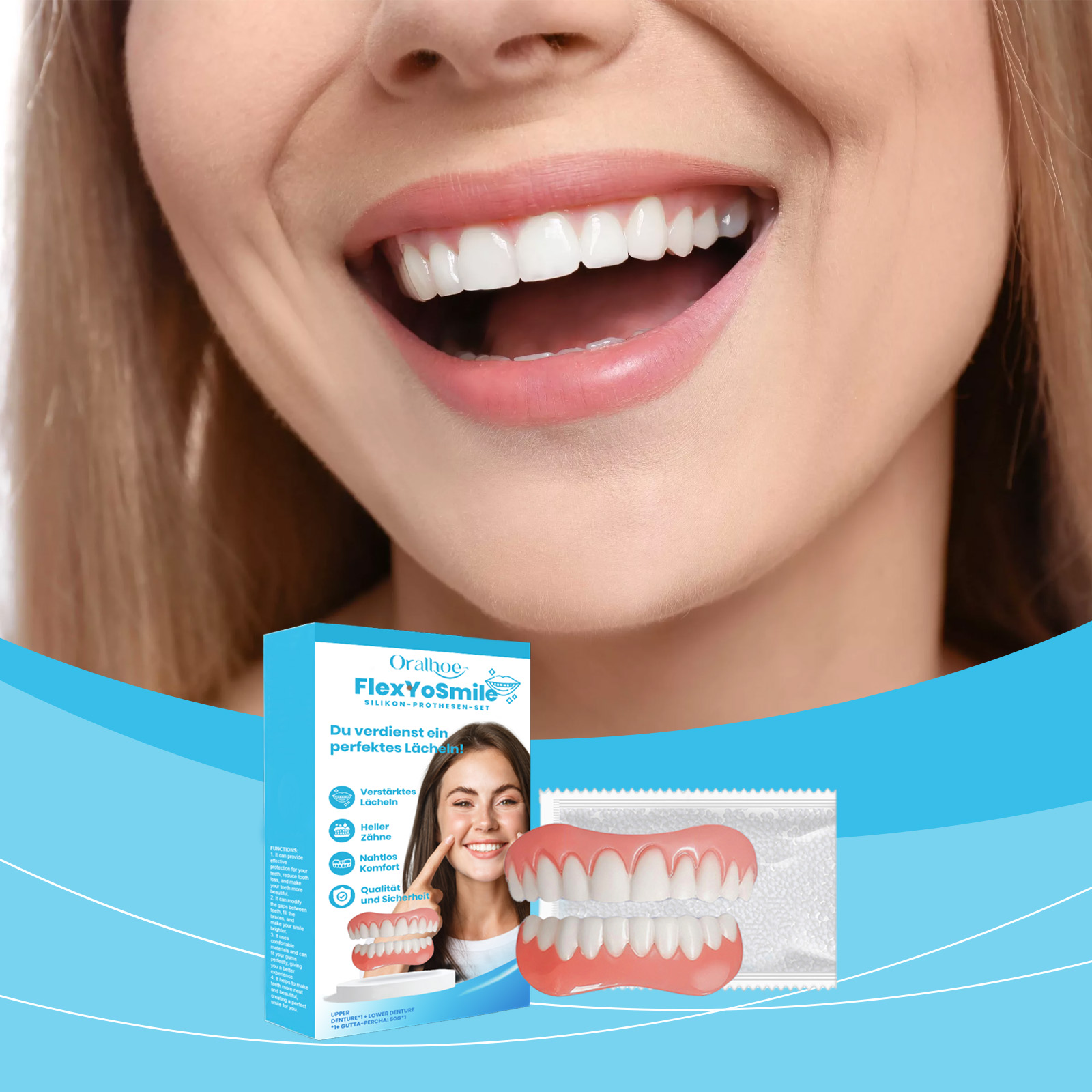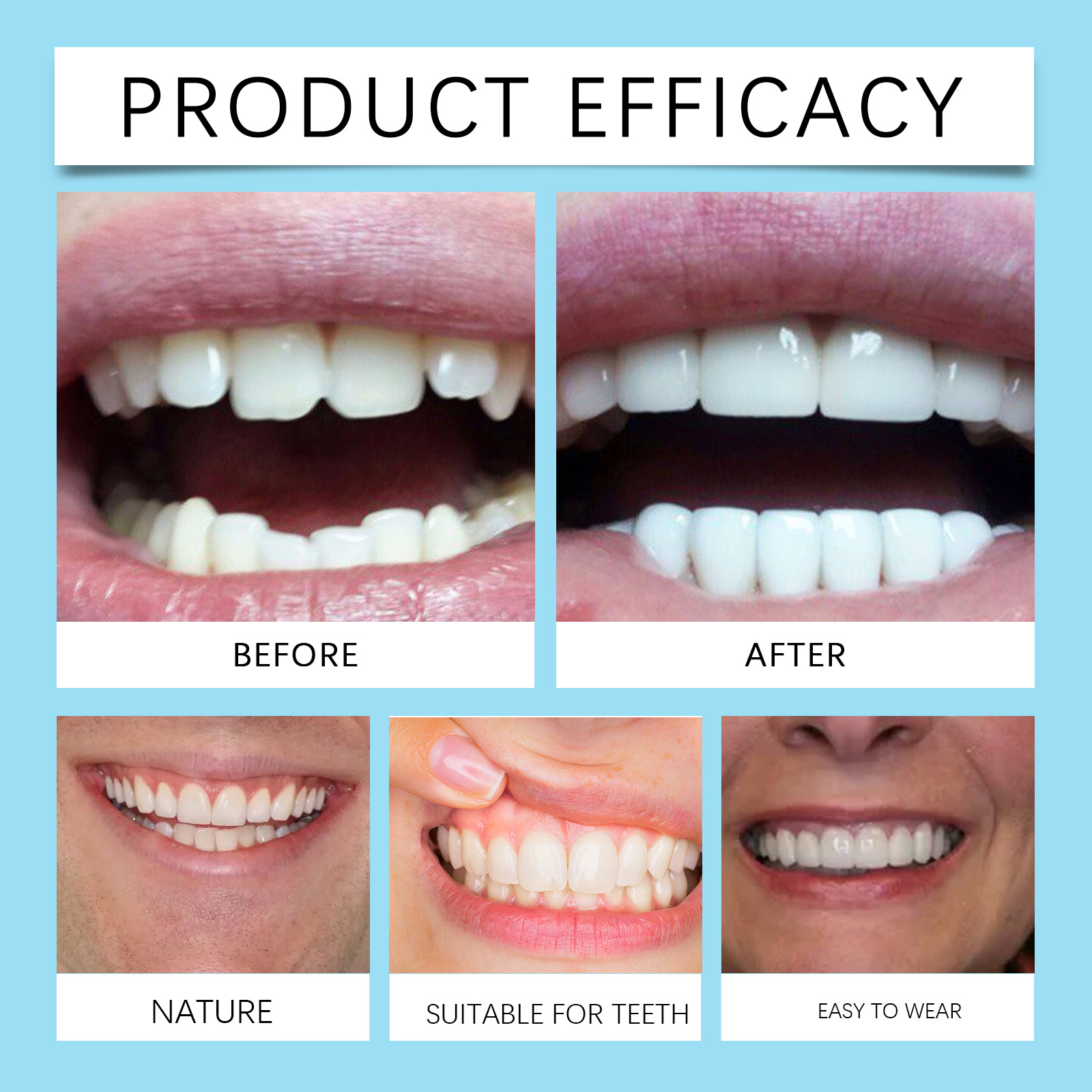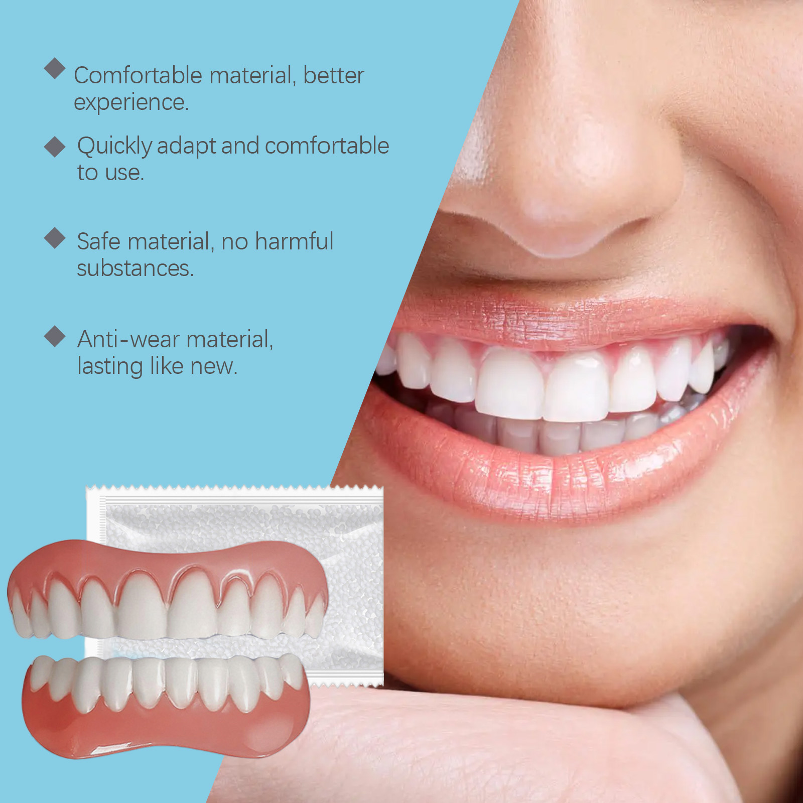 我们的美牙修饰假牙套含有聚乙烯醇交联聚合物、聚丙烯酸钠。它可以立即提升您的外貌。它的使用方法很简单:把牙胶融化,直到它变成液体凝胶,用牙胶把牙套粘在牙齿上。并且可以减少牙齿缺失,让你的牙齿更漂亮。它可以修补牙齿之间的缝隙,填充牙套,让你的笑容更灿烂。