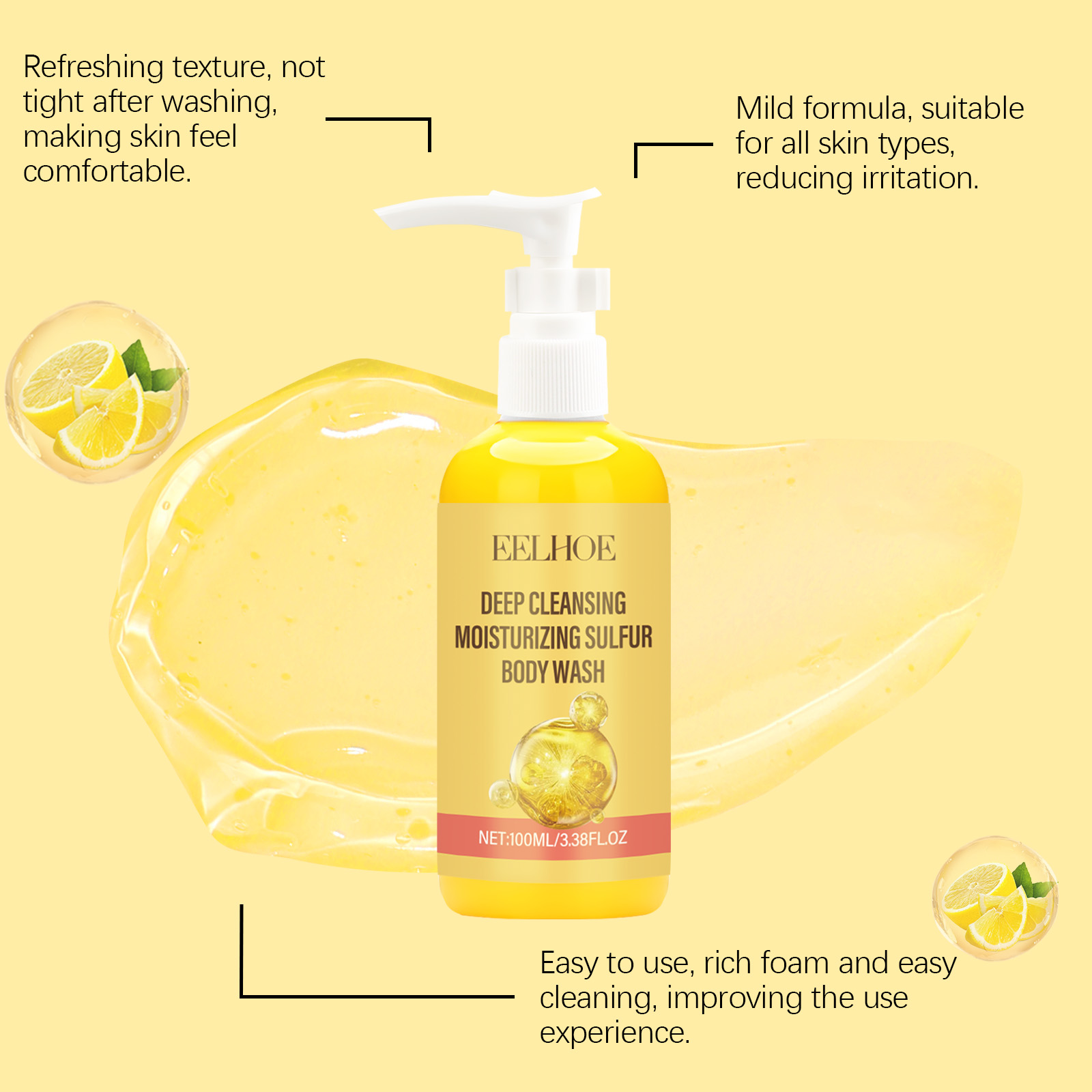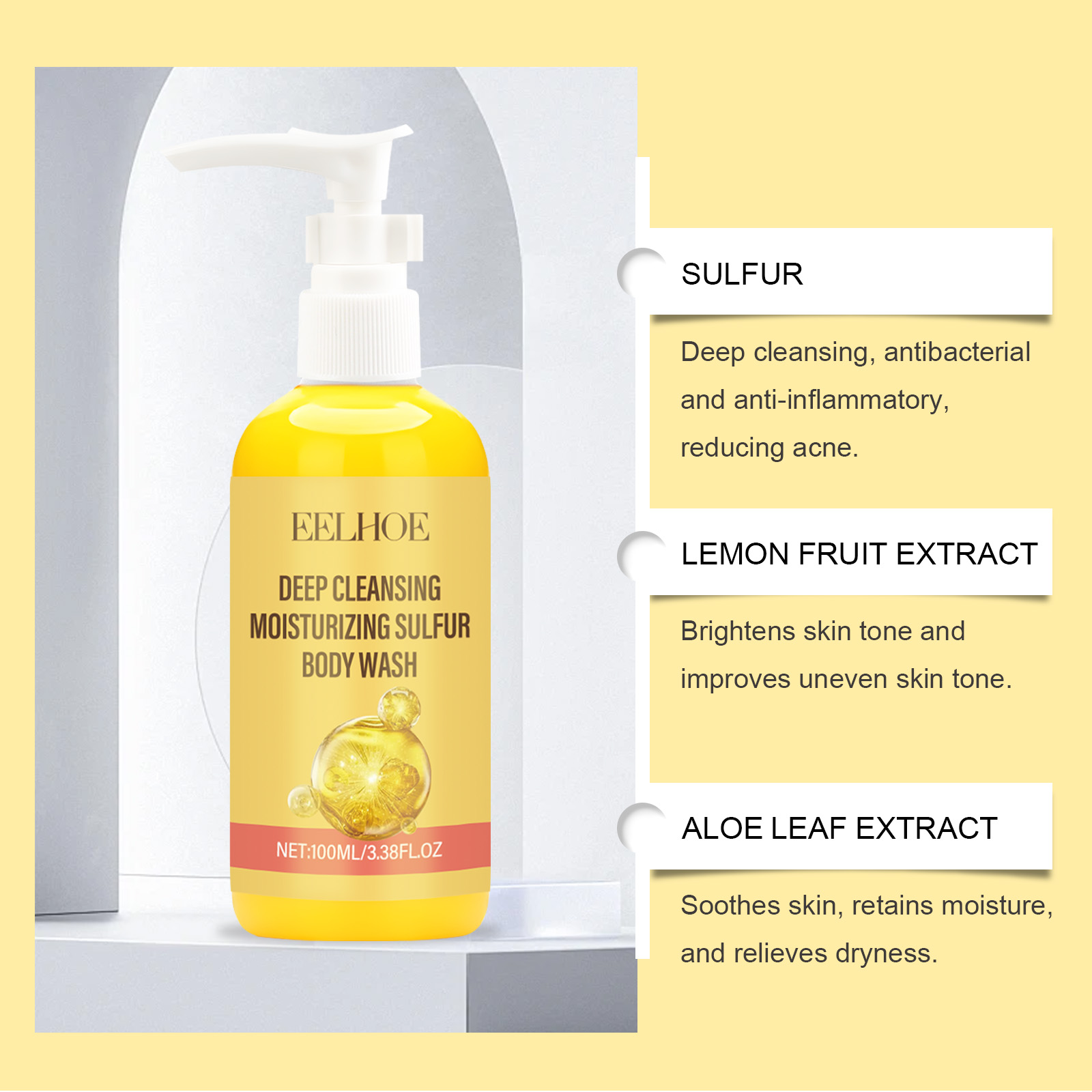 我们的硫磺清洁沐浴露含有硫磺、柠檬果提取物、芦荟叶提取物。它可以有效去除皮肤表面污垢,清洁毛孔。有助于减少痤疮复发,改善皮肤状况。它的使用方法很简单:1. 用温水滋润身体皮肤。2. 使用方法:取适量本品,揉搓成泡沫,均匀涂抹于全身。3. 轻轻按摩至彻底清洁,最后用清水冲洗。芦荟叶提取物舒缓皮肤,提供水分,缓解干燥。