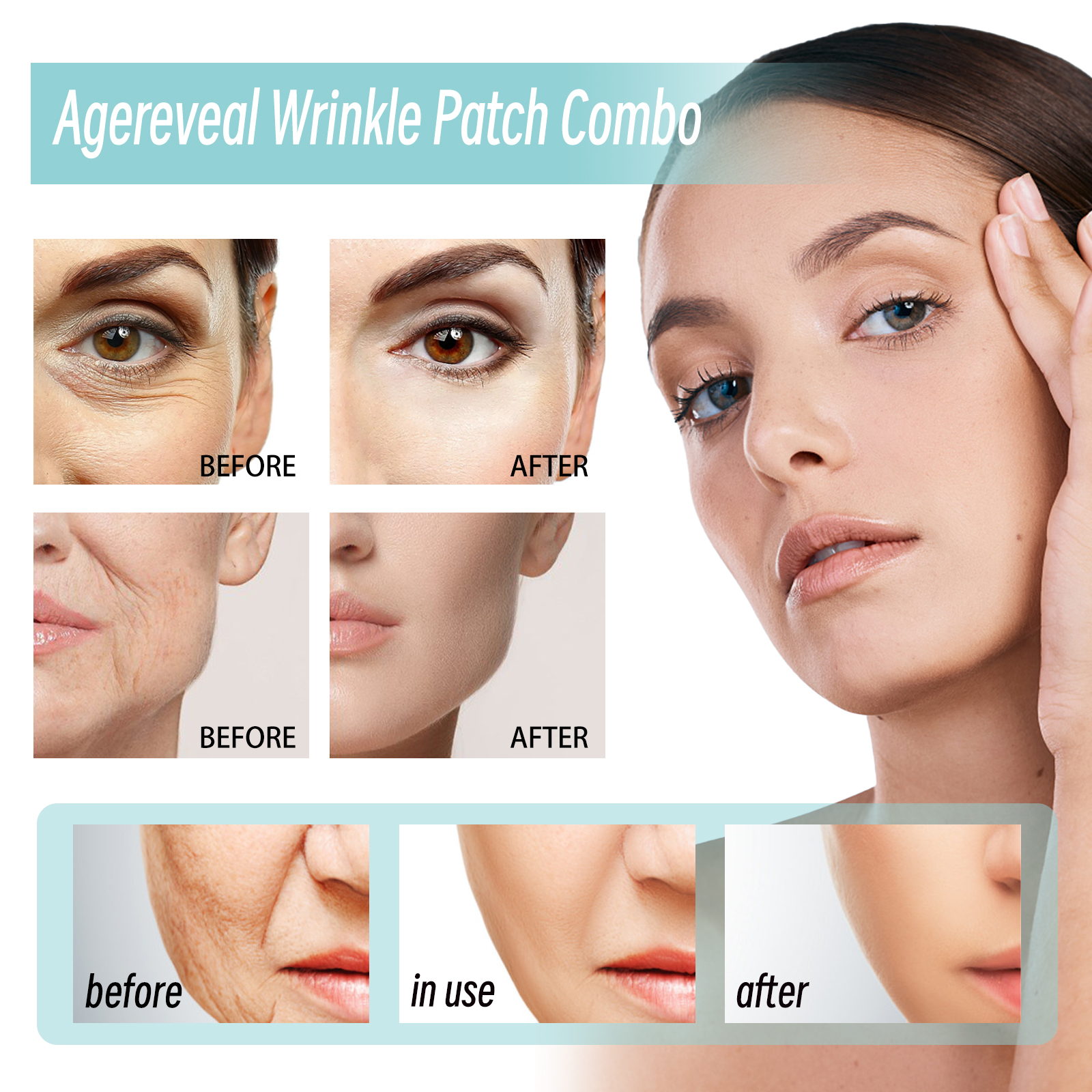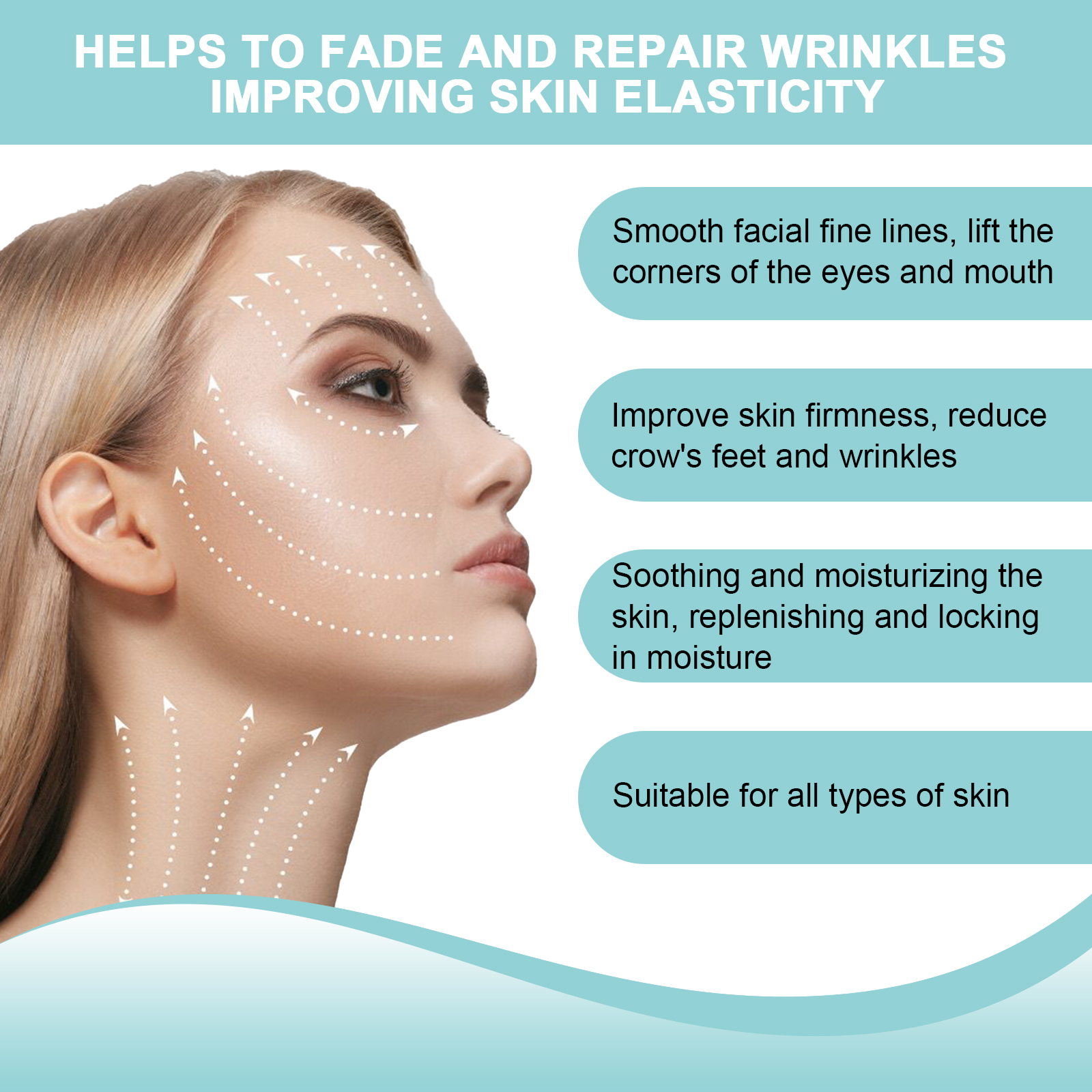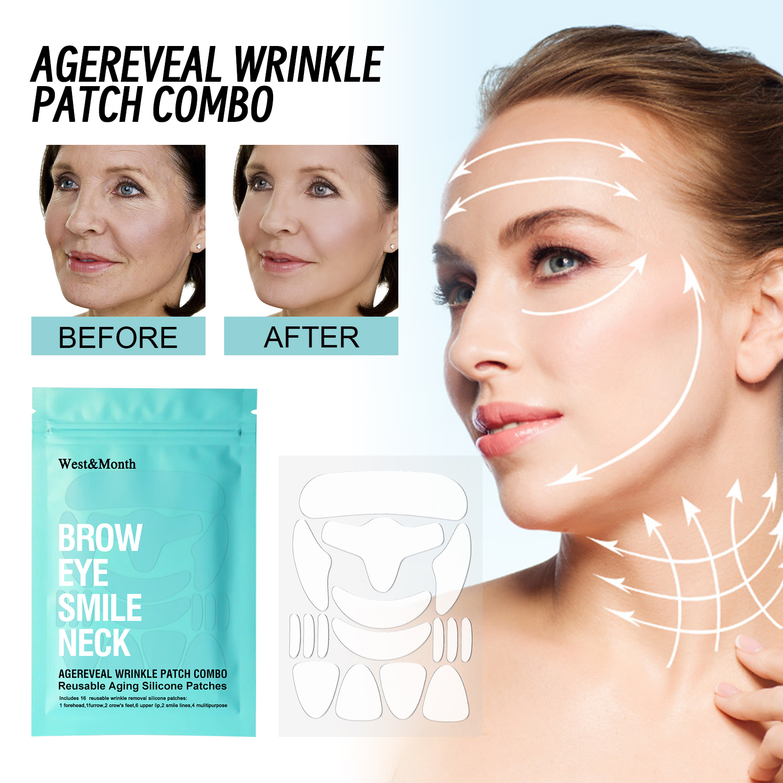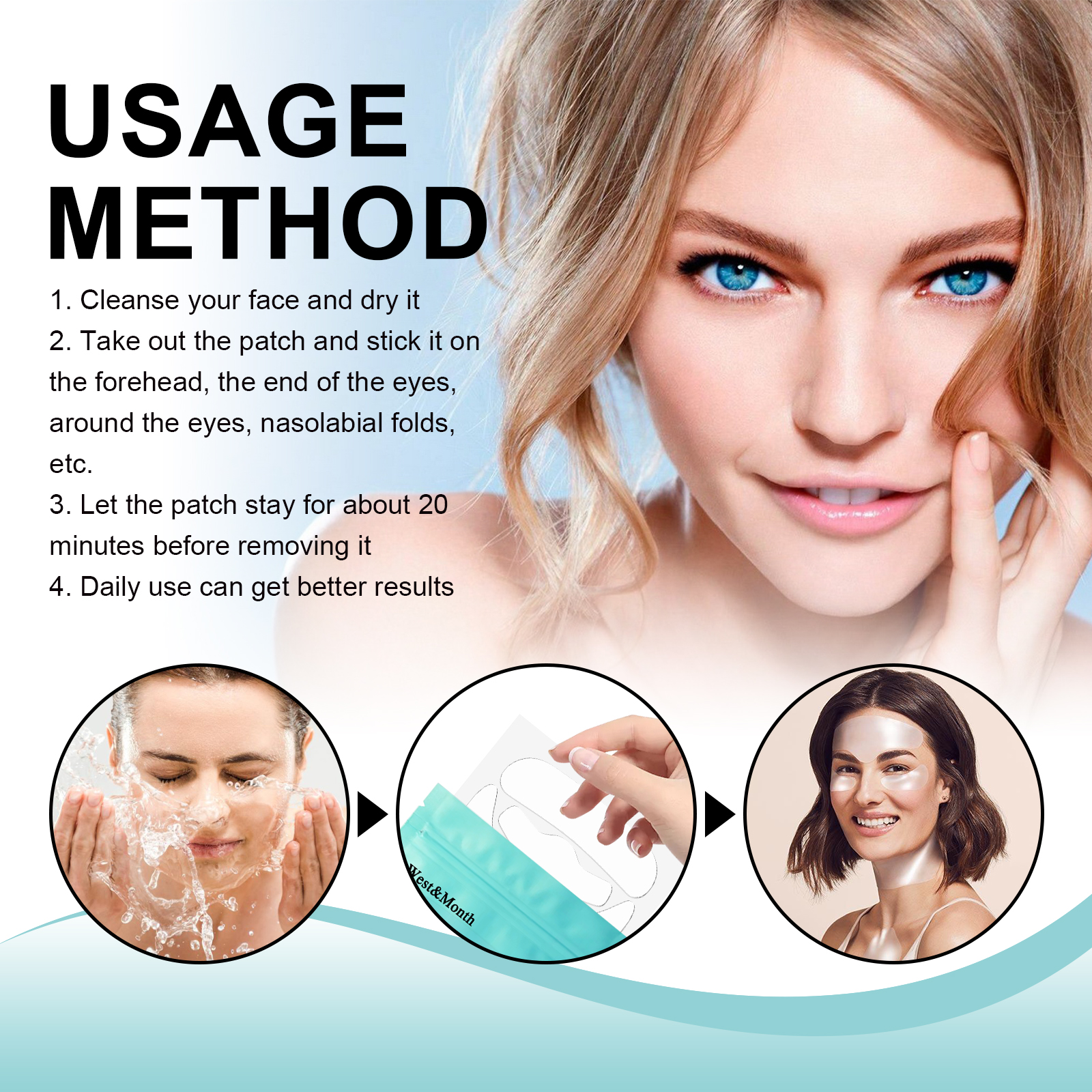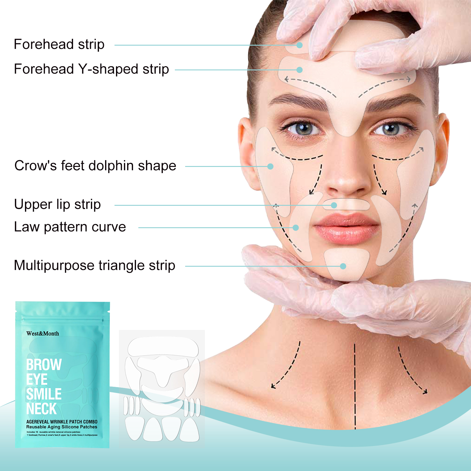 我们的透明皱纹贴含有硅胶、芦荟提取物、神经酰胺。它可以舒缓和滋润皮肤,补充和锁住水分;超强保湿,Q弹性肌肤。它的使用方法很简单:1. 清洁面部并擦干;2. 取出贴片贴在额头、眼尾、眼周、鼻唇沟处。3. 让贴片停留20分钟后再取下;4. 日常使用可以获得更好的效果。平滑面部细纹,提亮眼角及嘴角;改善皮肤紧致度,减少皱纹。