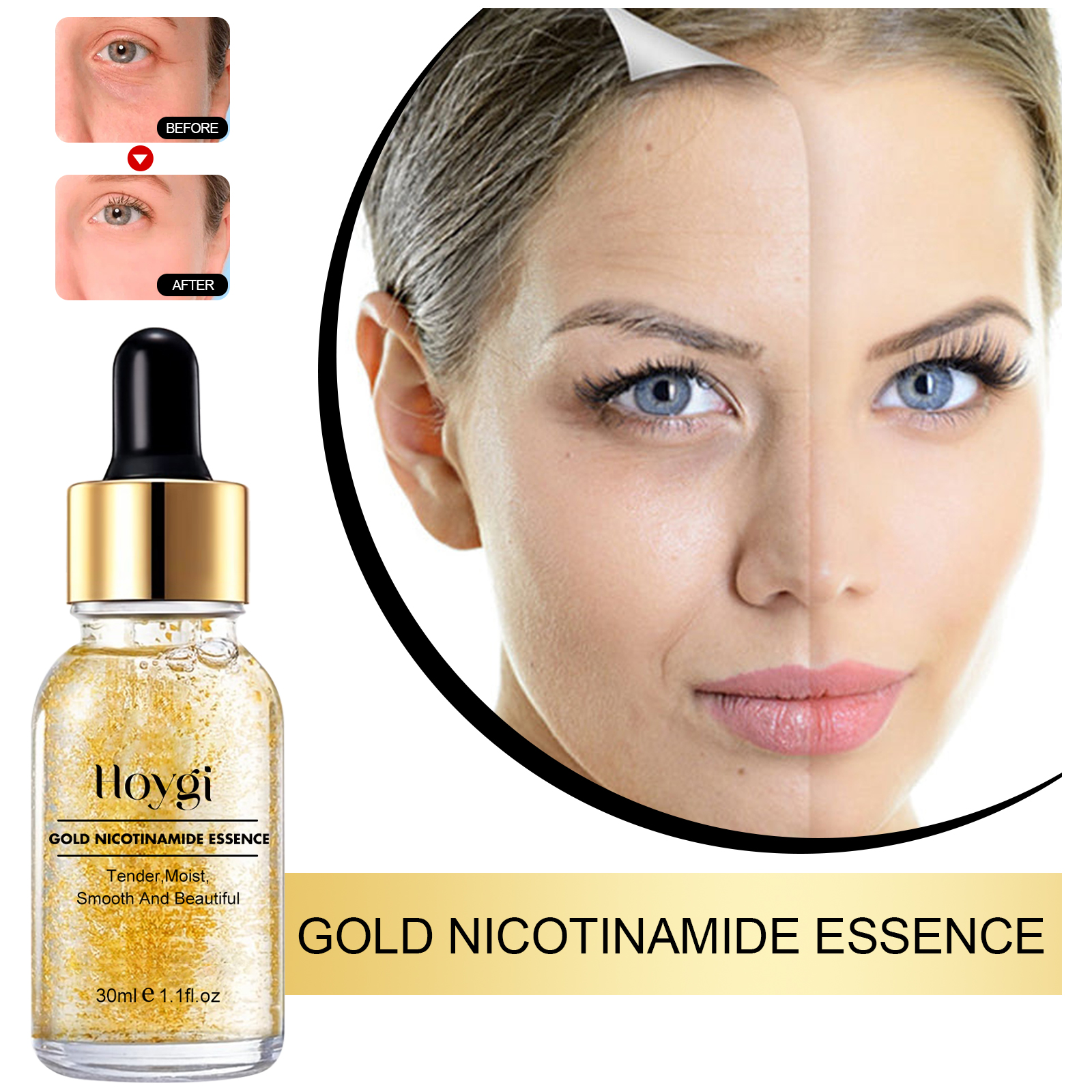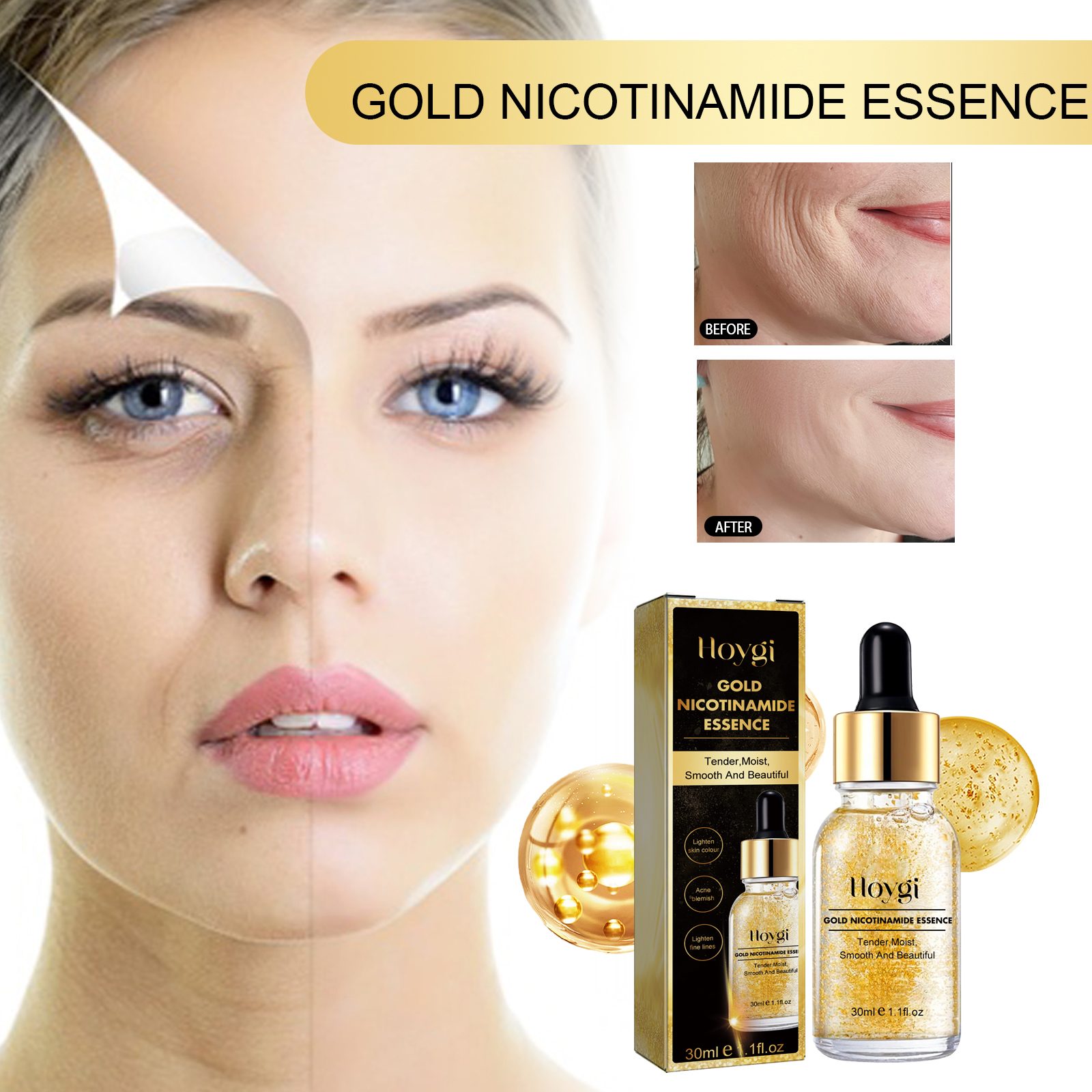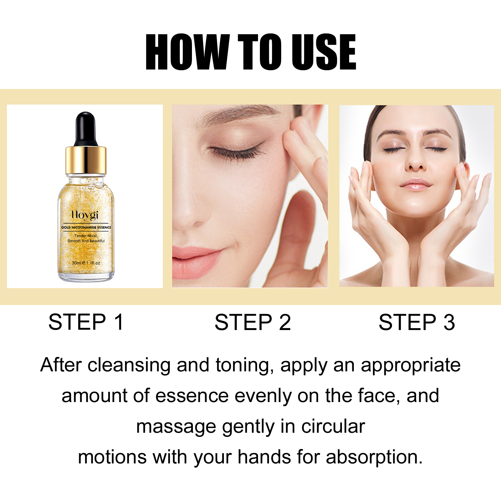 我们的24k黄金烟酰胺精华液含有24k金箔、透明质酸。它可以淡色减少皱纹和眼袋减少嘴巴、脸颊和下巴周围的细纹改善脖子和胸部的外观。它的使用方法很简单:洁面爽肤后,取适量均匀涂抹于面部,用手轻轻打圈按摩至吸收。并且可以立即帮助减少皱纹和细纹的出现。