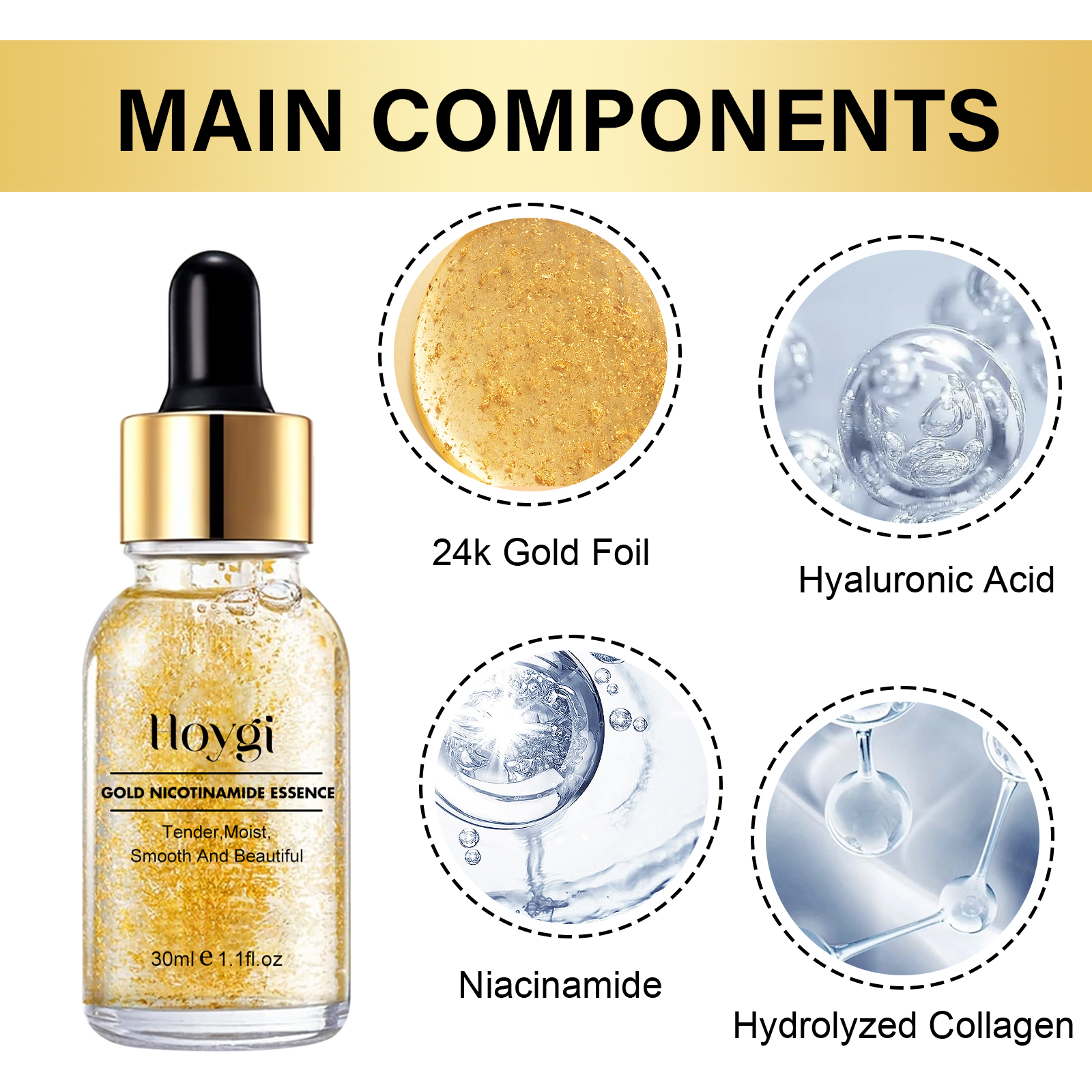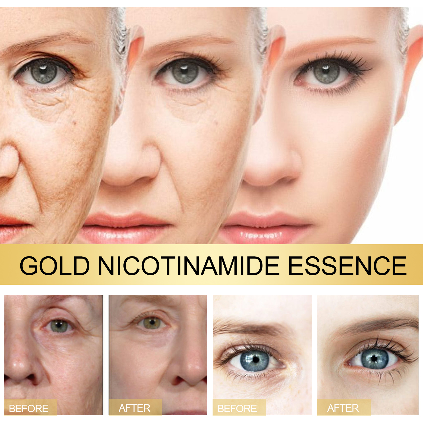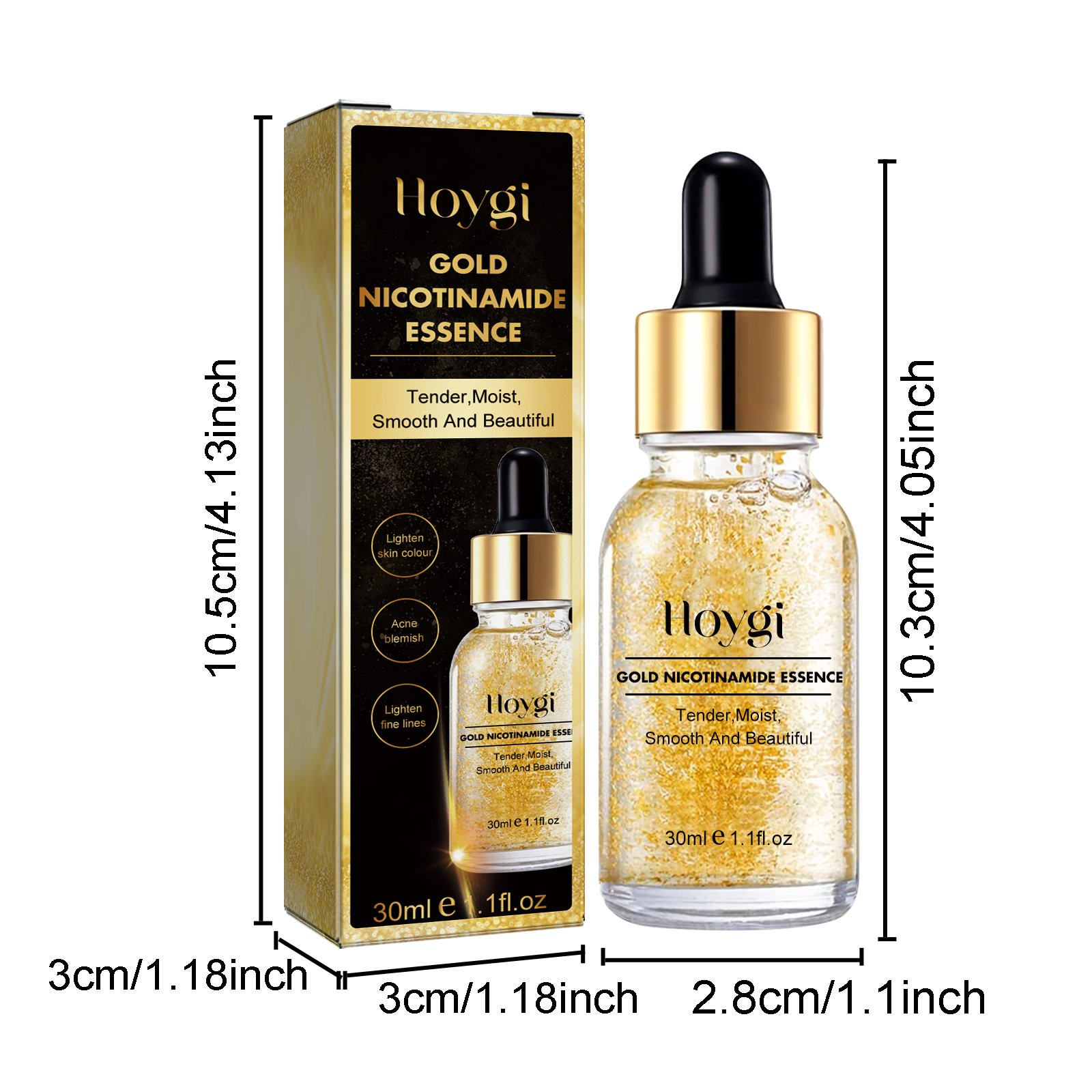 我们的24k黄金烟酰胺精华液含有24k金箔、透明质酸。它可以淡色减少皱纹和眼袋减少嘴巴、脸颊和下巴周围的细纹改善脖子和胸部的外观。它的使用方法很简单:洁面爽肤后,取适量均匀涂抹于面部,用手轻轻打圈按摩至吸收。并且可以立即帮助减少皱纹和细纹的出现。