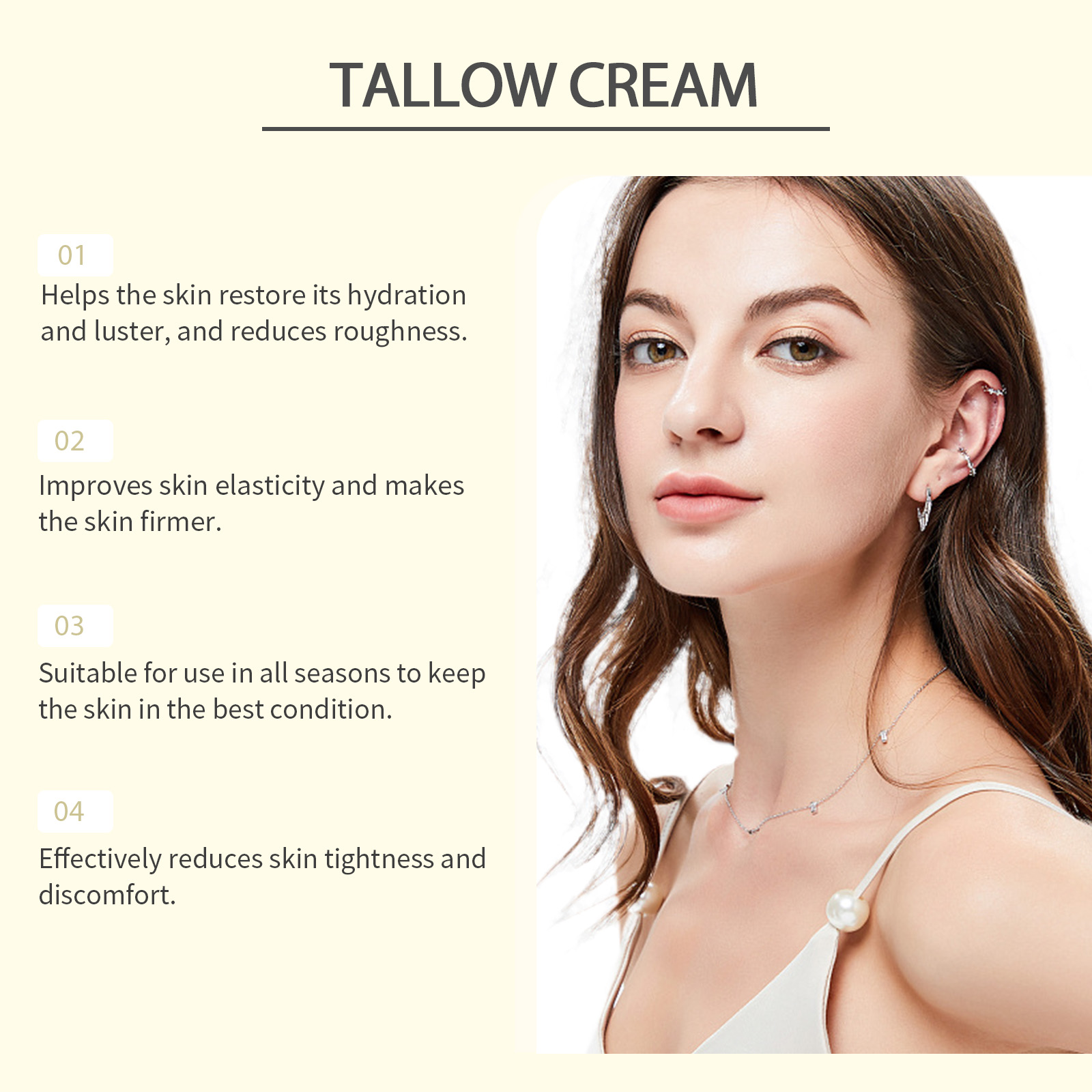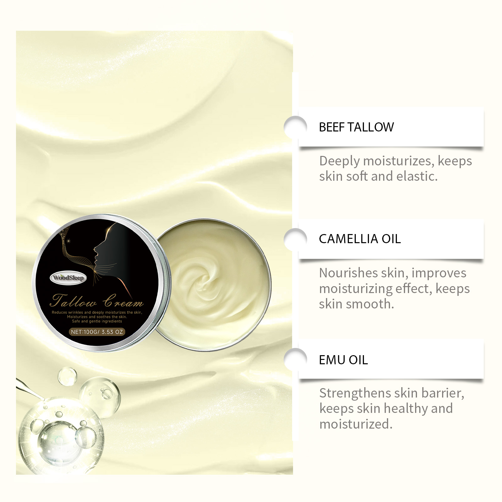 我们的草饲牛脂滋润面霜含有牛脂、油茶籽油。它可以减少细纹和皱纹,使皮肤紧致光滑。深层滋润肌肤,锁住水分,保持肌肤水润。它的使用方法很简单:1.洗脸并保持干燥。2.取适量本品均匀涂抹于面部。3.轻轻按摩至吸收。深层保湿,保持肌肤水润柔软。