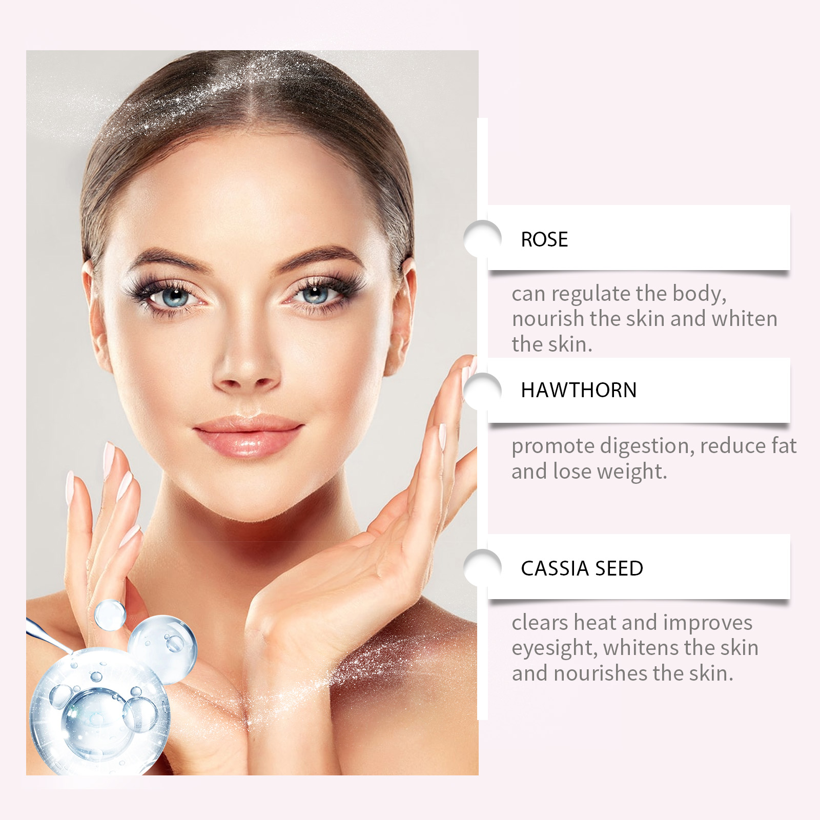 我们的美白胶原蛋白茶含有绿茶、茯苓。它可以深层美白肌肤,提高肤色亮度。它的使用方法很简单:杯中放一个茶包,加入约200毫升开水,浸泡3-4分钟。并且采用中草药成分,安全无副作用。