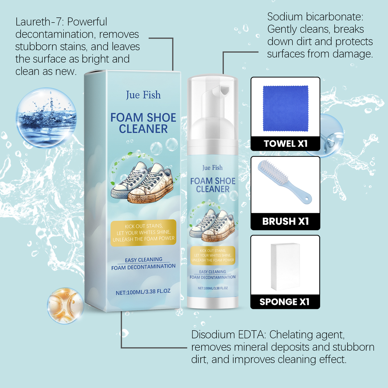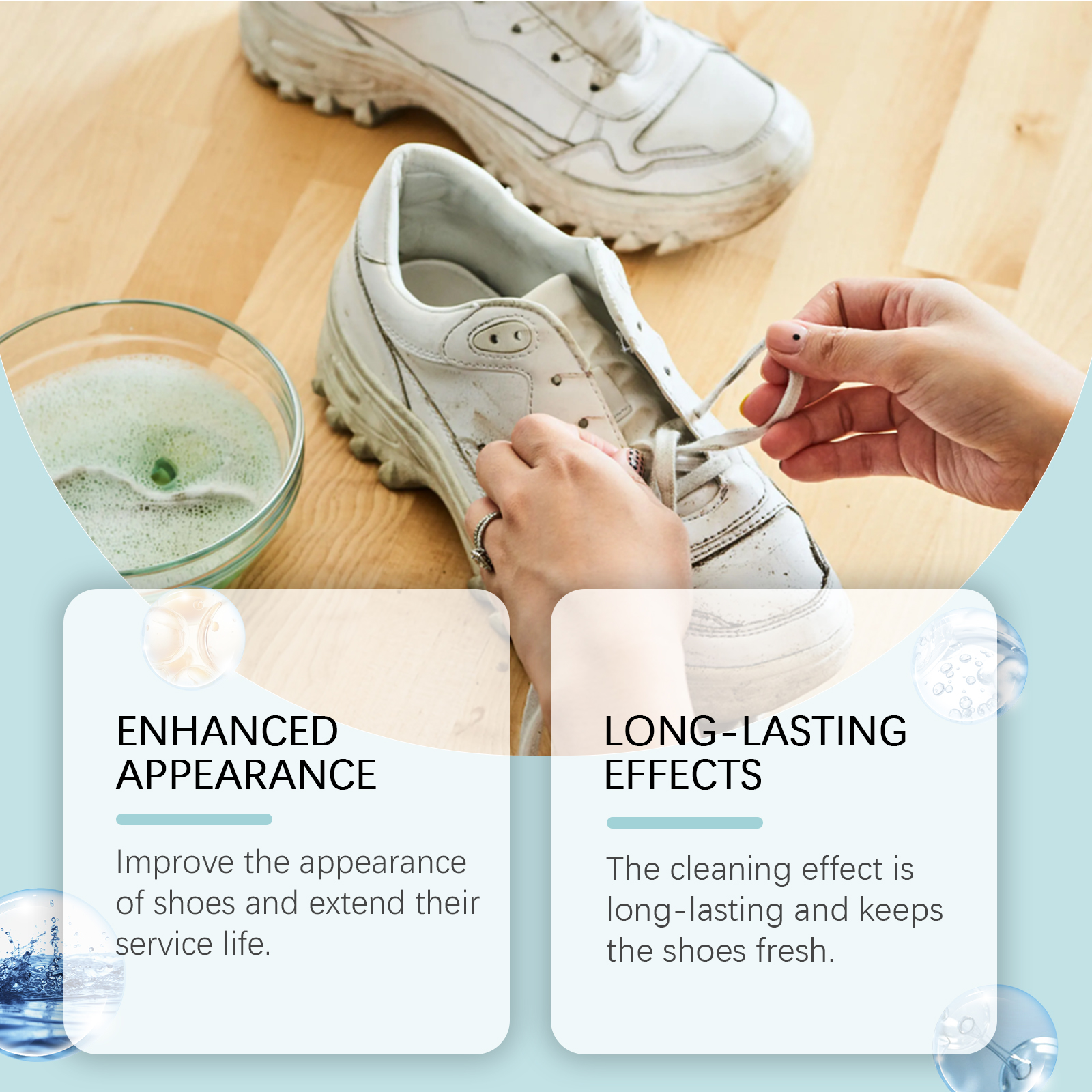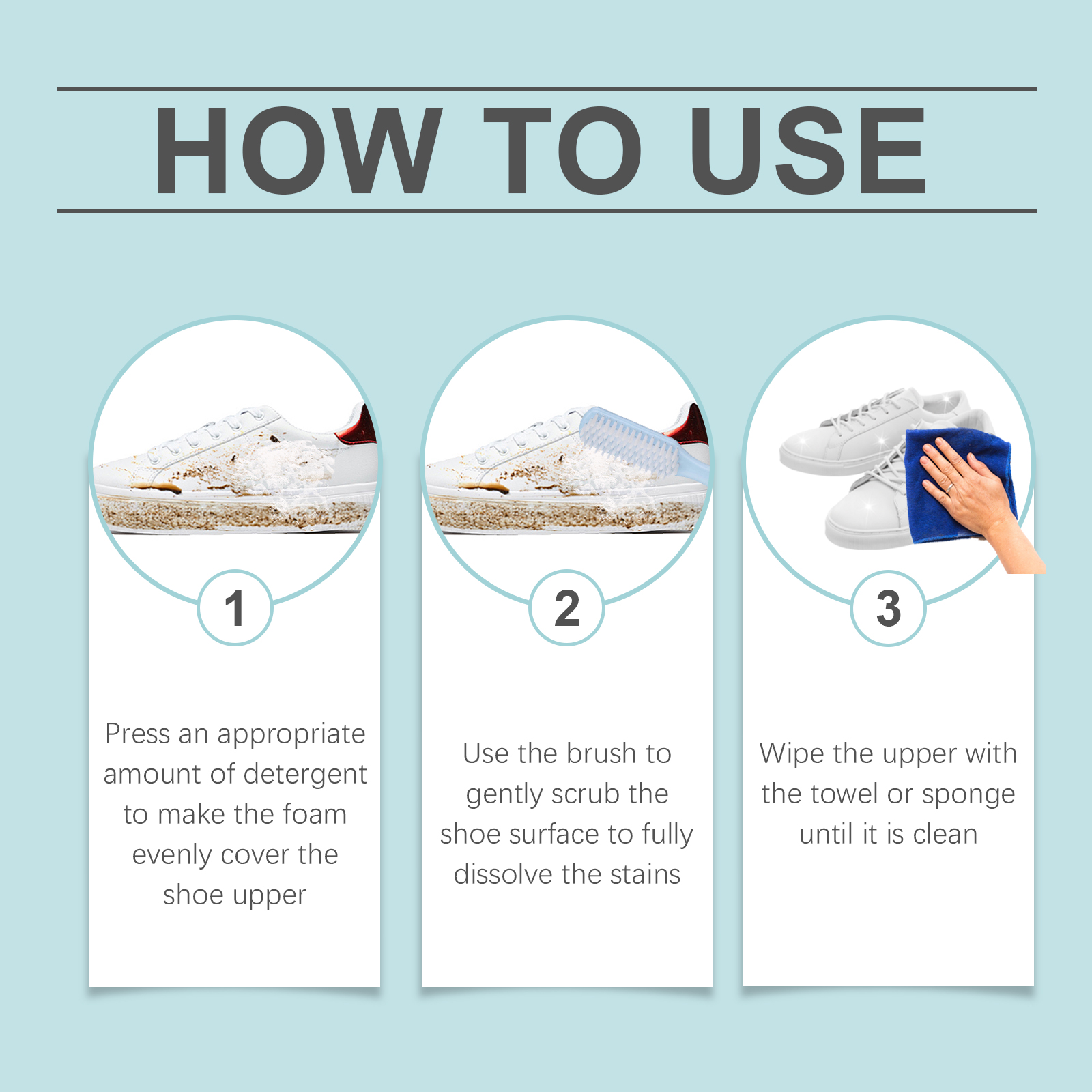 我们的小白鞋泡沫清洁套装含有PEG-12 聚二甲基硅氧烷、脂肪醇聚氧乙烯醚 AEO 7。它可以改善鞋子的外观,延长其使用寿命。清洁效果持久,保持鞋子清新。它的使用方法很简单:按下适量的洗涤剂,使泡沫均匀地覆盖鞋面,用刷子轻轻擦拭鞋面,使污渍完全溶解,用毛巾或海绵擦拭上面,直到干净。并且可以有效清洁鞋底,保持整体美观。适用于多种鞋材,包括布料、皮革等。