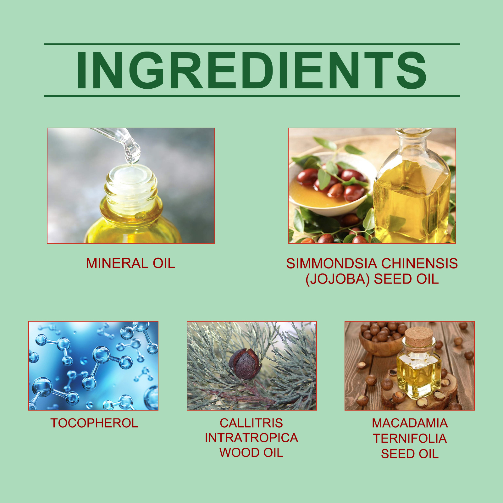 我们的坚果草脱毛护理油含有矿油、霍霍巴籽油。它可以有效促进皮肤修复,改善脱毛后的皮肤损伤。它的使用方法很简单:1. 用滴管取适量的护发油,滴在去毛的部位。2. 用手轻轻按摩护理油,等待1-2分钟,使护理油被皮肤吸收。圆草籽提取物深层滋养,帮助缓解脱毛后的干燥和不适。