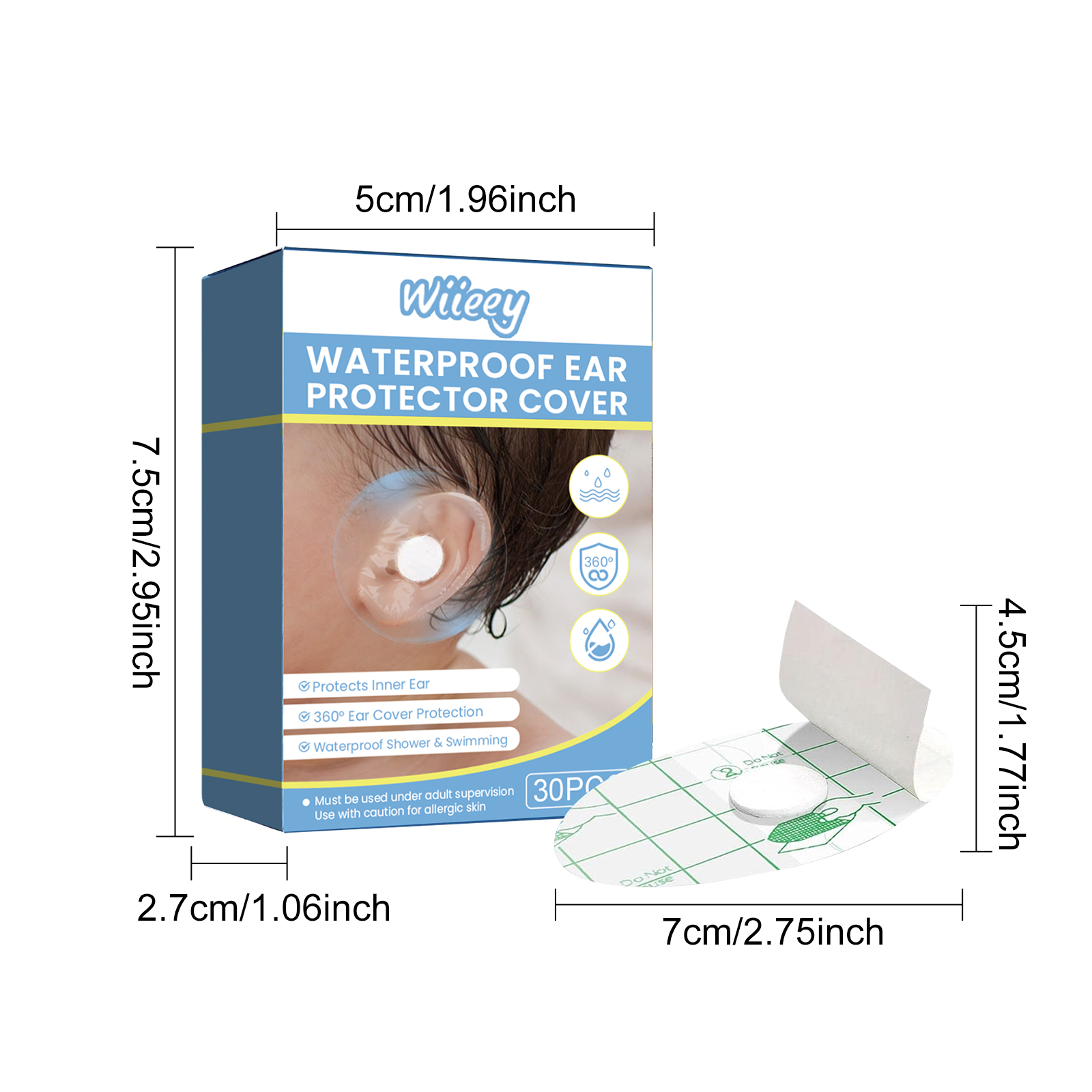我们的婴儿防水护耳罩含有PU膜。它可以有效防止宝宝耳朵在游泳、洗澡、洗头发时被水弄湿。它的使用方法很简单:1.打开包装,取出耳罩。2.撕下背膜,将带棉球的一面朝向耳朵。3.根据宝宝的耳朵形状轻轻地贴上耳罩。4.沐浴或游泳后轻轻摘下耳罩。并且可以缓解宝宝在水中的不适,防止水进入耳朵,使宝宝洗澡或游泳更容易。