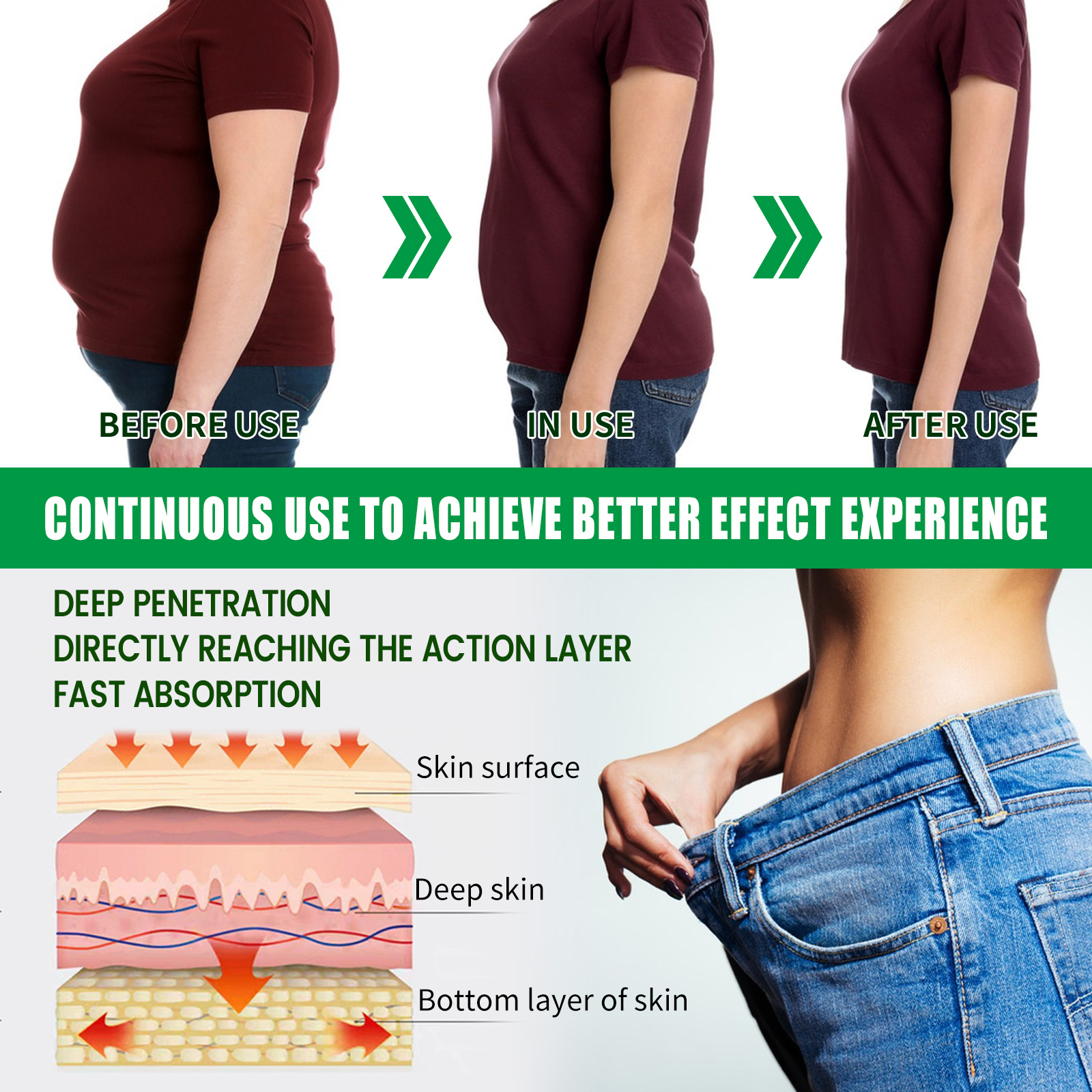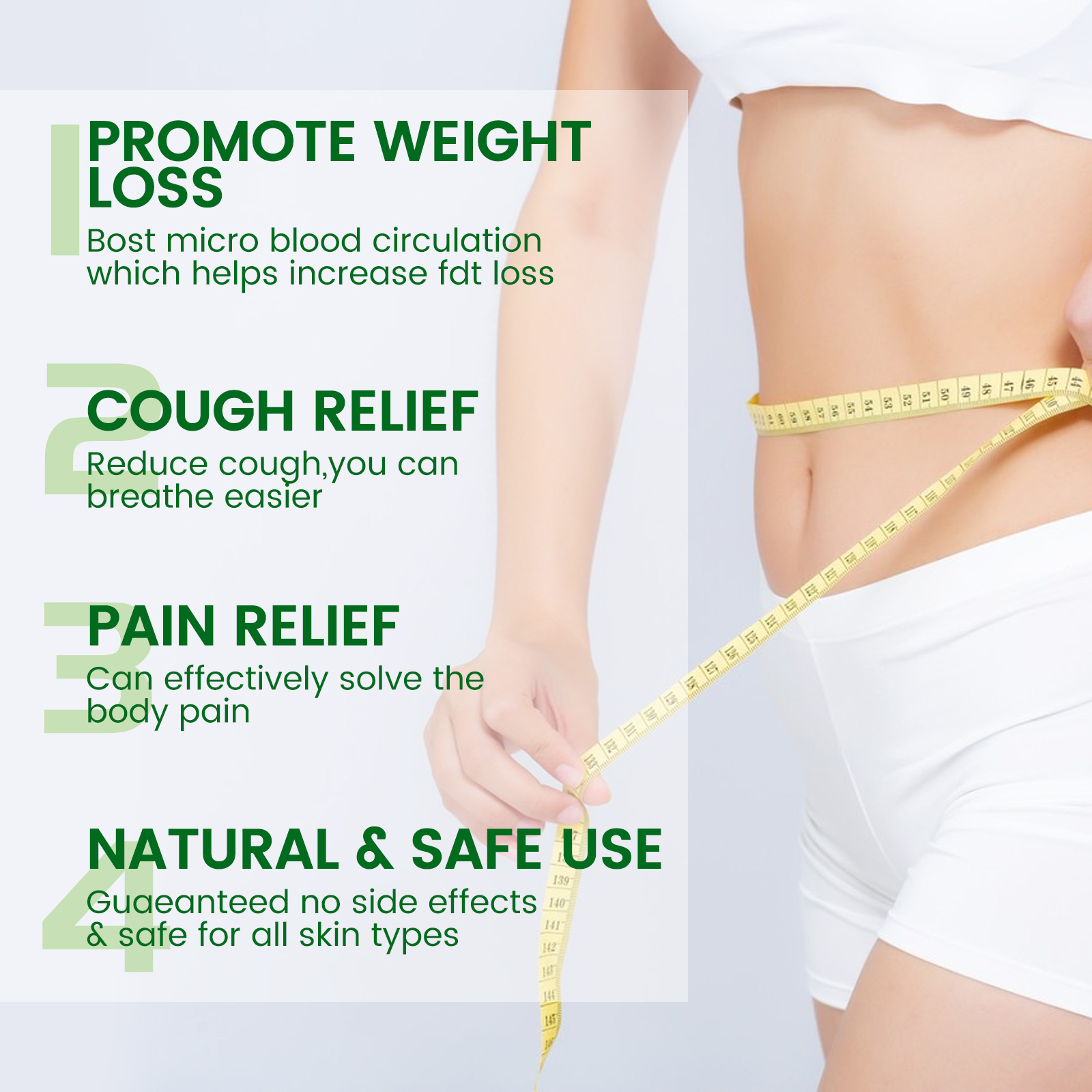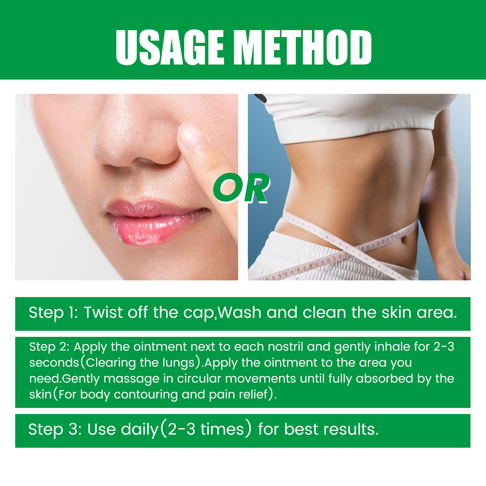 我们的塑身紧致霜含有山金车、生姜、樟脑。它可以有效解决身体疼痛。它的使用方法很简单:步骤1,拧开盖子,清洗并清洁皮肤区域。步骤2,将药膏涂抹在每个鼻孔旁边,轻轻吸气2-3秒(清肺),将药膏涂抹在需要涂抹的区域。轻轻按摩,直到完全吸收用于身体塑形和缓解疼痛)。步骤3,每天使用(2-3次),以获得最佳效果。并且可以改善血液,促进重要液体循环,去除体内不需要的毒素和水。