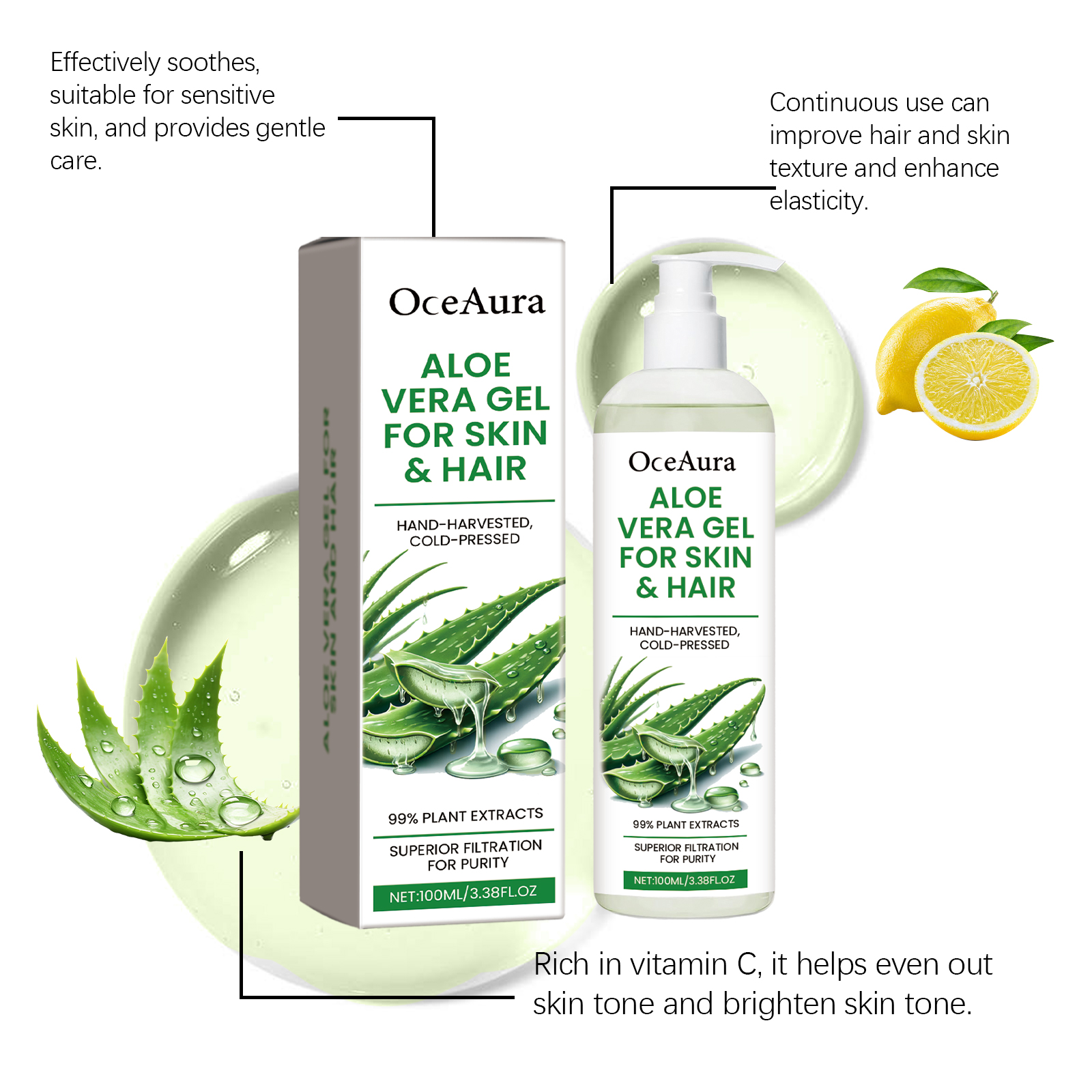 我们的芦荟凝胶含有黄原胶、柠檬酸、维生素C。它可以滋养头皮和皮肤,恢复自然光泽。它的使用方法很简单:用于皮肤,将芦荟凝胶均匀涂于面部和身体,轻轻按摩至吸收。对于头发,将芦荟胶涂在头皮上,轻轻按摩,停留10分钟后洗净。将芦荟凝胶作为护发素涂在头发上,停留4-5分钟后洗干净。并且可以缓解晒伤、皮肤刺激,促进小伤口和抓痕的快速愈合。