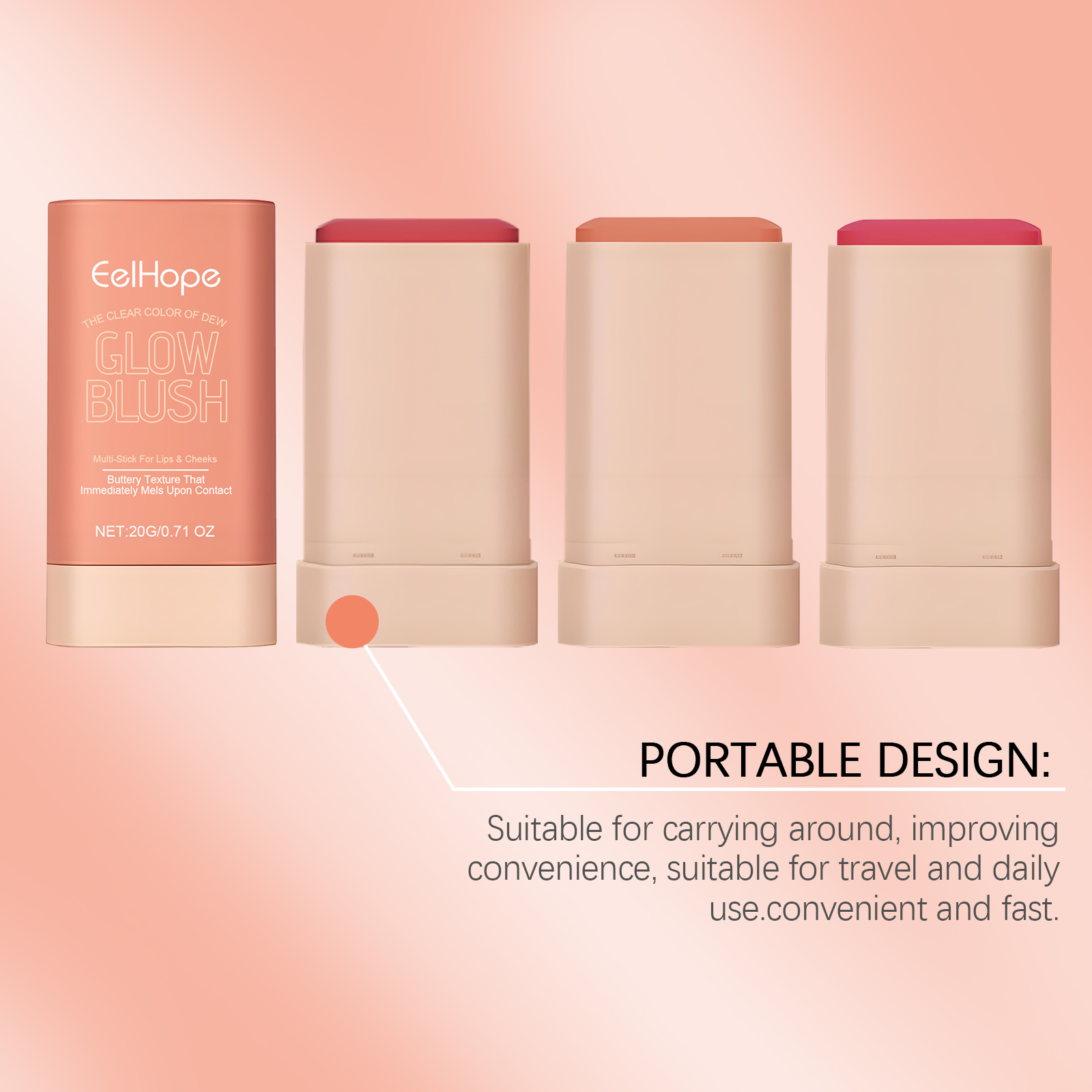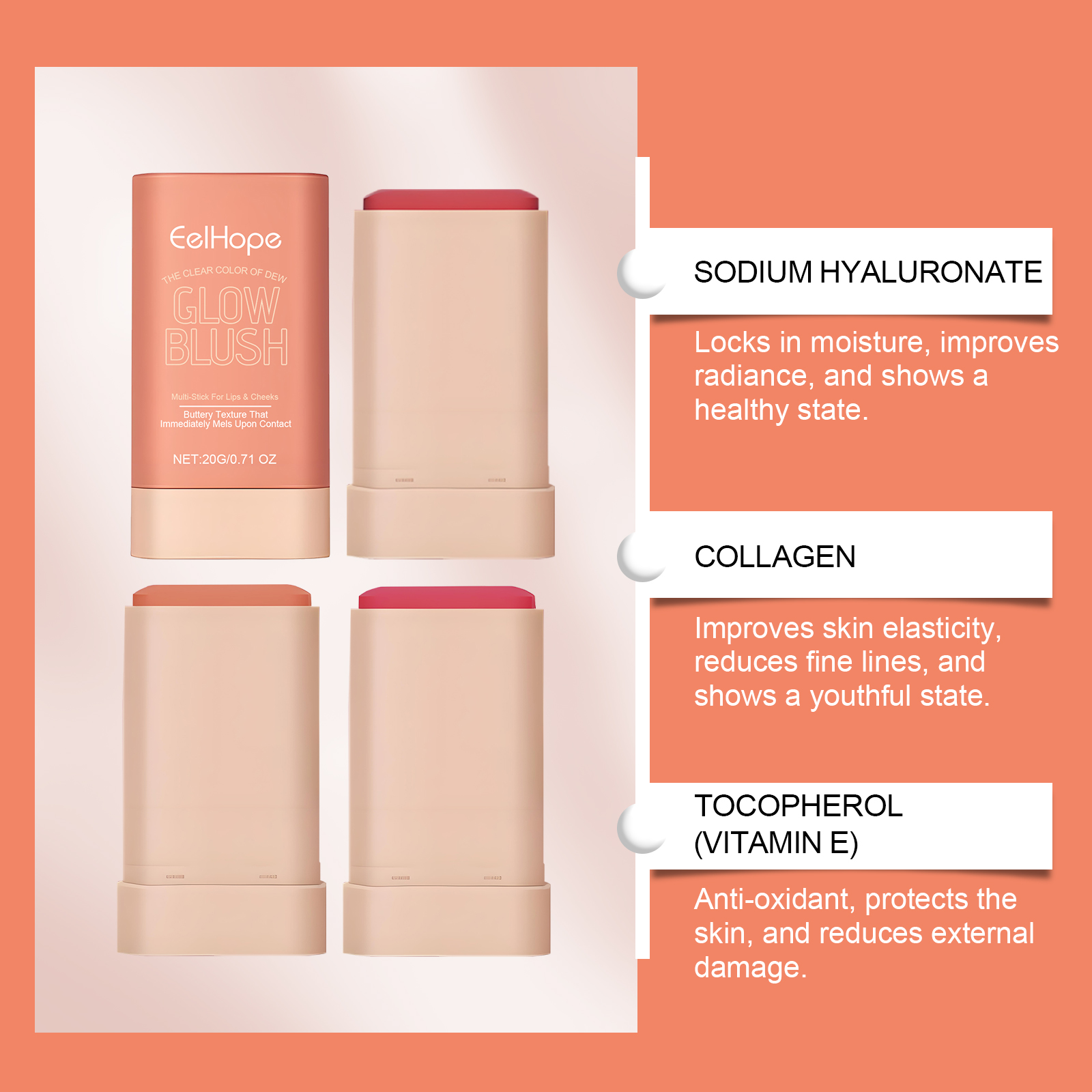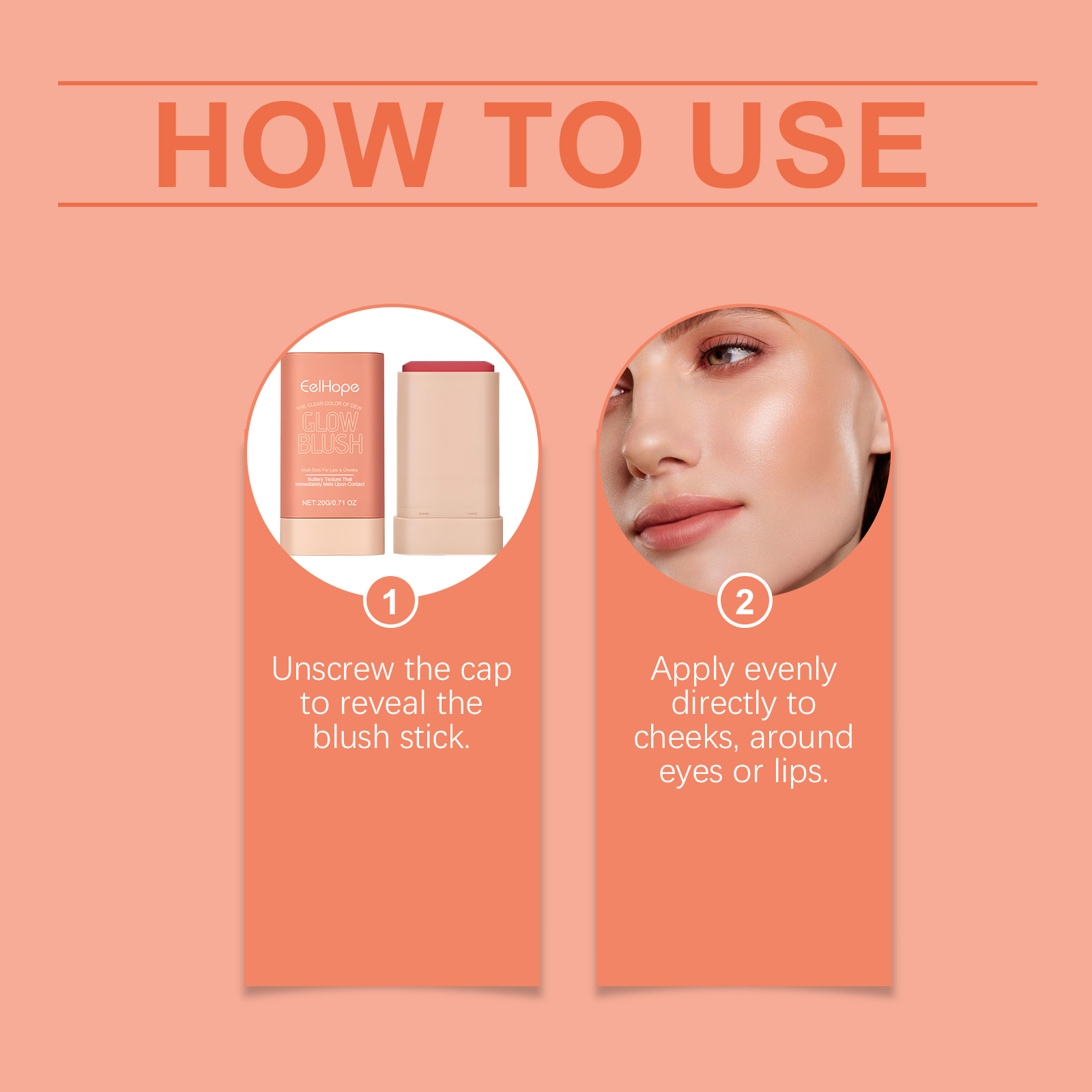 我们的腮红棒含有透明质酸钠、胶原、生育酚(维生素E)。它可以多效合一,方便快捷,适用于唇部、眼部和腮红。它的使用方法很简单:拧开盖子以露出腮红棒。直接均匀涂抹于脸颊、眼睛或嘴唇周围。并且色泽持久,彰显魅力,迎合不同场合。