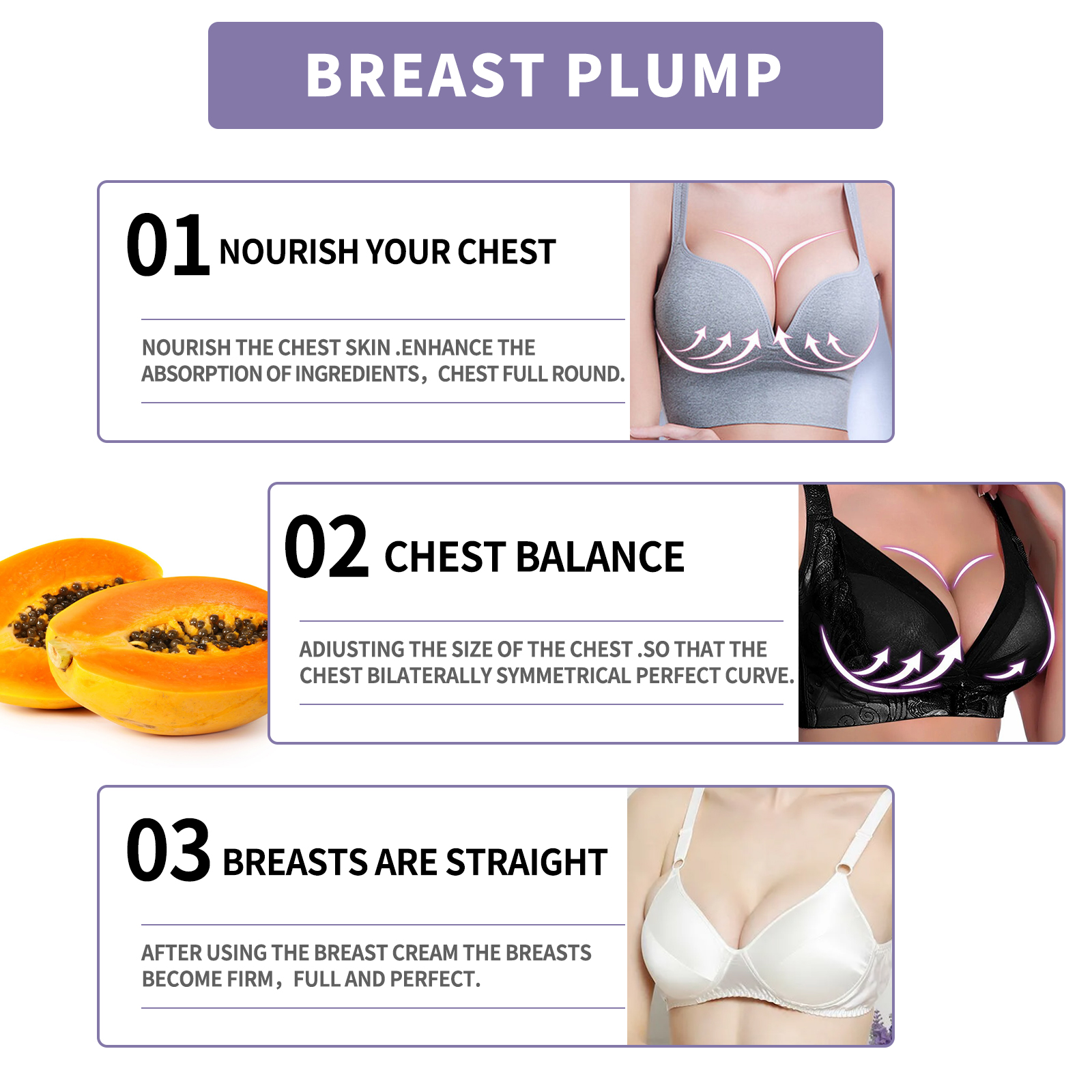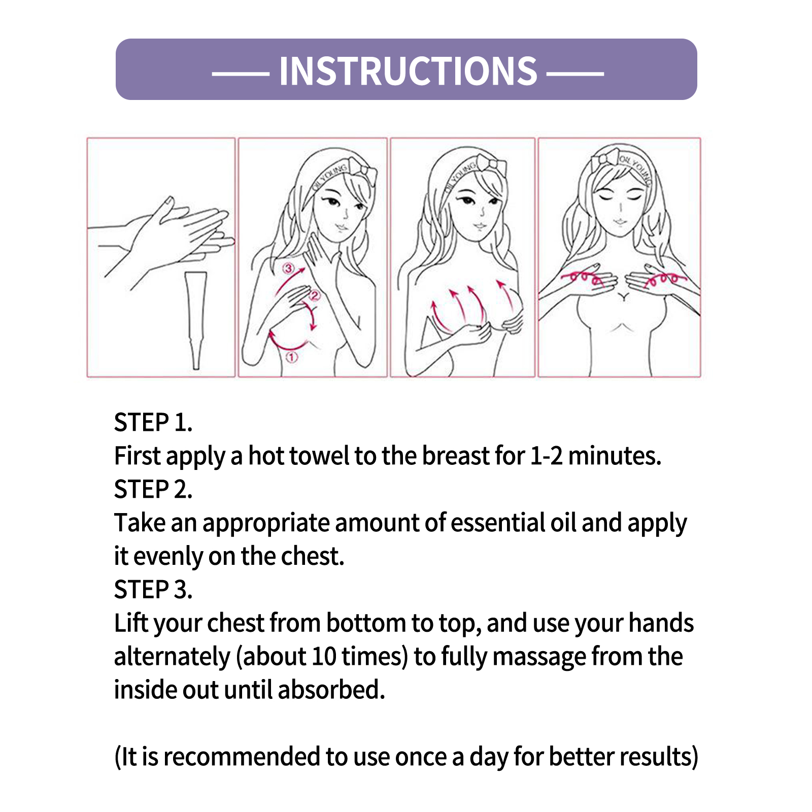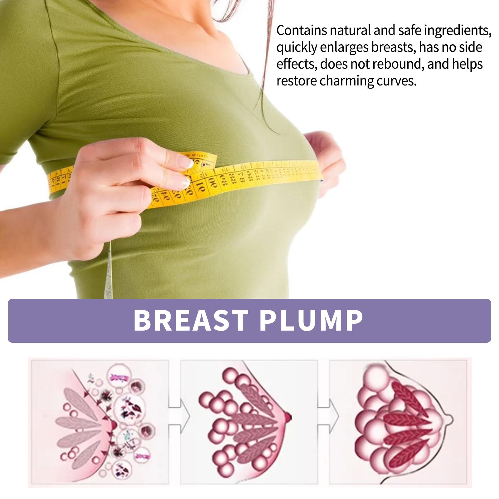 我们的胸部按摩精油,由木瓜提取物、啤酒花、透明质酸钠精心调配而成。专为血液循环和淋巴循环设计。使用方法极为便捷:首先,用热毛巾敷在乳房上1-2分钟。取适量精油,均匀涂抹于胸部。从下到上抬起胸部,并交替使用双手(大约10次)从内向外充分按摩,直到吸收。并且可以通过调节不同组织细胞的代谢活动,促进乳房发育。