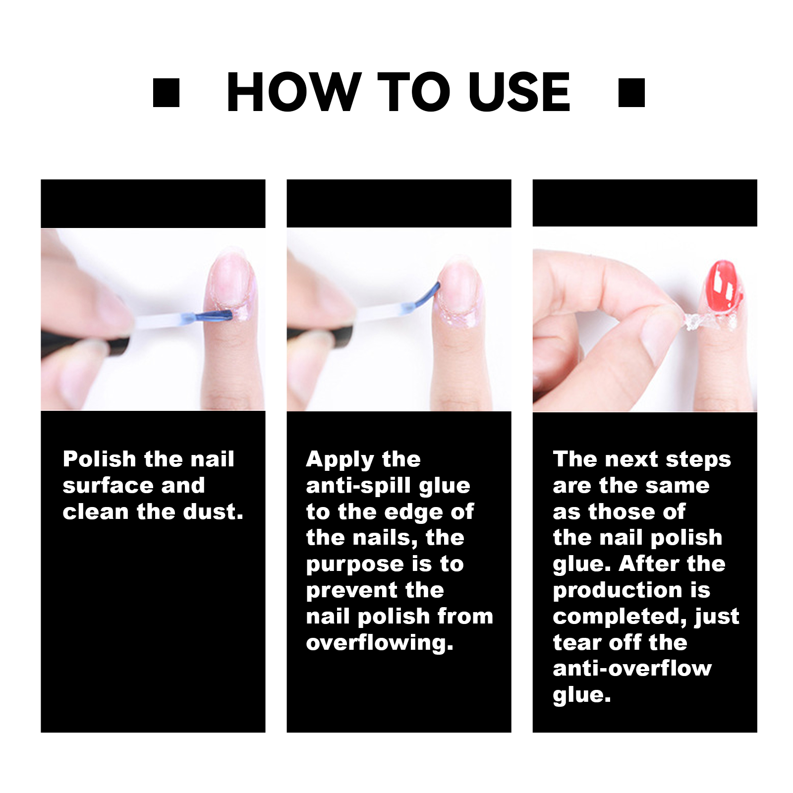 我们的美甲防溢胶含有乳胶。它可以有效防止指甲油弄花。它的使用方法很简单:擦亮指甲表面,清除灰尘。将防漏胶涂在指甲边缘,目的是防止指甲油溢出接下来的步骤和指甲油胶的步骤是一样的,制作完成后,只需撕掉防溢胶即可。并且可以温和配方保护手指皮肤,防止劣质指甲油伤害皮肤。