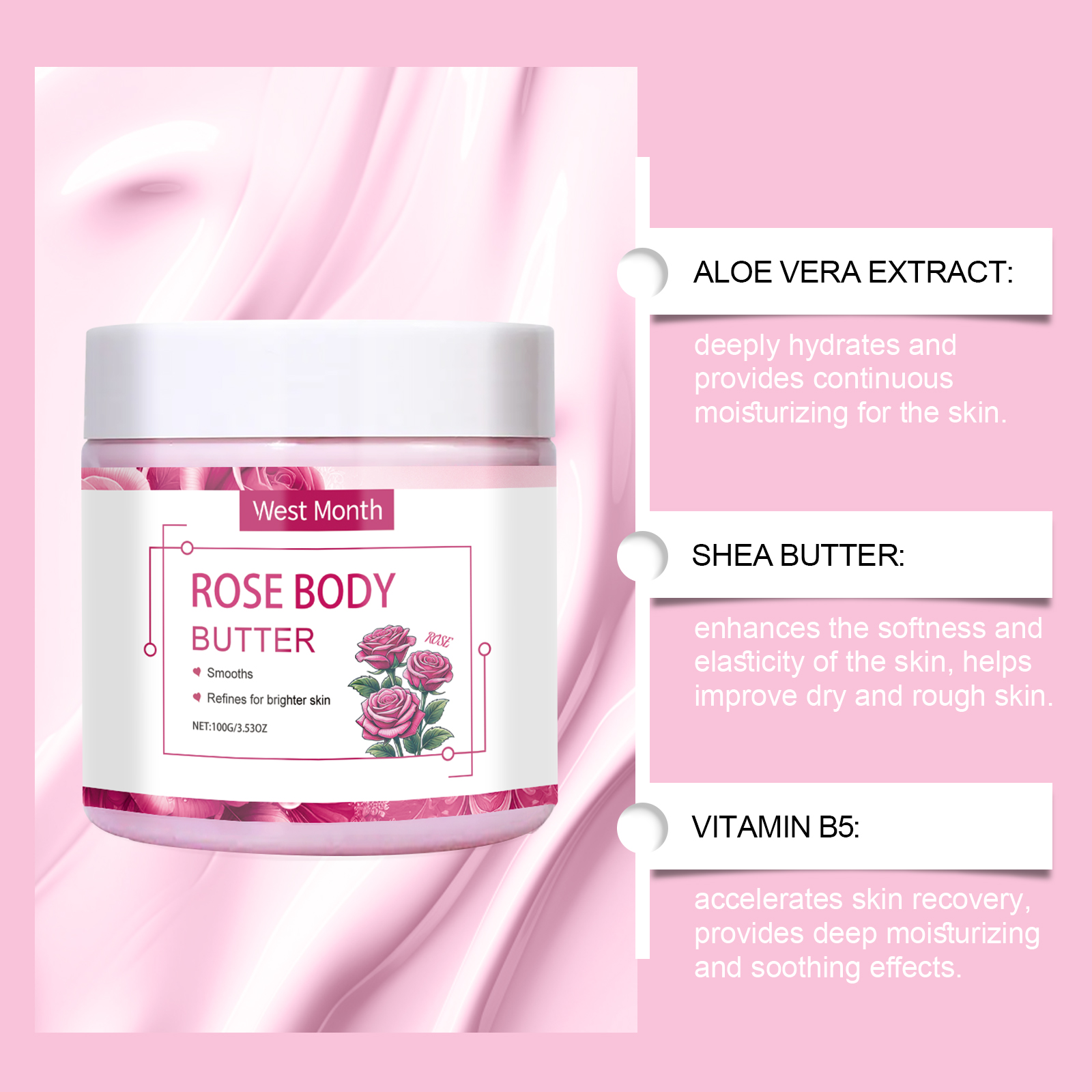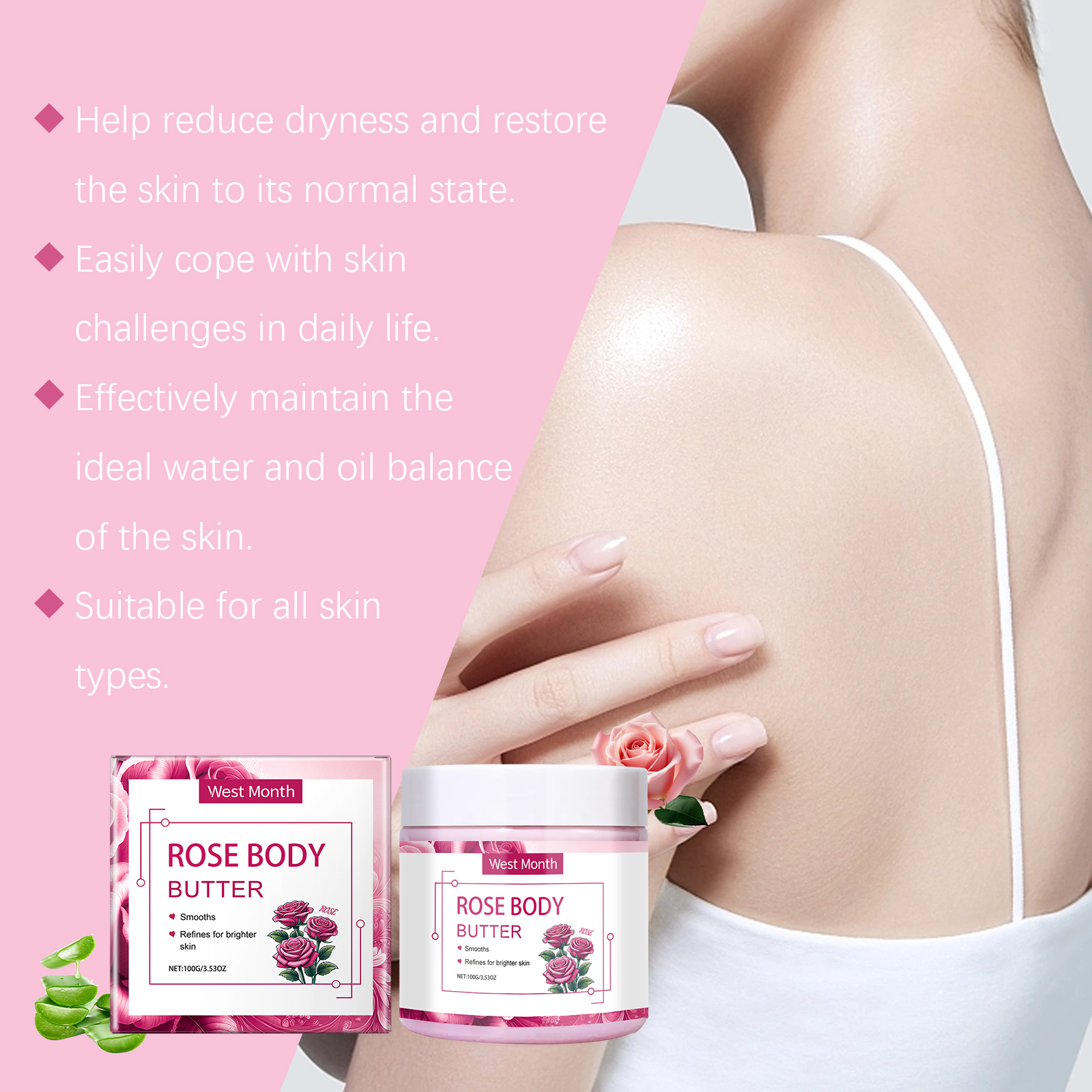 我们的润肤身体乳霜含有芦荟叶提取物、乳木果油。它可以持续释放水分,深入肌肤。有效减少粗糙质地,恢复肌肤细腻触感。它的使用方法很简单:清洁皮肤。取适量本品均匀涂抹于身体肌肤。轻轻打圈按摩,促进吸收。并且可以加强肌肤抵抗外界环境的能力。
