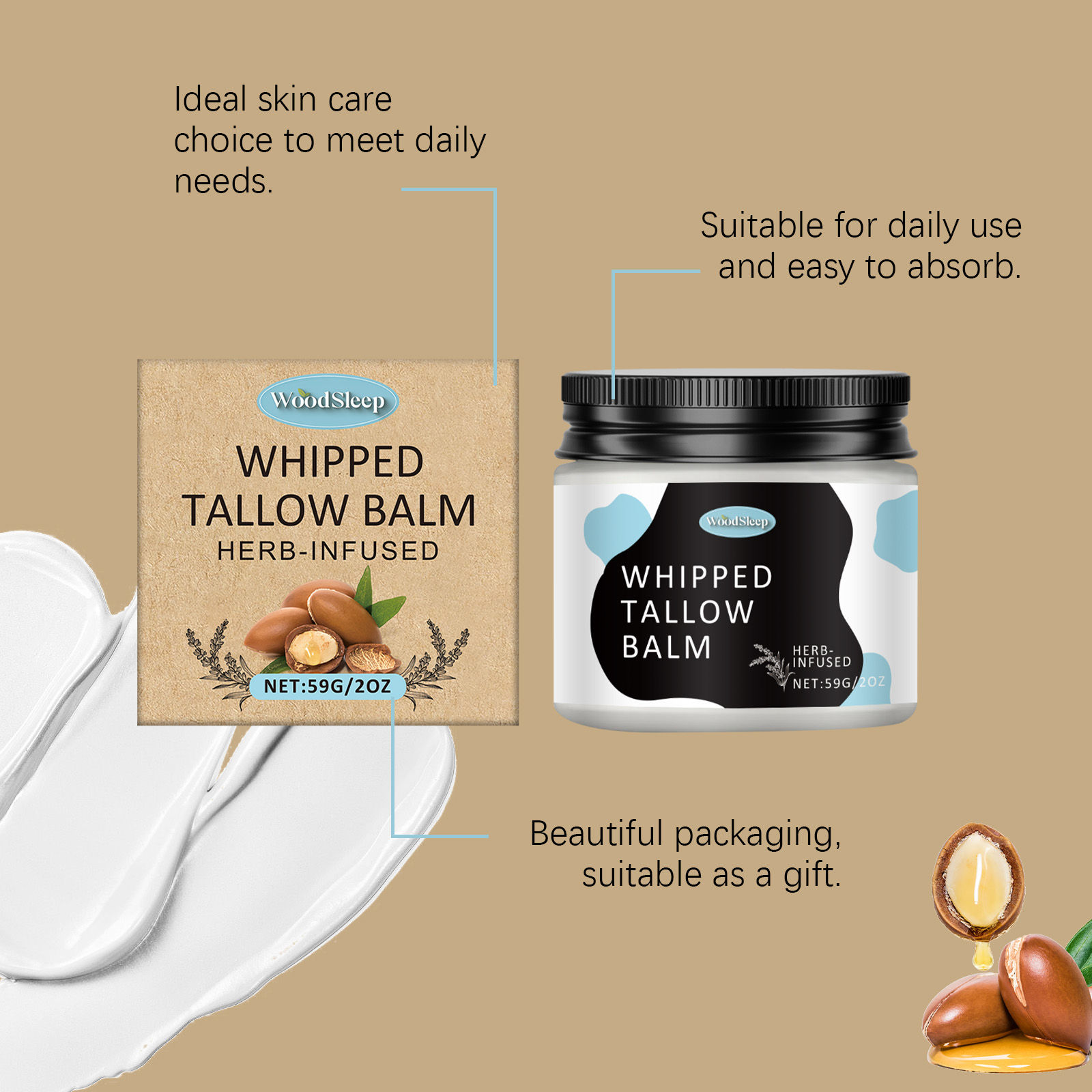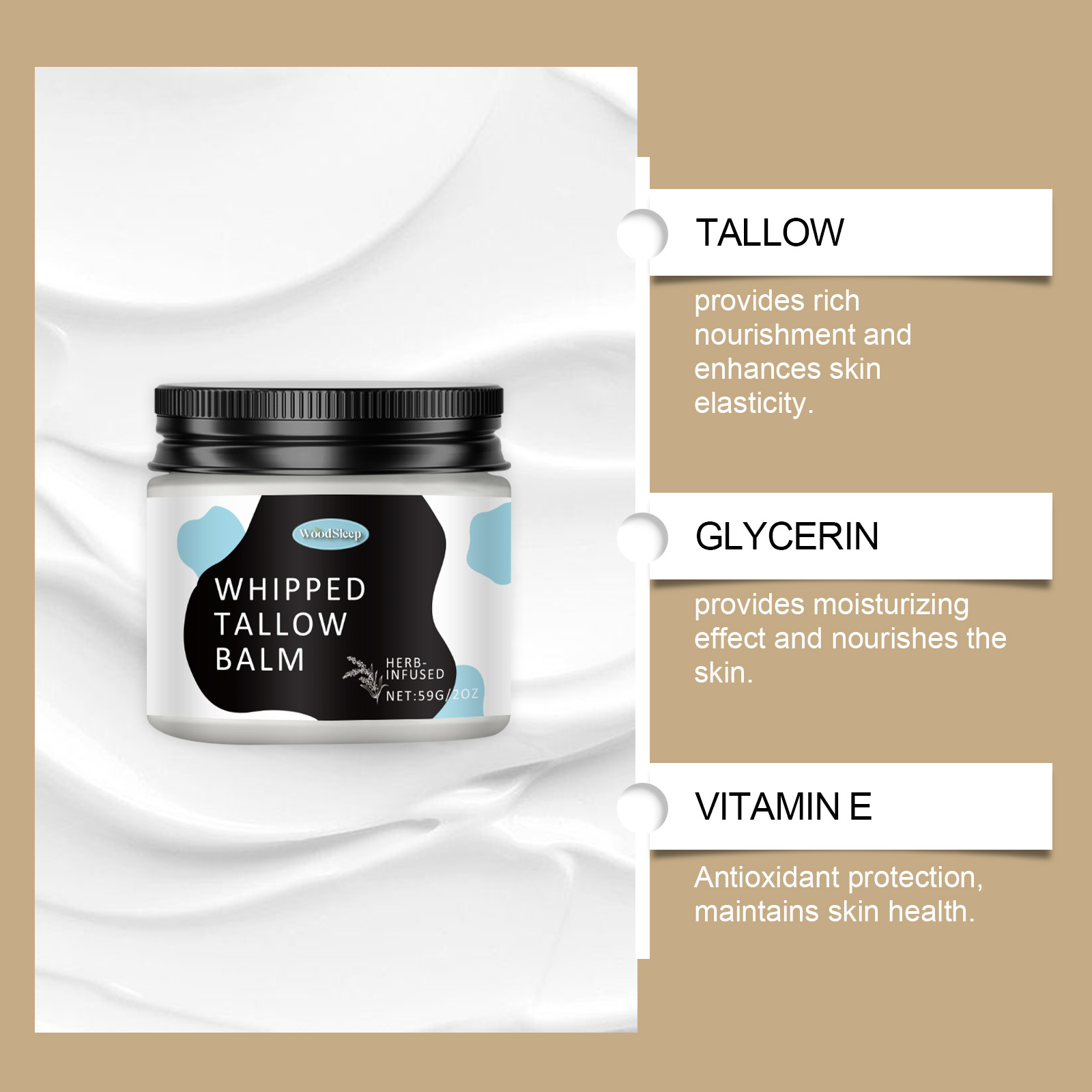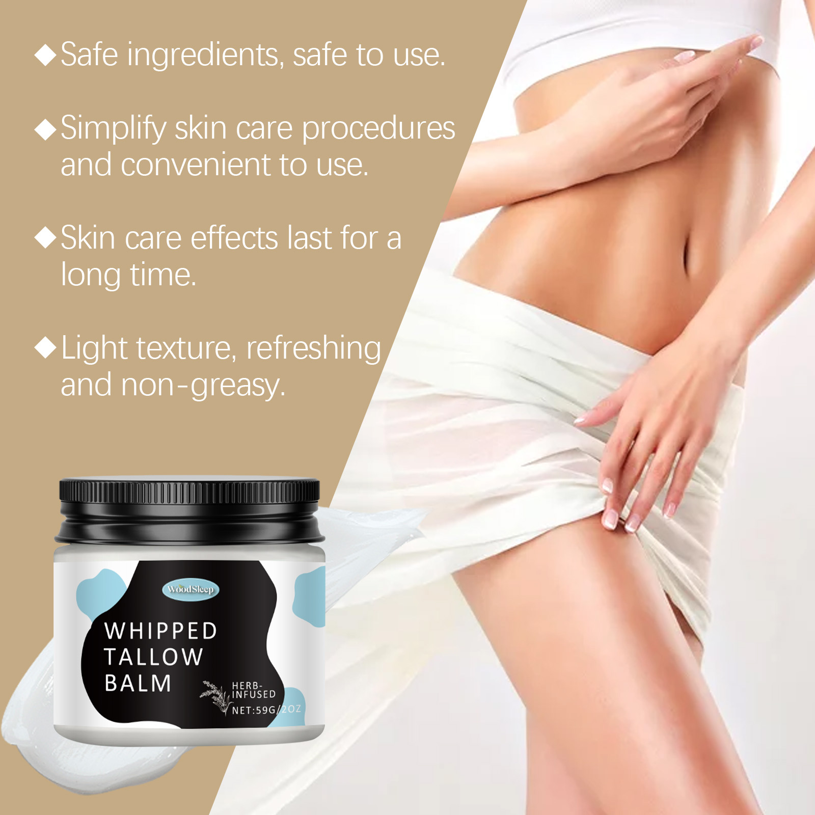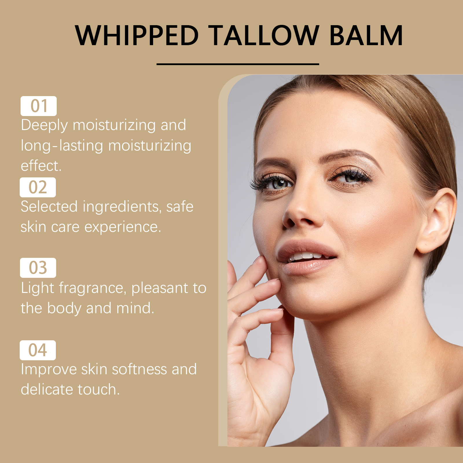 我们的多功能牛脂膏含有牛脂、霍霍巴籽油。它可以持续滋润,令肌肤光滑细腻。成分温和,增强使用体验。它的使用方法很简单:清洁身体和面部皮肤,保持皮肤干燥,取适量本品均匀涂抹于面部及身体肌肤,轻轻按摩至完全吸收。并且可以适合多种肤质,使用无忧。