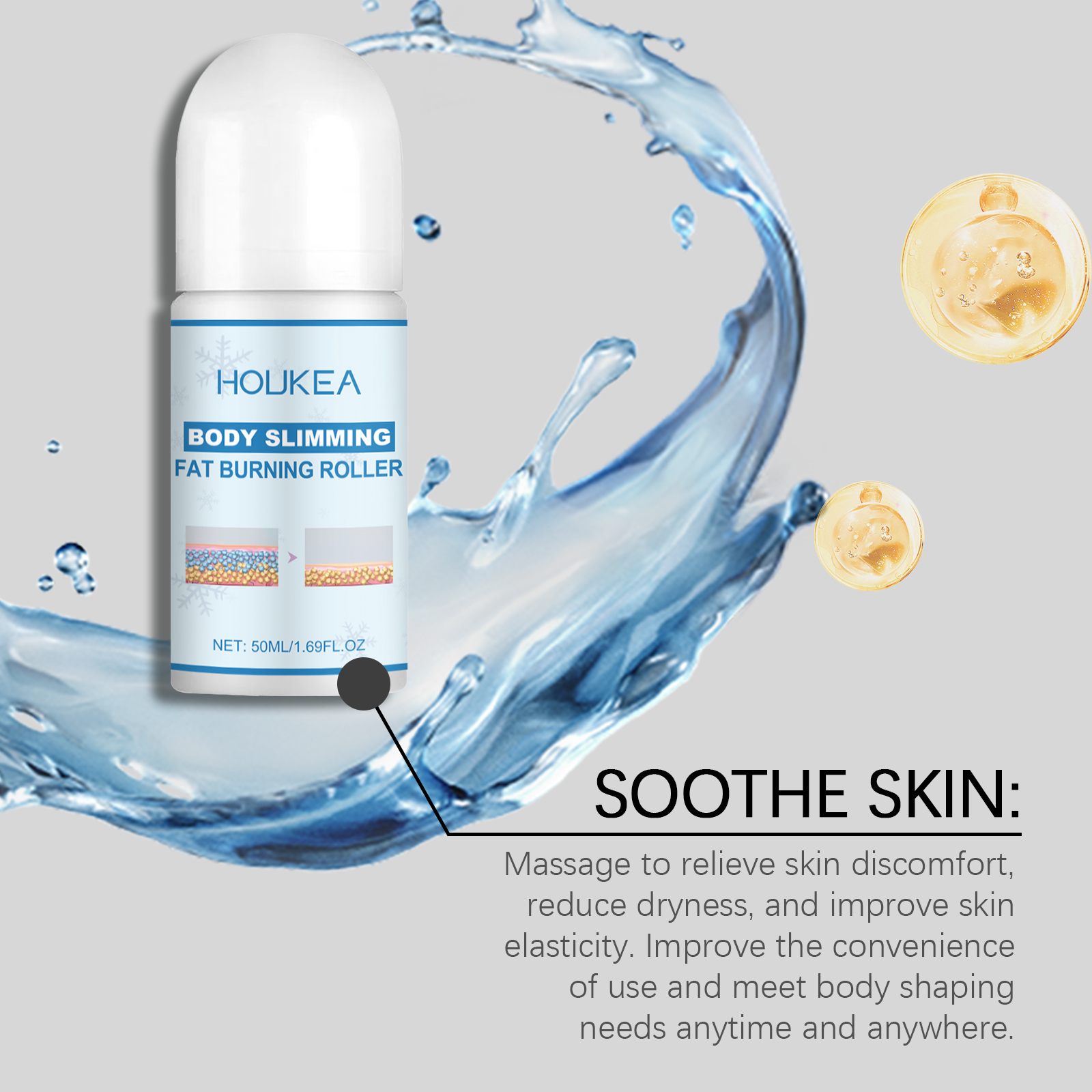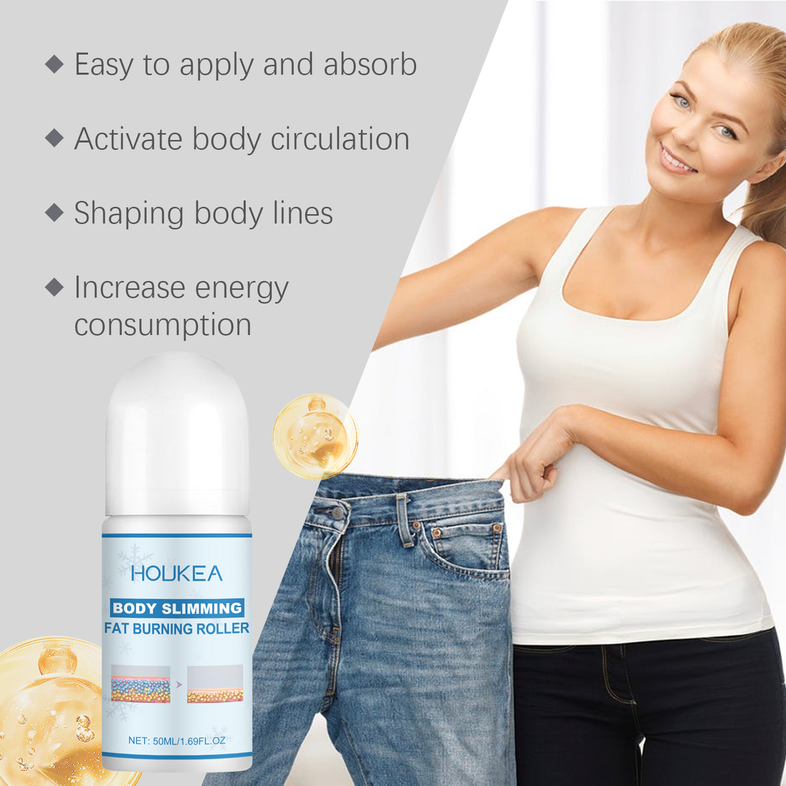 我们的塑身燃脂滚珠含有甘油、羟乙基纤维素、乙基己基甘油。它可以减少脂肪和堆积的脂肪,展现美丽的线条。轻松减少皮肤松弛问题,创造健康的皮肤感觉。它的使用方法很简单:清洁你的皮肤,将产品轻柔地卷在需要紧致塑形的肌肤区域,等待吸收。并且可以帮助活化局部循环,减少脂肪堆积,优化皮肤状态。