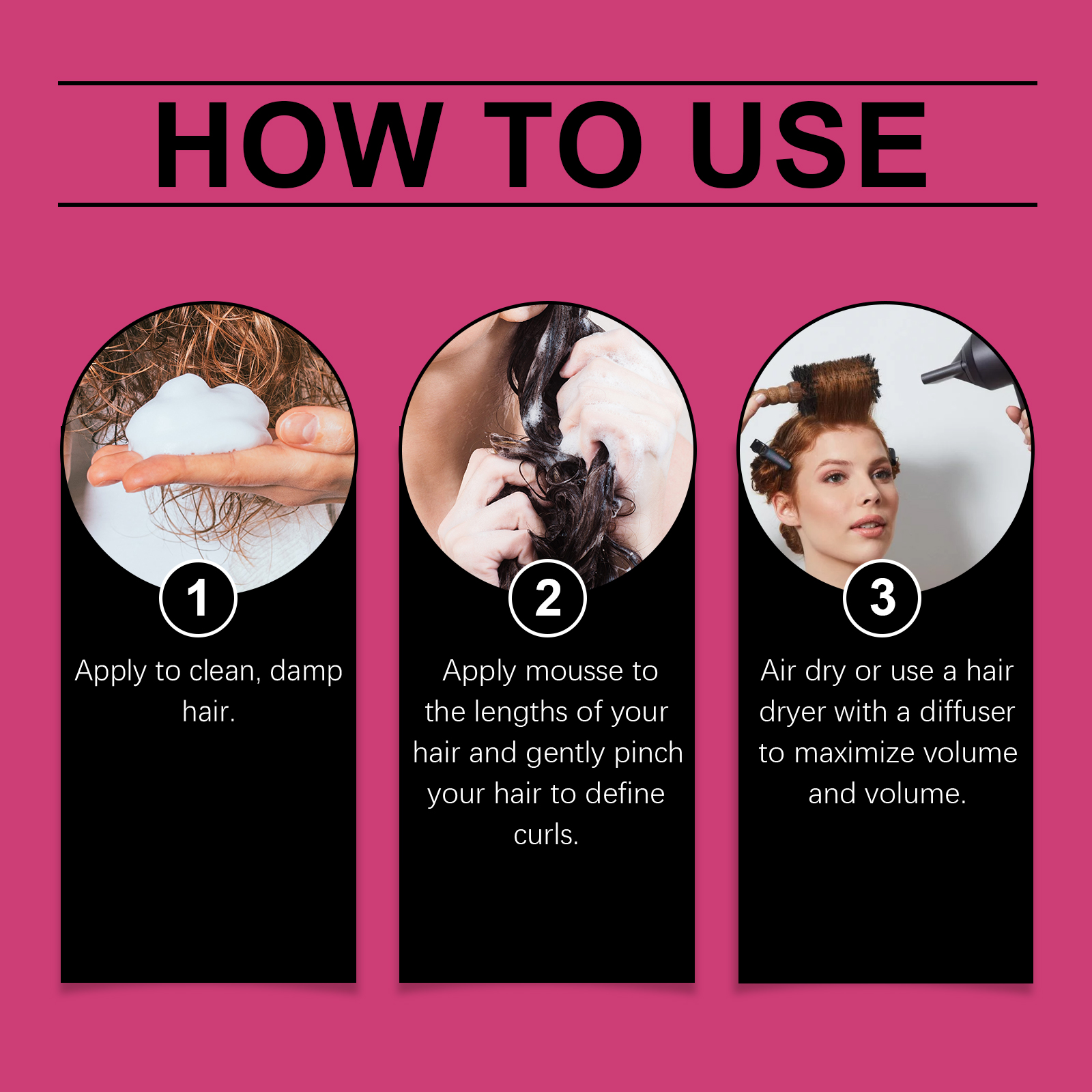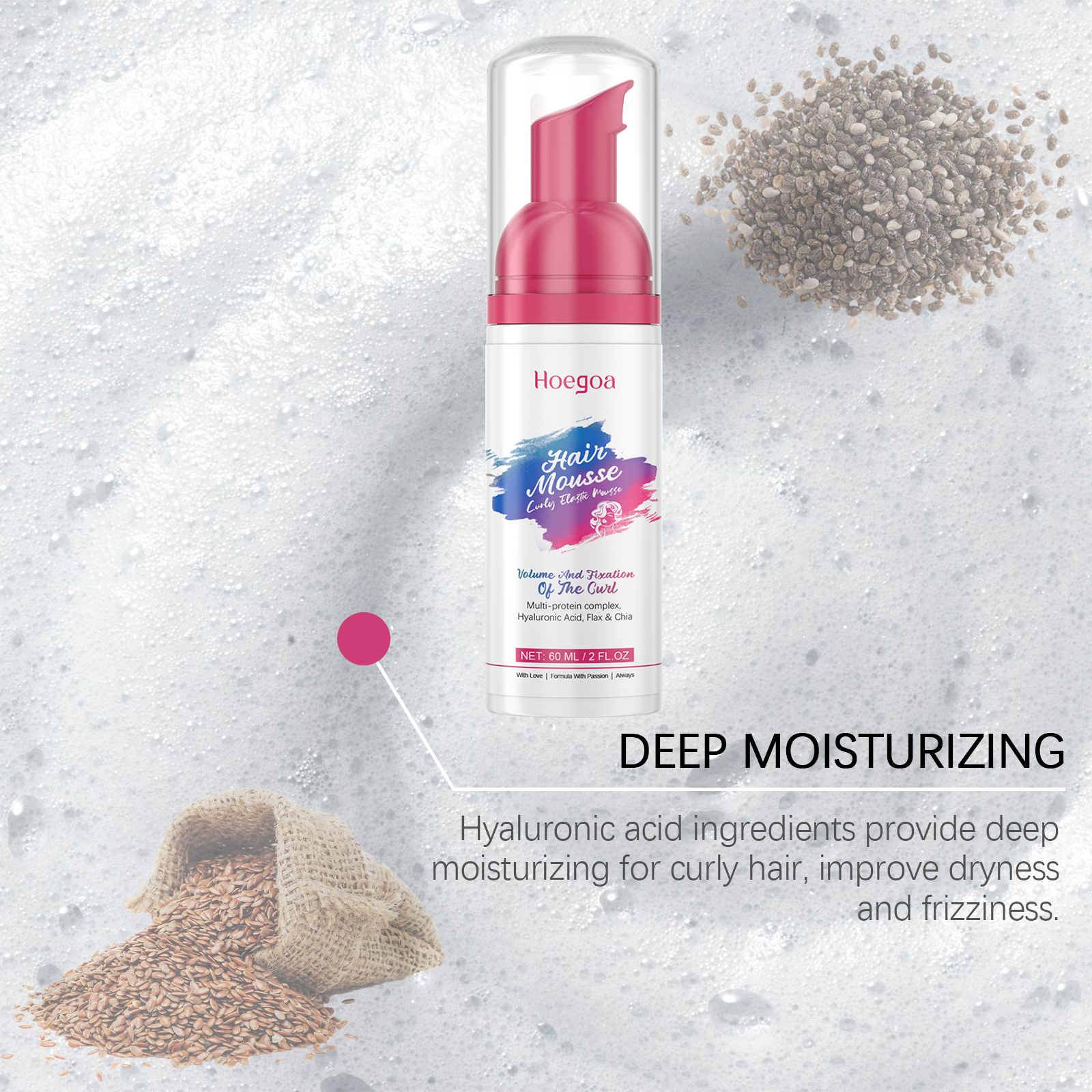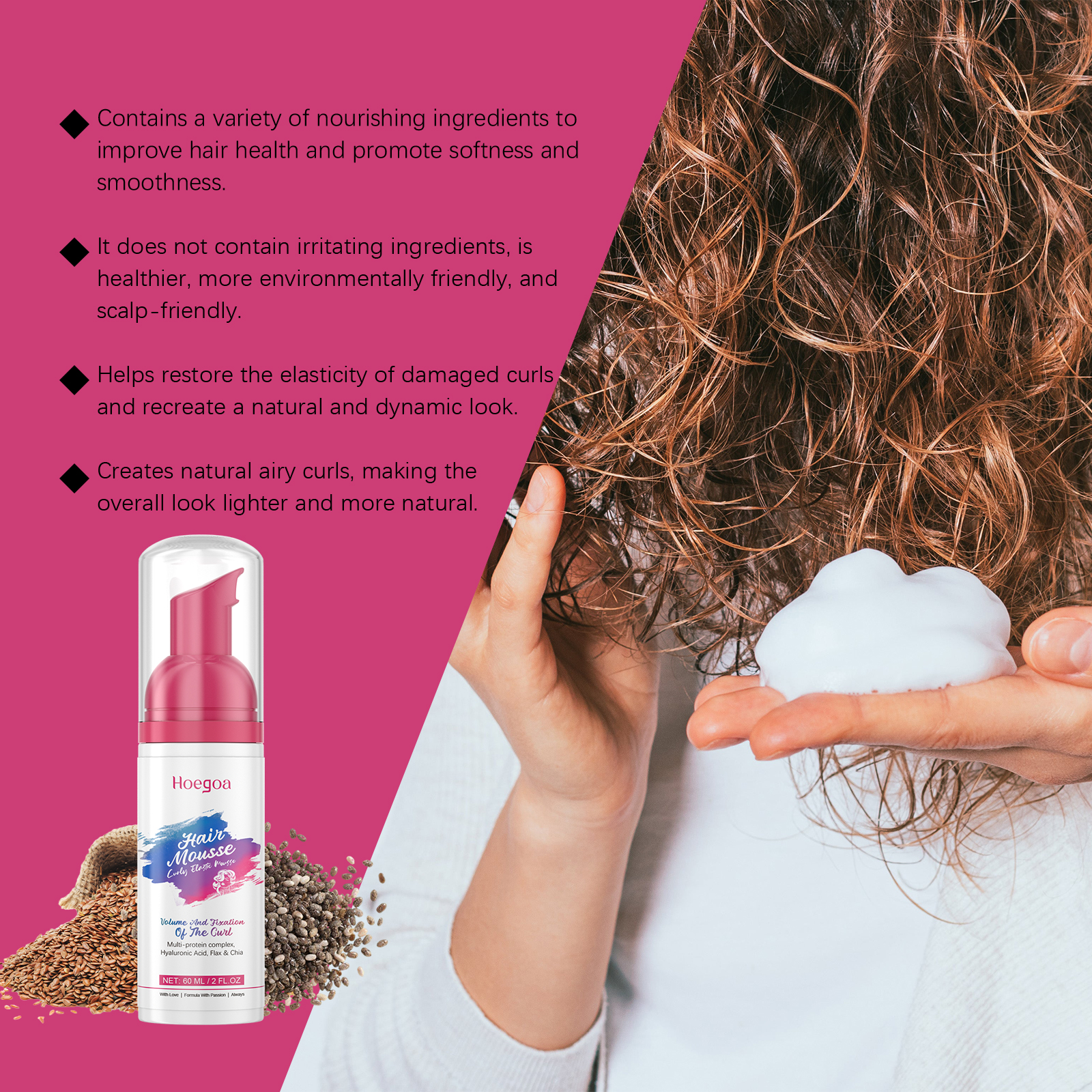我们的卷发弹力慕斯含有水解角蛋白、胶原蛋白、奇亚籽。它可以使卷发自然弹性,同时增加蓬松的感觉和头发的体积。它的使用方法很简单:在清洁后的湿发上使用。将慕斯涂抹于发长部分,用手轻捏头发以定义卷度。可选择自然风干或使用带扩散器的吹风机以最大化头发的蓬松感和体积。并且可以锁住卷发形状,提供持久的造型效果,不粘腻不僵硬。