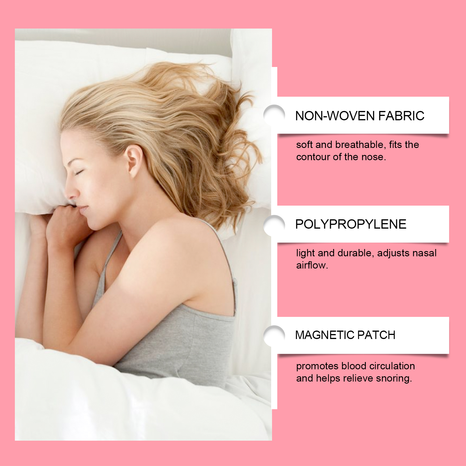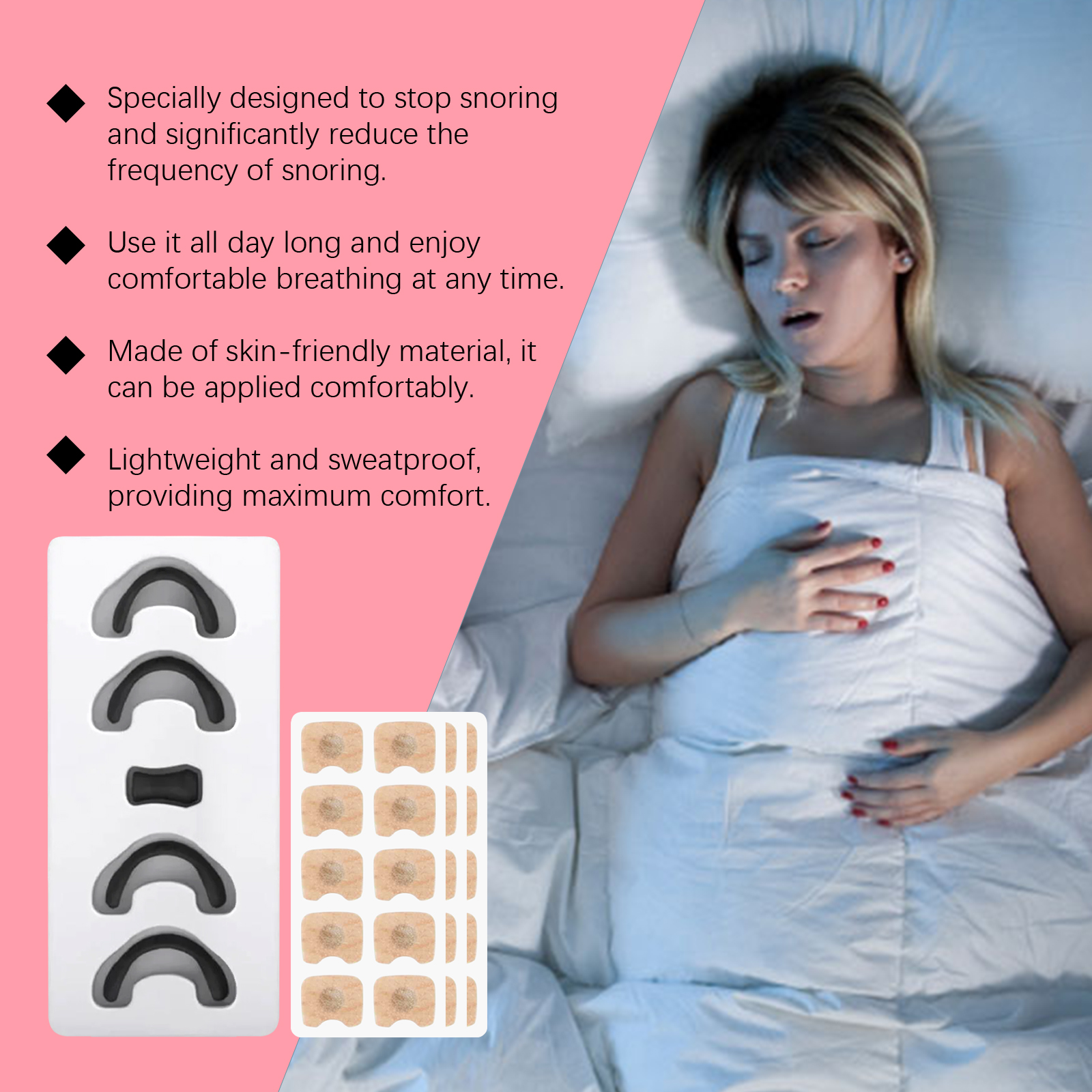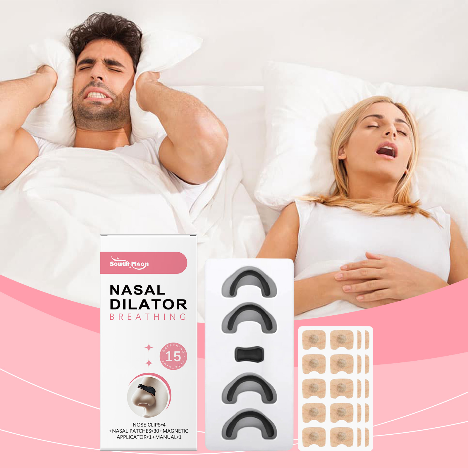 我们的鼻部护理套装含有无纺布、聚丙烯。它可以符合人体工程学设计,穿着舒适,使用方便。适用于各种场景,如睡眠和运动,以提高呼吸舒适度。它的使用方法很简单:彻底清洁并擦干鼻部区域的皮肤使用磁吸器吸住鼻贴,撕掉鼻贴背面的保护膜将鼻贴贴于一侧鼻翼上,按压并抚平鼻贴,然后在另一侧重复上述操作。最后,用鼻夹将贴片夹紧,固定在鼻子上。并且可以显著减少打鼾,改善睡眠质量。