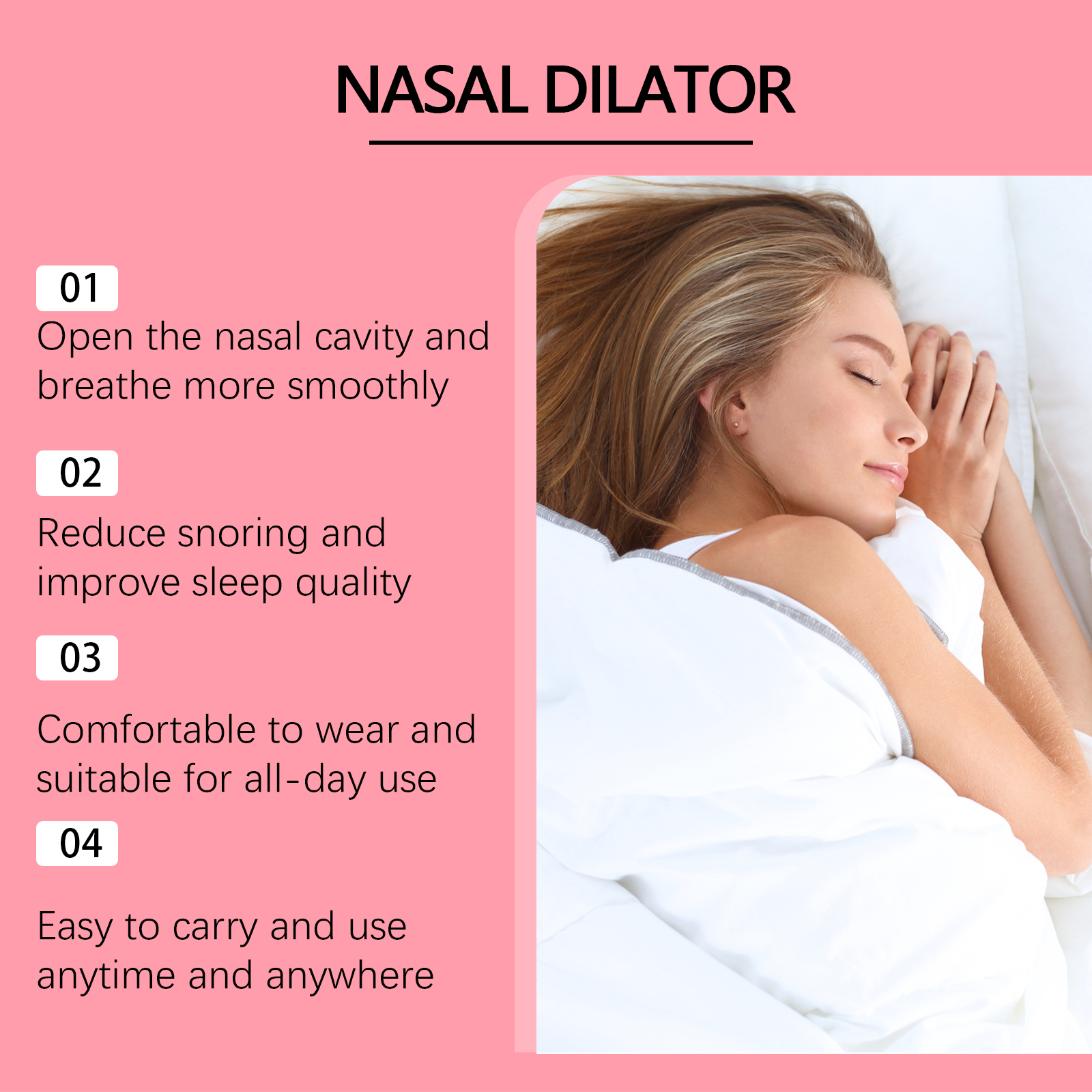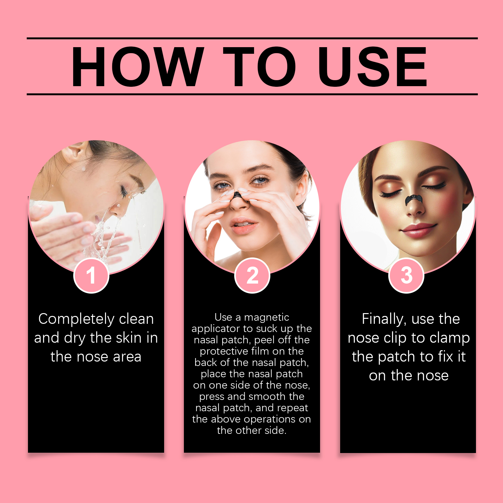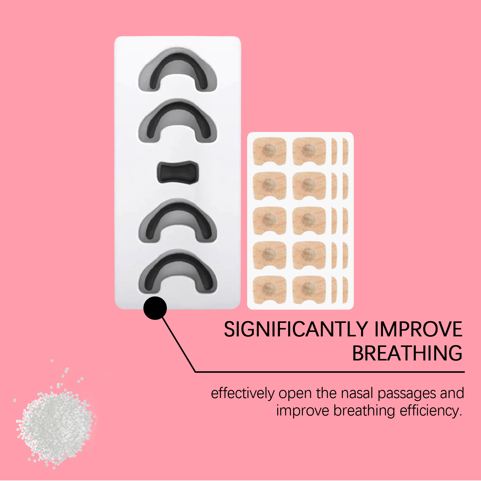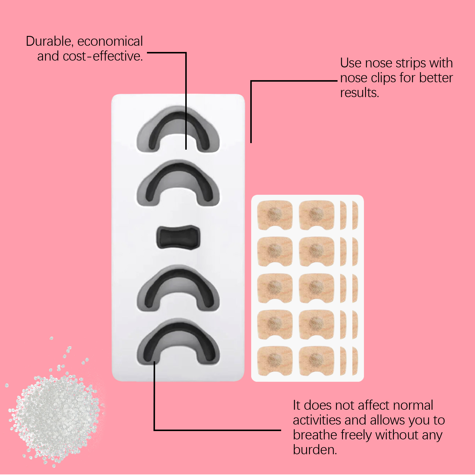 我们的鼻部护理套装含有无纺布、聚丙烯。它可以符合人体工程学设计,穿着舒适,使用方便。适用于各种场景,如睡眠和运动,以提高呼吸舒适度。它的使用方法很简单:彻底清洁并擦干鼻部区域的皮肤使用磁吸器吸住鼻贴,撕掉鼻贴背面的保护膜将鼻贴贴于一侧鼻翼上,按压并抚平鼻贴,然后在另一侧重复上述操作。最后,用鼻夹将贴片夹紧,固定在鼻子上。并且可以显著减少打鼾,改善睡眠质量。