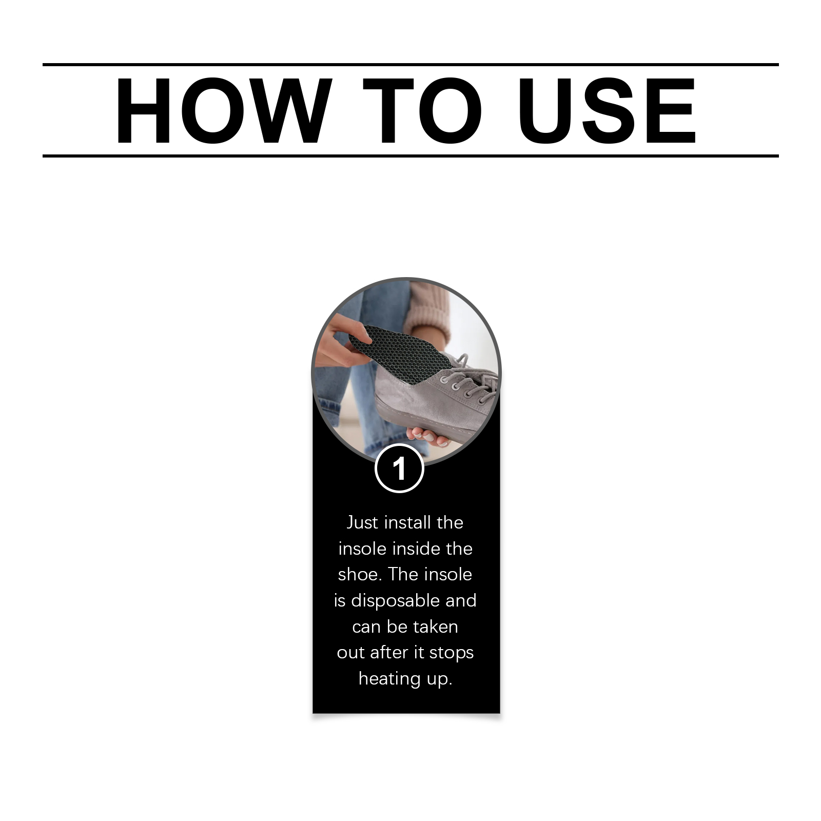 我们的自热鞋垫含有吸水性树脂、食盐、艾草提取物。它可以迅速启动,让您在寒冷的天气中保持舒适。它的使用方法很简单:只需将鞋垫安装在鞋内。鞋垫是一次性的,在停止发热后可以取出。并且可以全天候保暖护理,稳定可靠。