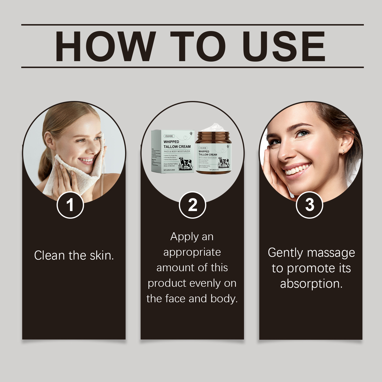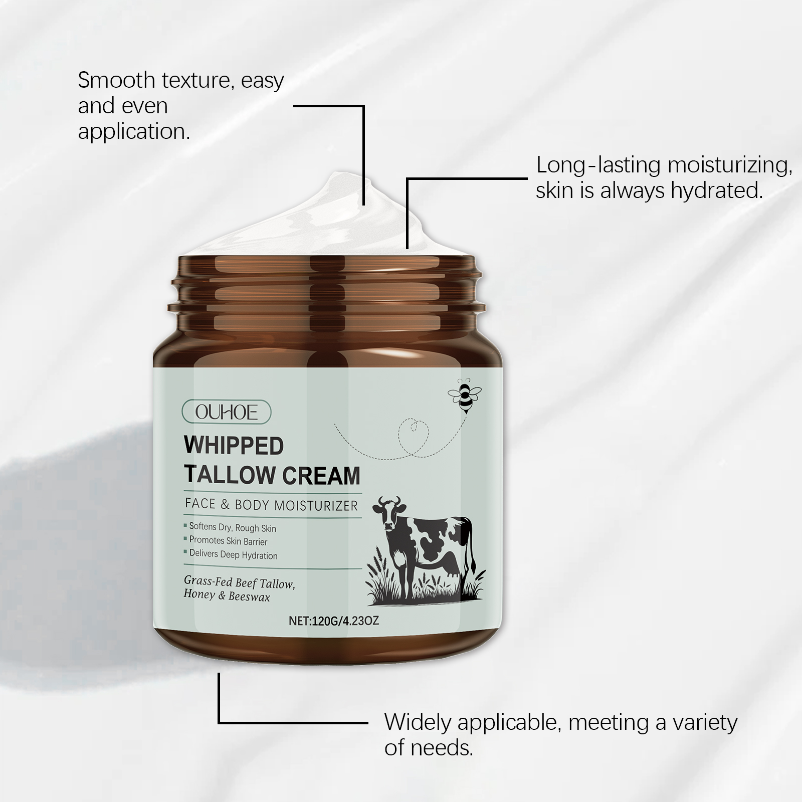 我们的牛脂保湿润肤霜含有甘油、甘油硬脂酸酯。它可以为肌肤提供外界保护,阻隔不良环境因素。深入肌肤,缓解肌肤干燥,恢复肌肤水分。它的使用方法很简单:清洁皮肤。取适量本品均匀涂抹于面部及身体。轻轻按摩,促进其吸收。并且可以使肌肤焕发光彩,呈现健康光彩的容貌。