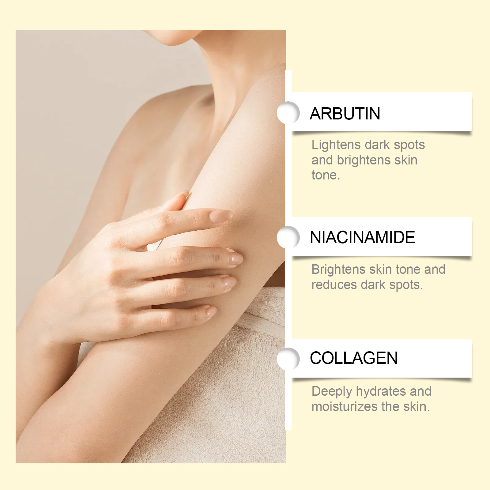 我们的身体保湿霜含有甘油、甘油硬脂酸酯。它可以减少暗斑的形成均匀出肤色并改善不均匀的肤色。刺激胶原蛋白茁壮成长,增加肌肤弹性,焕发青春光彩。它的使用方法很简单:清洁皮肤并保持干燥。取适量本品均匀涂抹于面部、腋窝、手、腿等肌肤。轻轻按摩直至吸收。并且可以锁住水分,长期保持肌肤滋润光滑,改善肤色暗沉,提亮肤色,让肌肤看起来更健康。