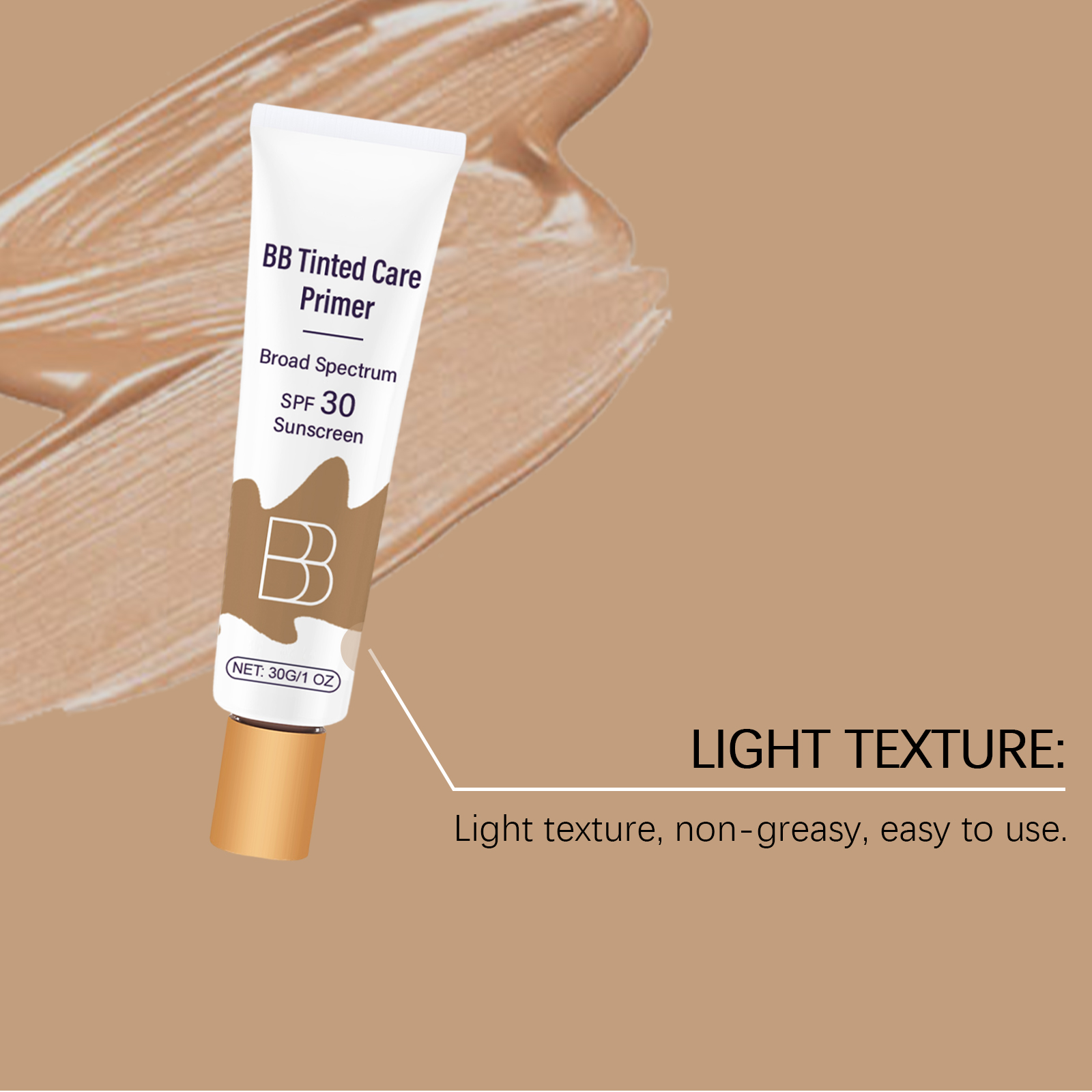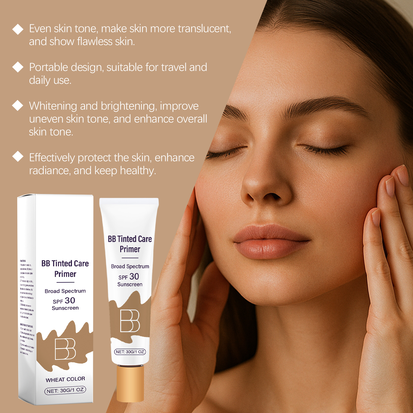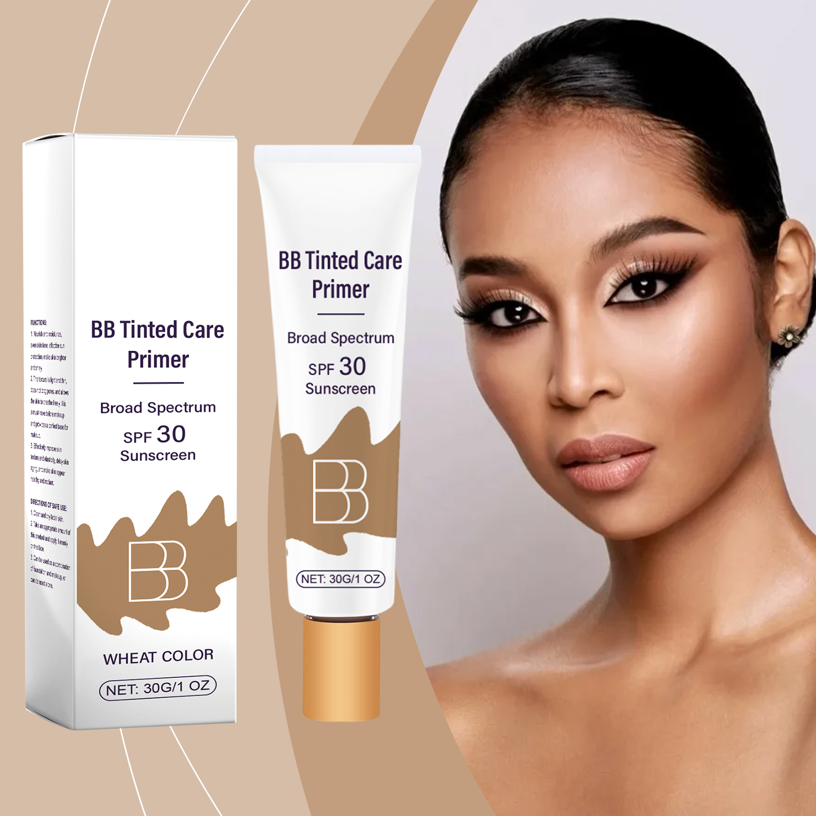 我们的防护BB霜(小麦色)含有烟酰胺、生育酚(维生素E)、霍霍巴籽油。它可以保护皮肤免受紫外线伤害。它的使用方法很简单:清洁和干燥面部皮肤。取适量本品均匀涂抹于面部。可以作为粉底和化妆品的组合使用,也可以单独使用。并且可以增强皮肤光泽并减少干燥。