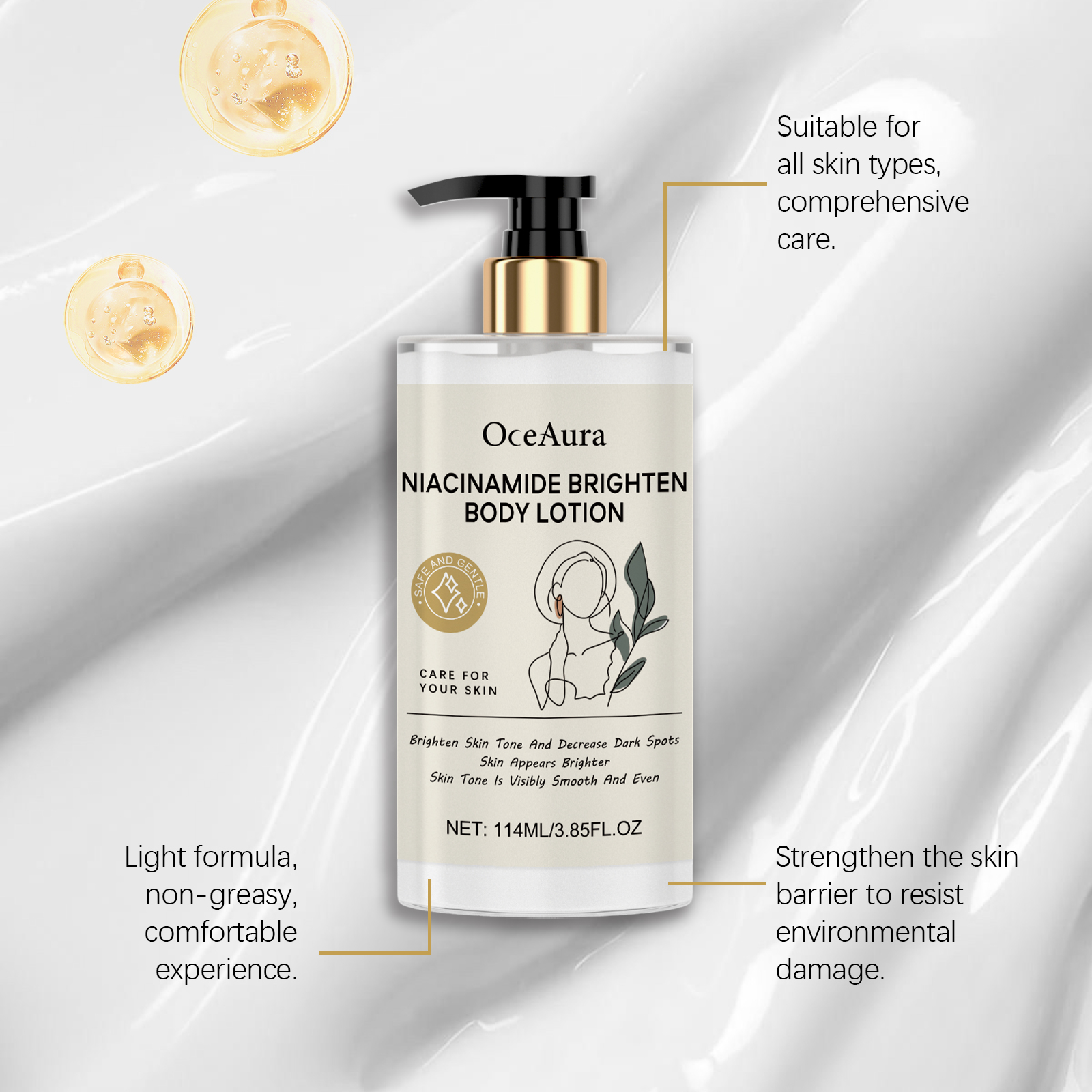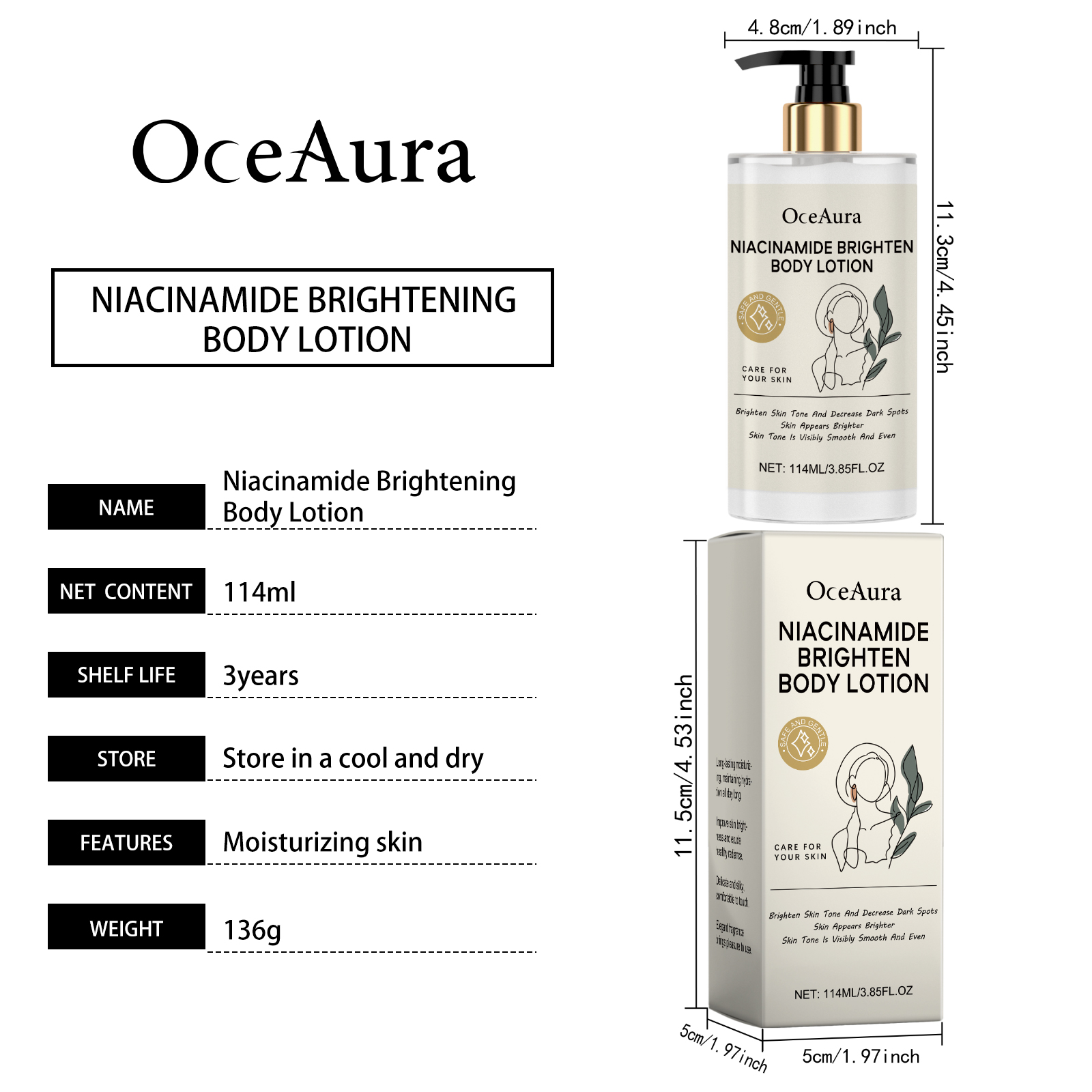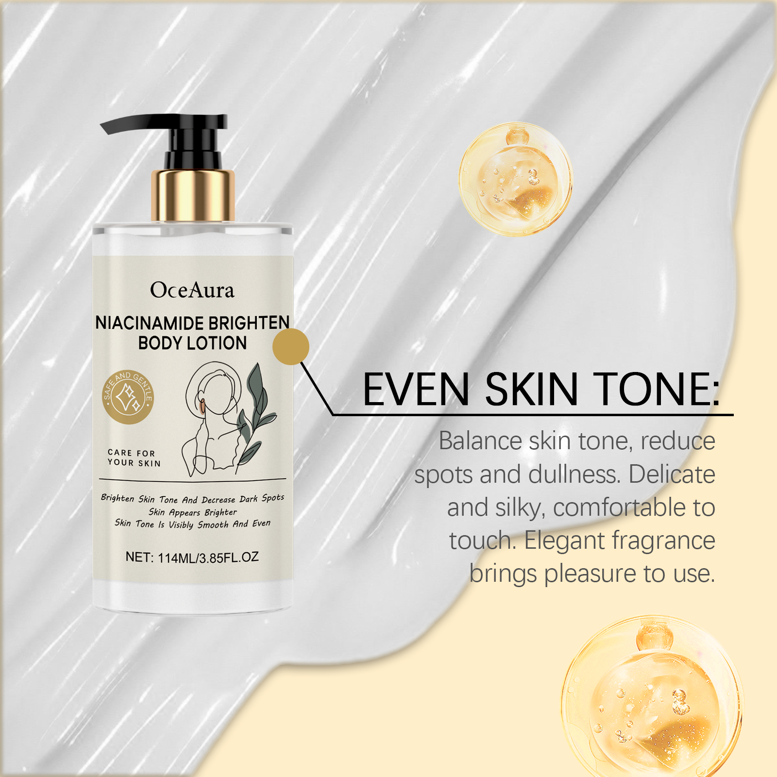 我们的烟酰胺保湿身体乳含有甘油、矿油。它可以显著提亮肤色,显出明亮的光泽。吸收快,立即有滋润感。持续保湿,保持肌肤水润柔软。改善干燥,保持肌肉柔软柔滑。它的使用方法很简单:清洁身体并保持干燥。取适量本品均匀涂抹于身体上。轻轻按摩直至吸收。并且可以抚平细纹,改善肌肤光滑度,深层滋养,提高肌肤弹性,适合日常使用,保养步骤简单。