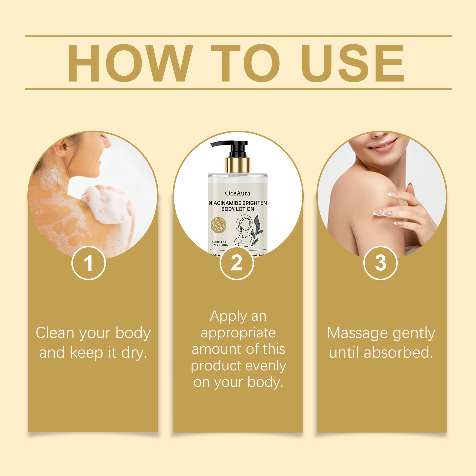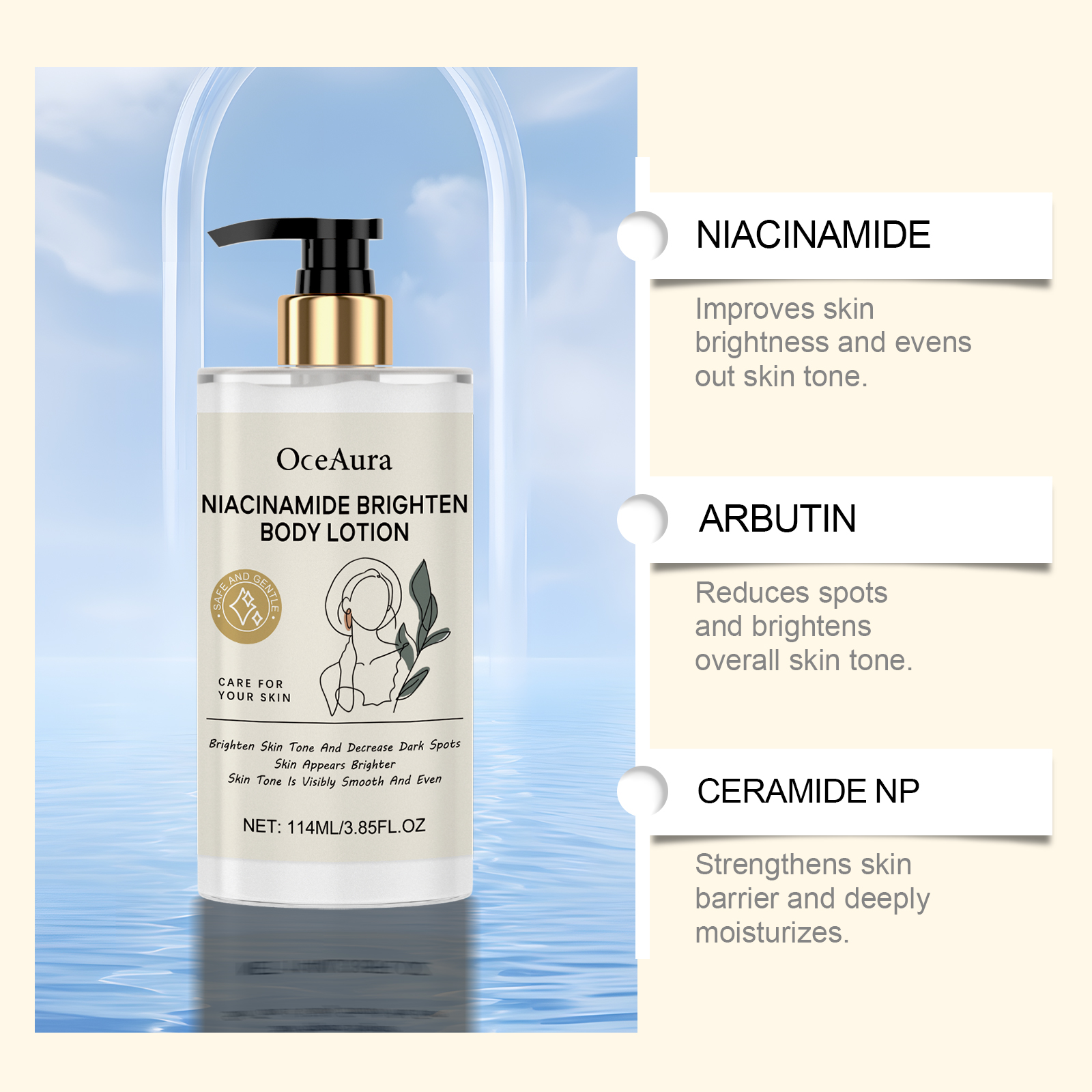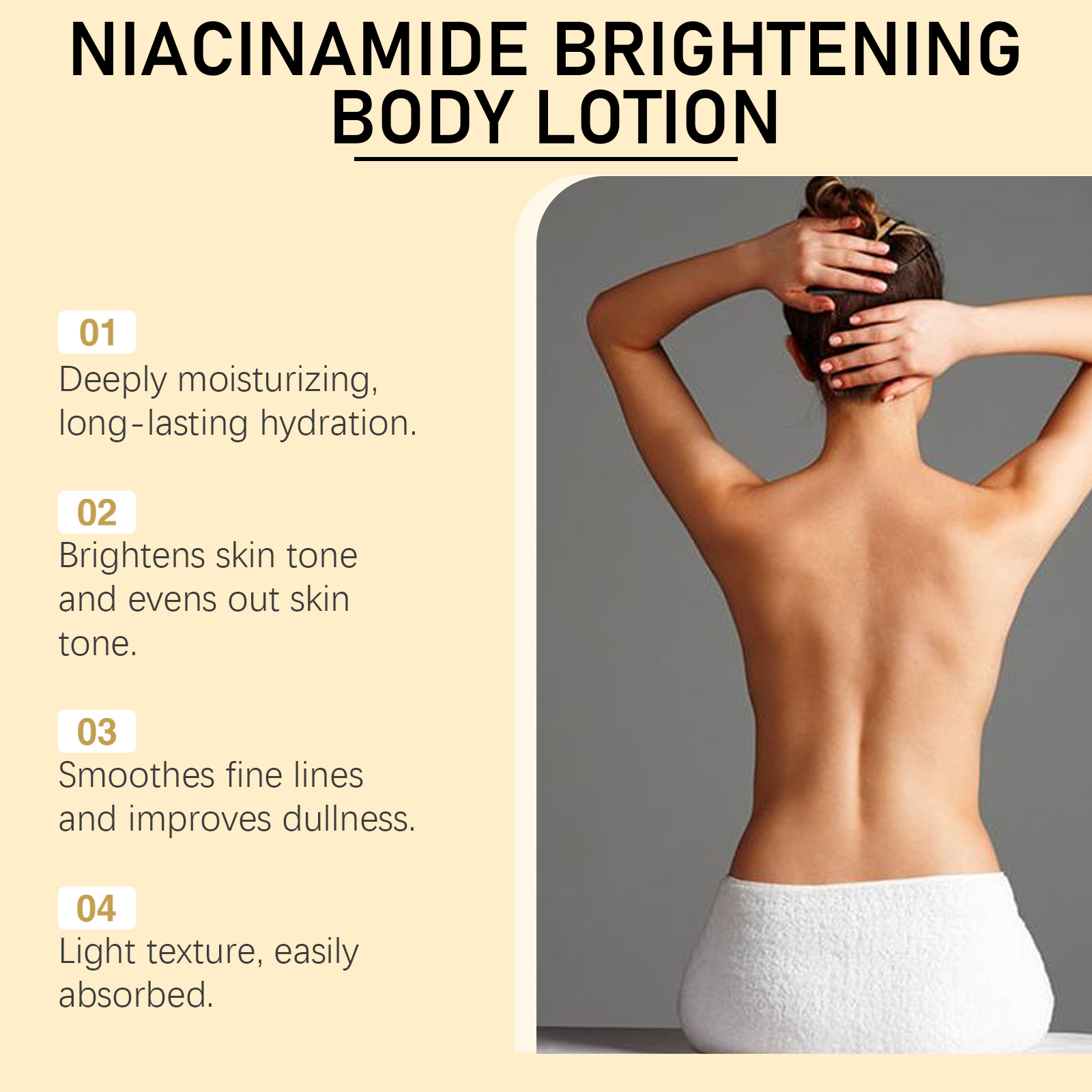 我们的烟酰胺保湿身体乳含有甘油、矿油。它可以显著提亮肤色,显出明亮的光泽。吸收快,立即有滋润感。持续保湿,保持肌肤水润柔软。改善干燥,保持肌肉柔软柔滑。它的使用方法很简单:清洁身体并保持干燥。取适量本品均匀涂抹于身体上。轻轻按摩直至吸收。并且可以抚平细纹,改善肌肤光滑度,深层滋养,提高肌肤弹性,适合日常使用,保养步骤简单。