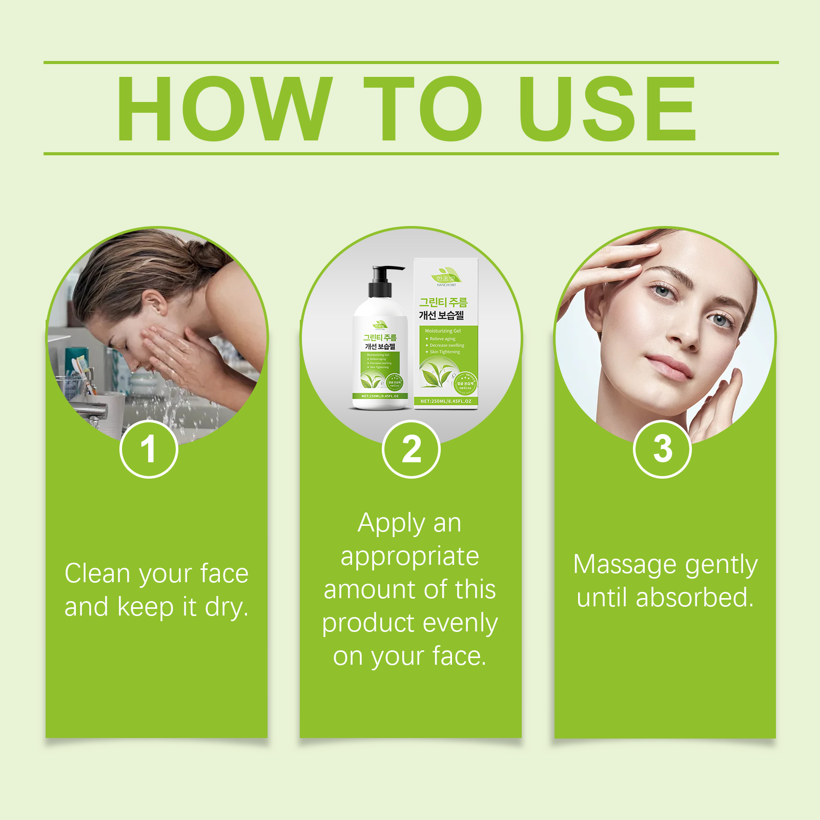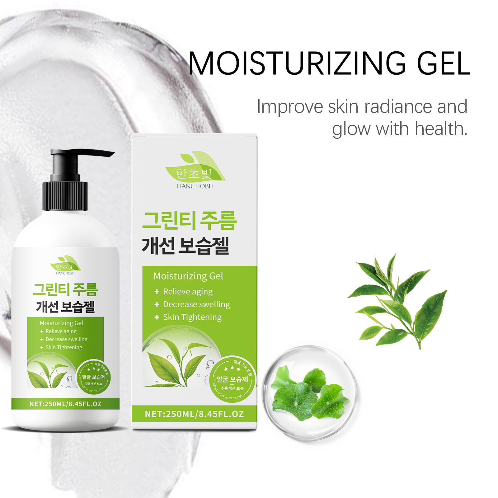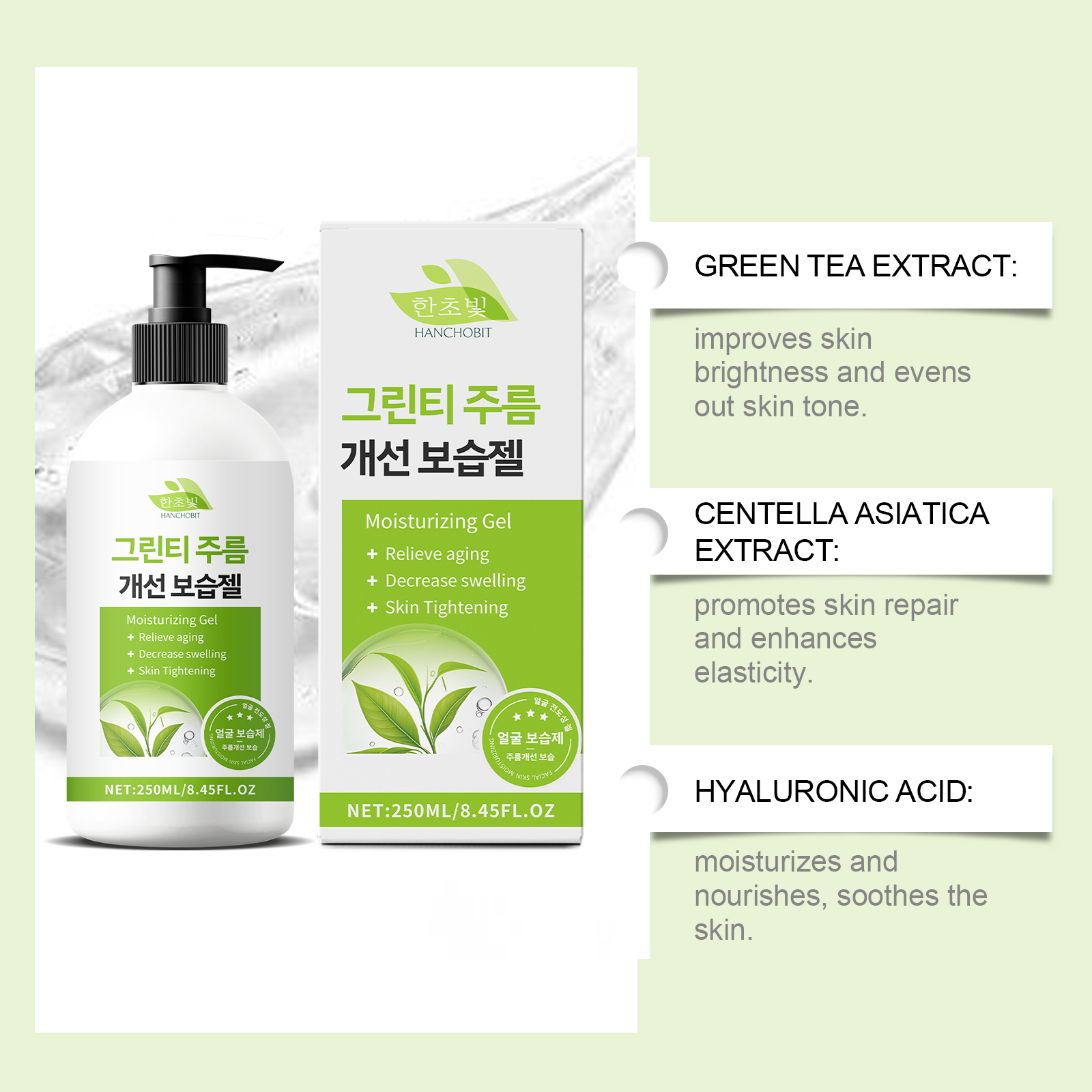 我们的绿茶紧致凝胶含有绿茶提取物、积雪草提取物、透明质酸。它可以减少细纹,展现年轻肌肤。它的使用方法很简单:清洁你的脸并保持干燥。取适量本品均匀涂抹于面部。轻轻按摩直至吸收。并且可以保湿并保持皮肤水分。