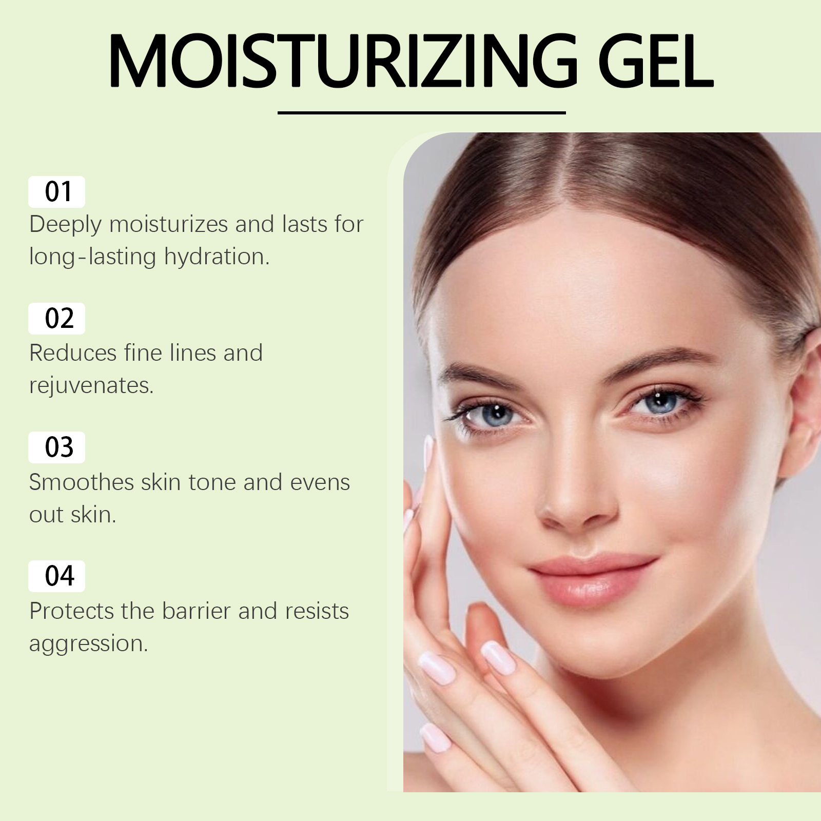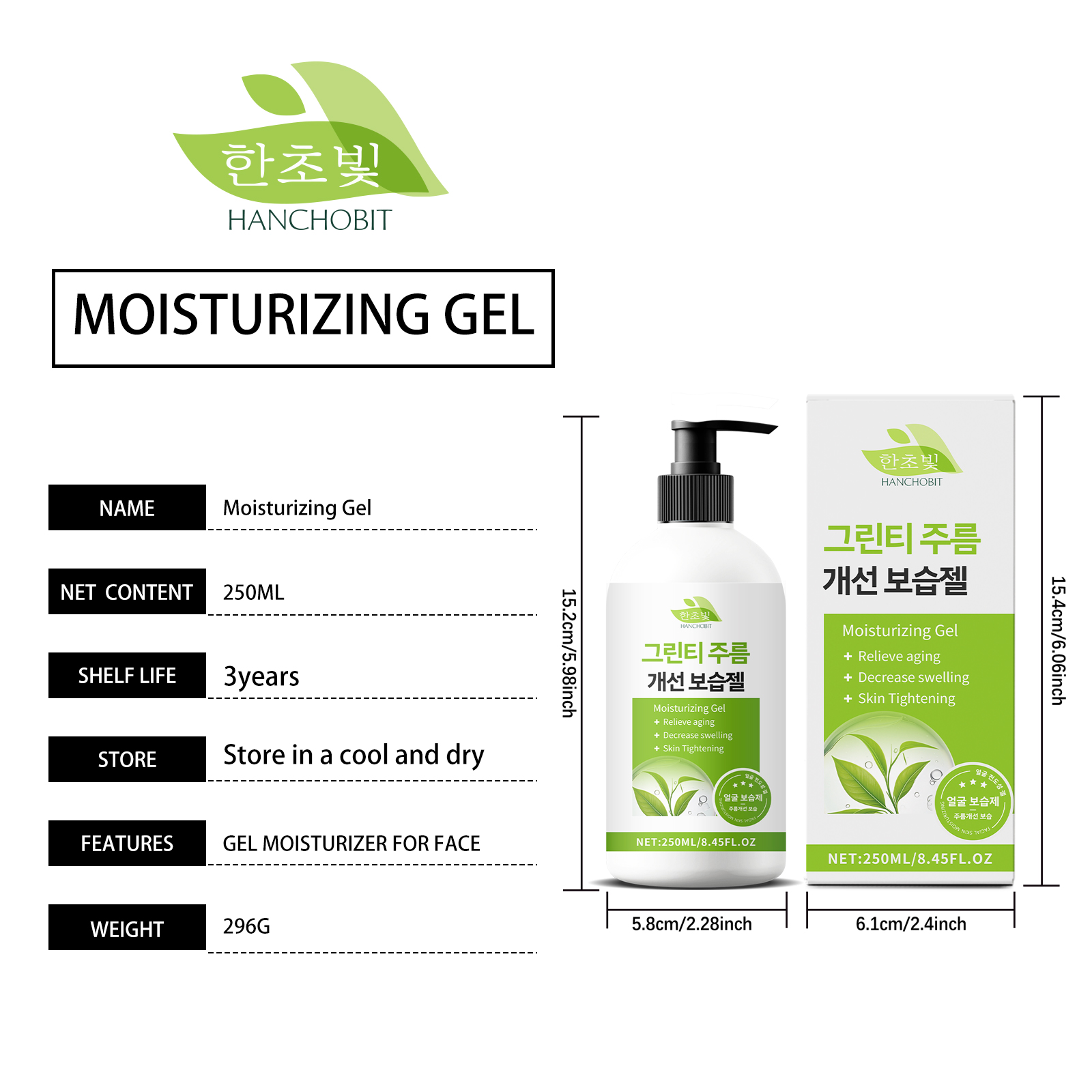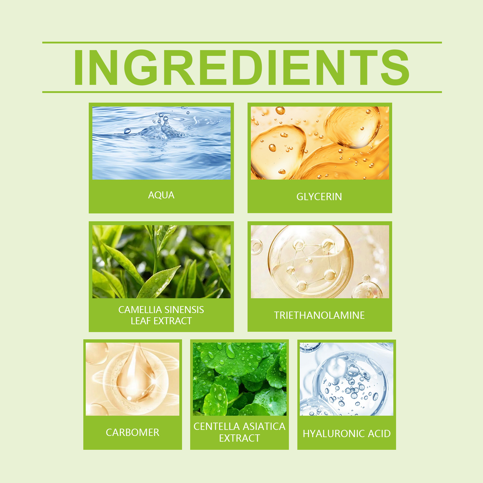 我们的绿茶紧致凝胶含有绿茶提取物、积雪草提取物、透明质酸。它可以减少细纹,展现年轻肌肤。它的使用方法很简单:清洁你的脸并保持干燥。取适量本品均匀涂抹于面部。轻轻按摩直至吸收。并且可以保湿并保持皮肤水分。