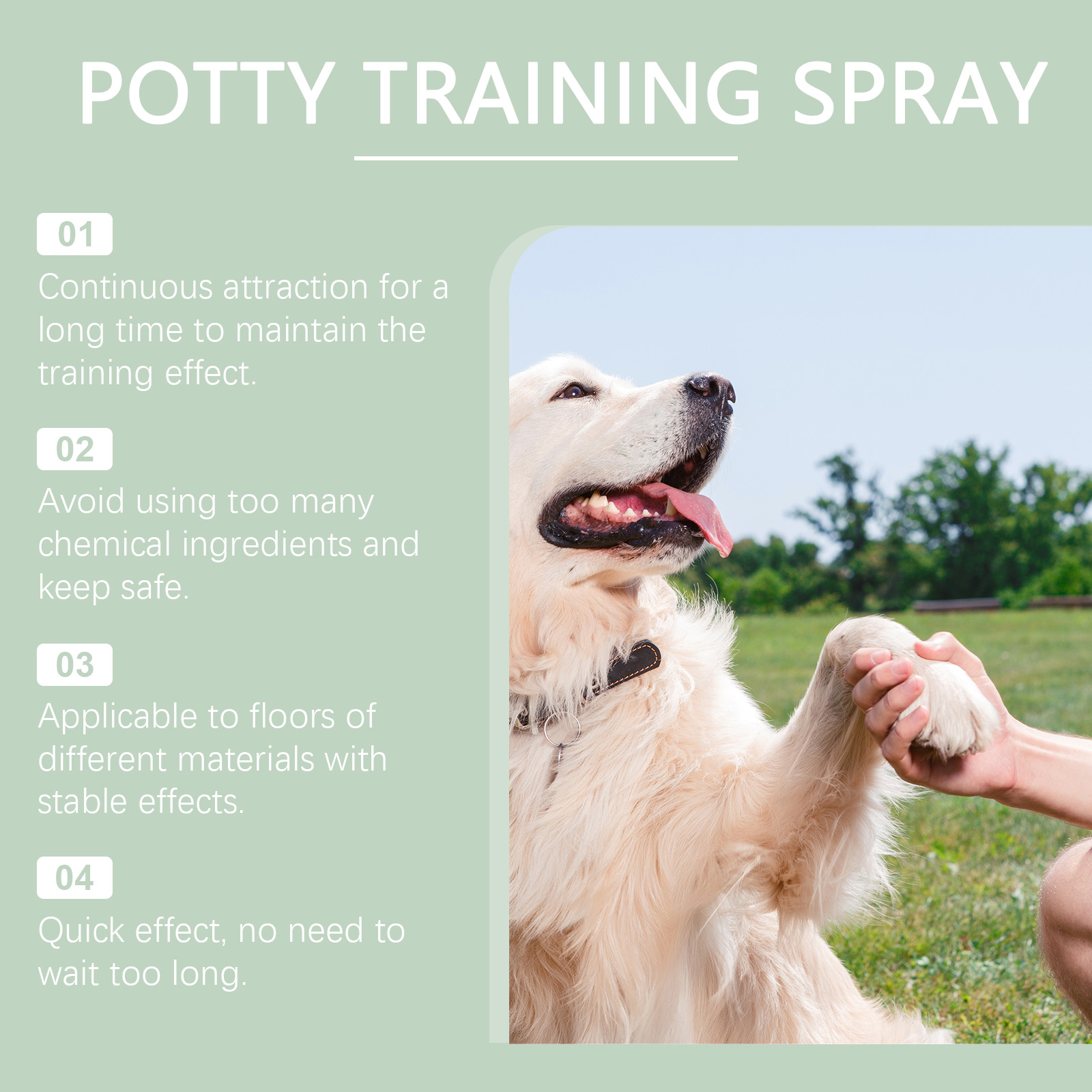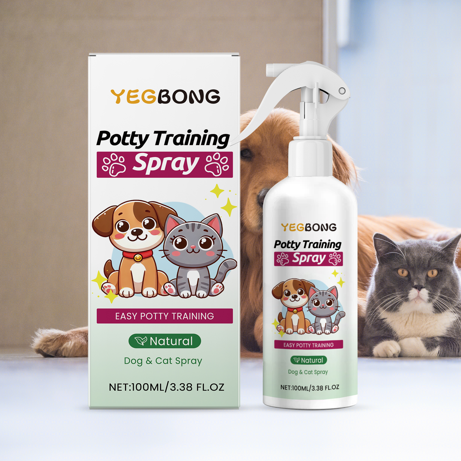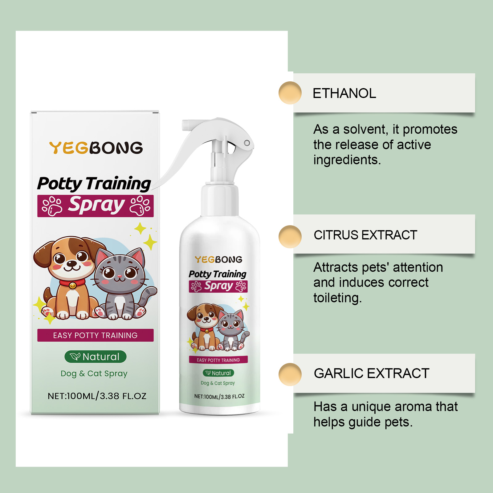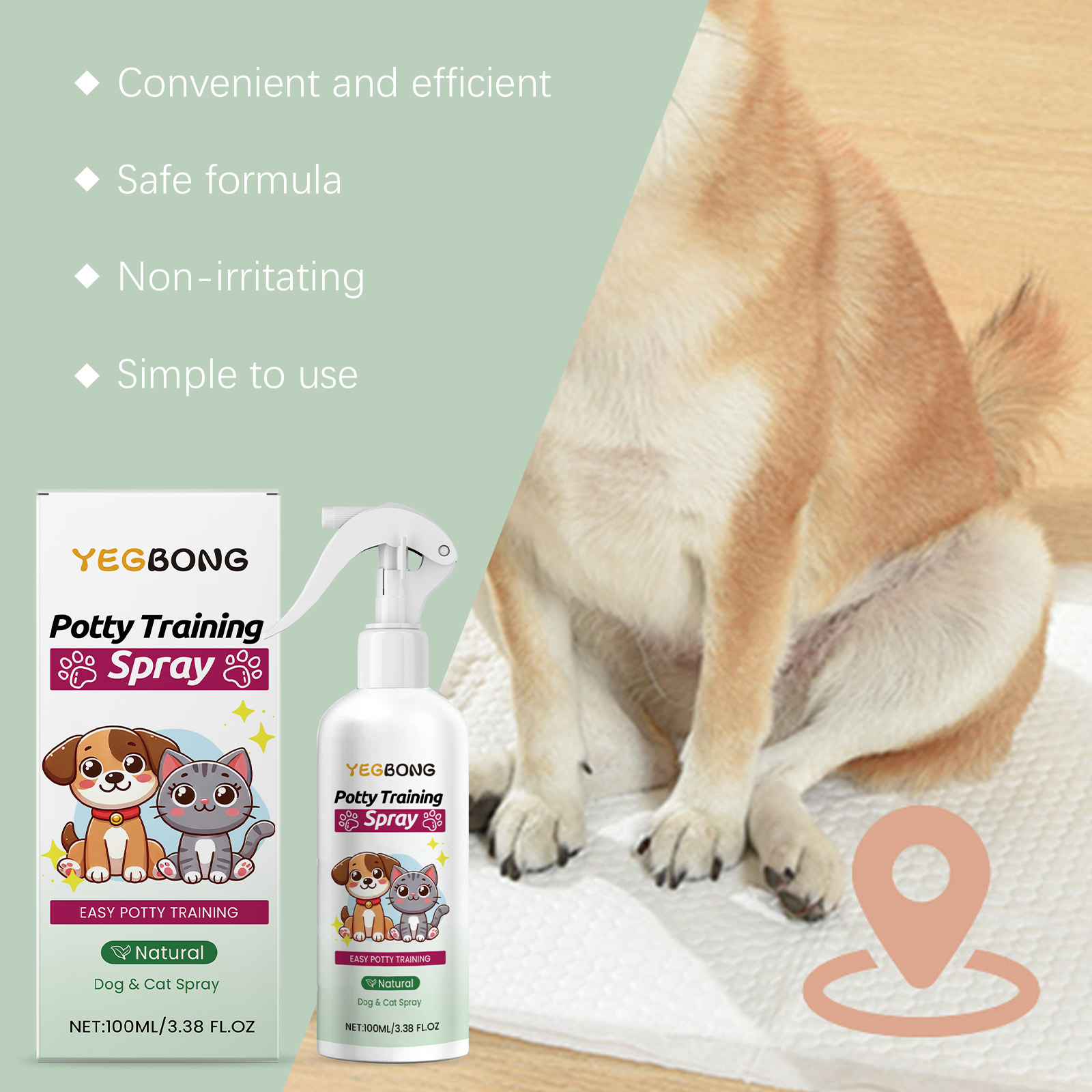 我们的宠物如厕训练喷雾含有去离子水、水蛋白质。它可以帮助宠物养成良好的用厕习惯。不含刺激性成分,宠物使用舒适。它的使用方法很简单:使用前,轻轻摇晃喷雾瓶。在您的猫或狗排便前,将产品喷在固定位置,让宠物嗅一嗅。宠物在你指定的区域排便后,用文字或零食奖励它,并随意重复。并且可以独特的配方迅速吸引宠物的注意力,有效引导排便,彻底告别随地便便,保持家居清洁。