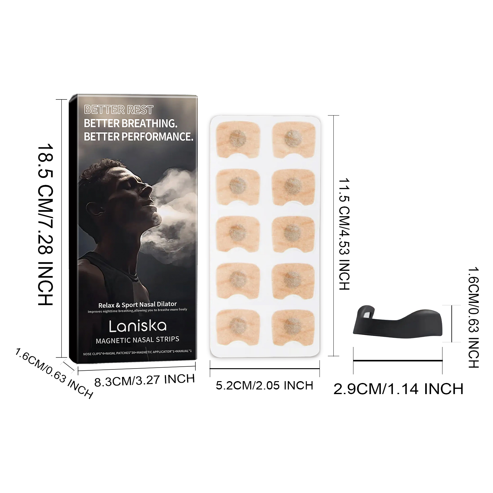 我们的止鼾鼻部护理器套装含有甘油、羟乙基纤维素。它可以有效地打开鼻腔通道,提高呼吸效率。它的使用方法很简单:1.彻底清洁并干燥鼻部区域的皮肤。2.使用磁吸器吸住鼻腔贴片,撕掉鼻腔贴片背面的保护膜,将鼻腔贴片贴在鼻子的一个侧面上,按压并抚平鼻腔贴片,然后在另一侧重复上述操作。3.最后,用鼻夹夹住贴片,将其固定在鼻子上。并且可以显著减少打鼾,提高睡眠质量。