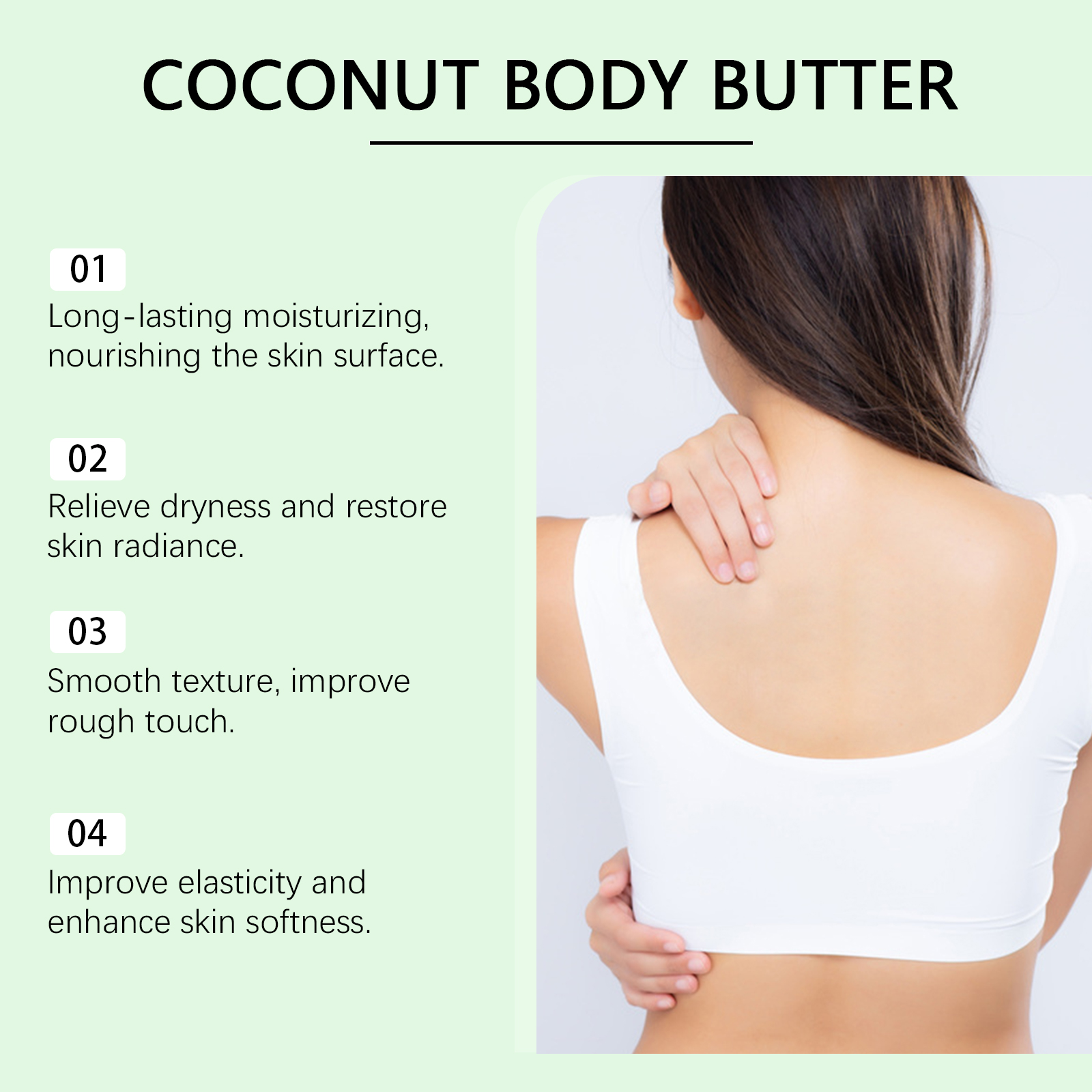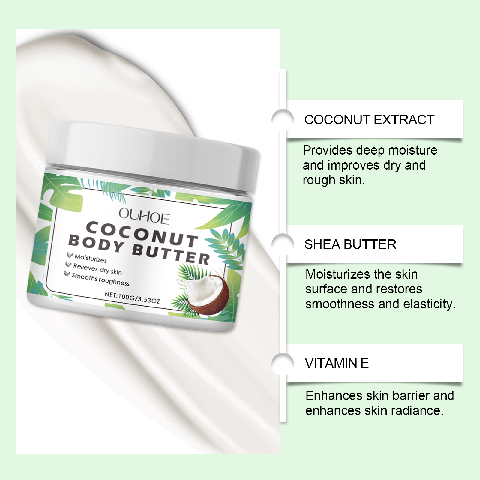 我们的椰子滋养身体乳含有甘油、矿油。它可以滋润肌肤表面,有效缓解肌肤干燥引起的不适。质地轻盈光滑,易于涂抹和快速吸收,适合日常护理。它的使用方法很简单:清洁身体并保持干燥。取适量本品均匀涂抹于身体上。轻轻按摩直到吸收。并且可以提供持久的保湿效果,帮助肌肤保持柔软和水润。