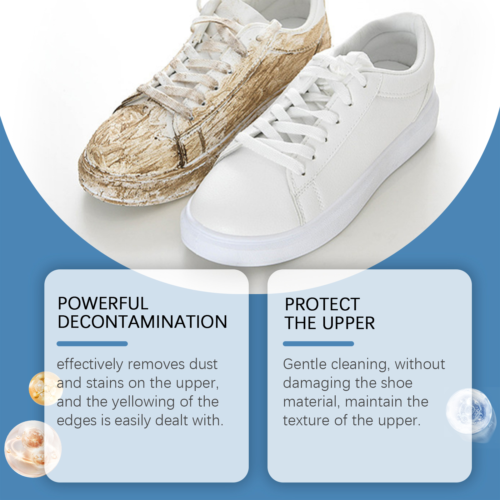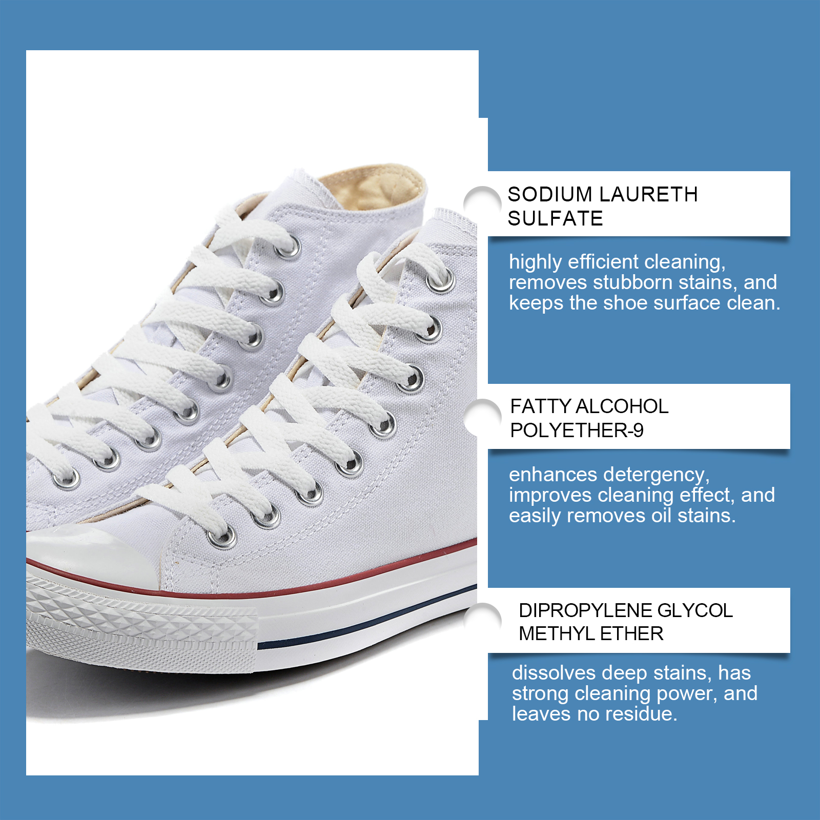 我们的白鞋清洁剂含有二丙二醇甲醚、脂肪醇聚醚-3、葡萄糖酸钠。它可以有效去除上面的灰尘和污渍,边缘的黄变易于处理。它的使用方法很简单:涂抹适量的洗涤剂,使泡沫均匀地覆盖鞋面。用柔软的刷子轻轻擦洗鞋面,使污渍完全溶解。用附着的毛巾擦拭鞋面,直到干净为止。并且轻柔清洁,不损伤鞋面材料,保持鞋面的质感。